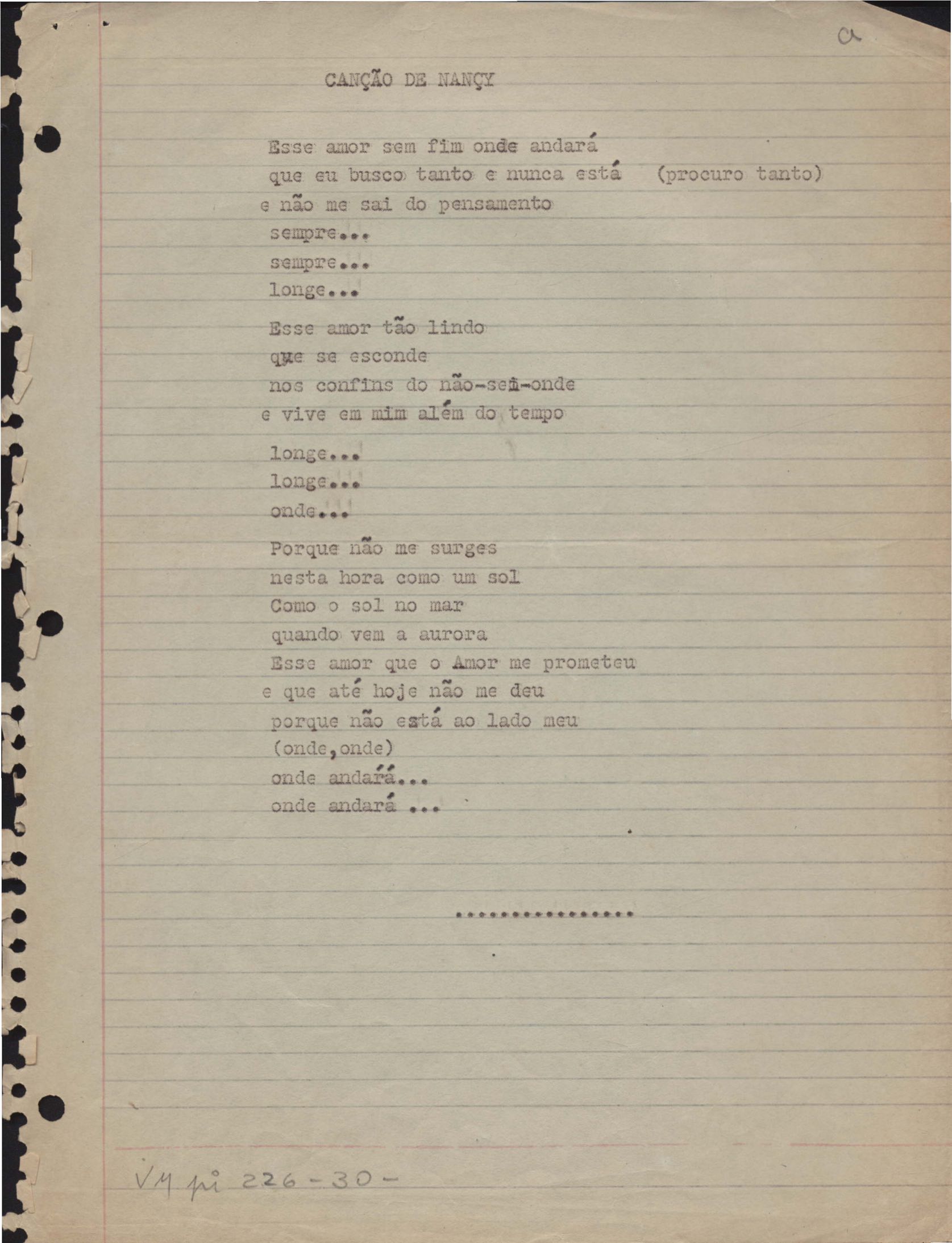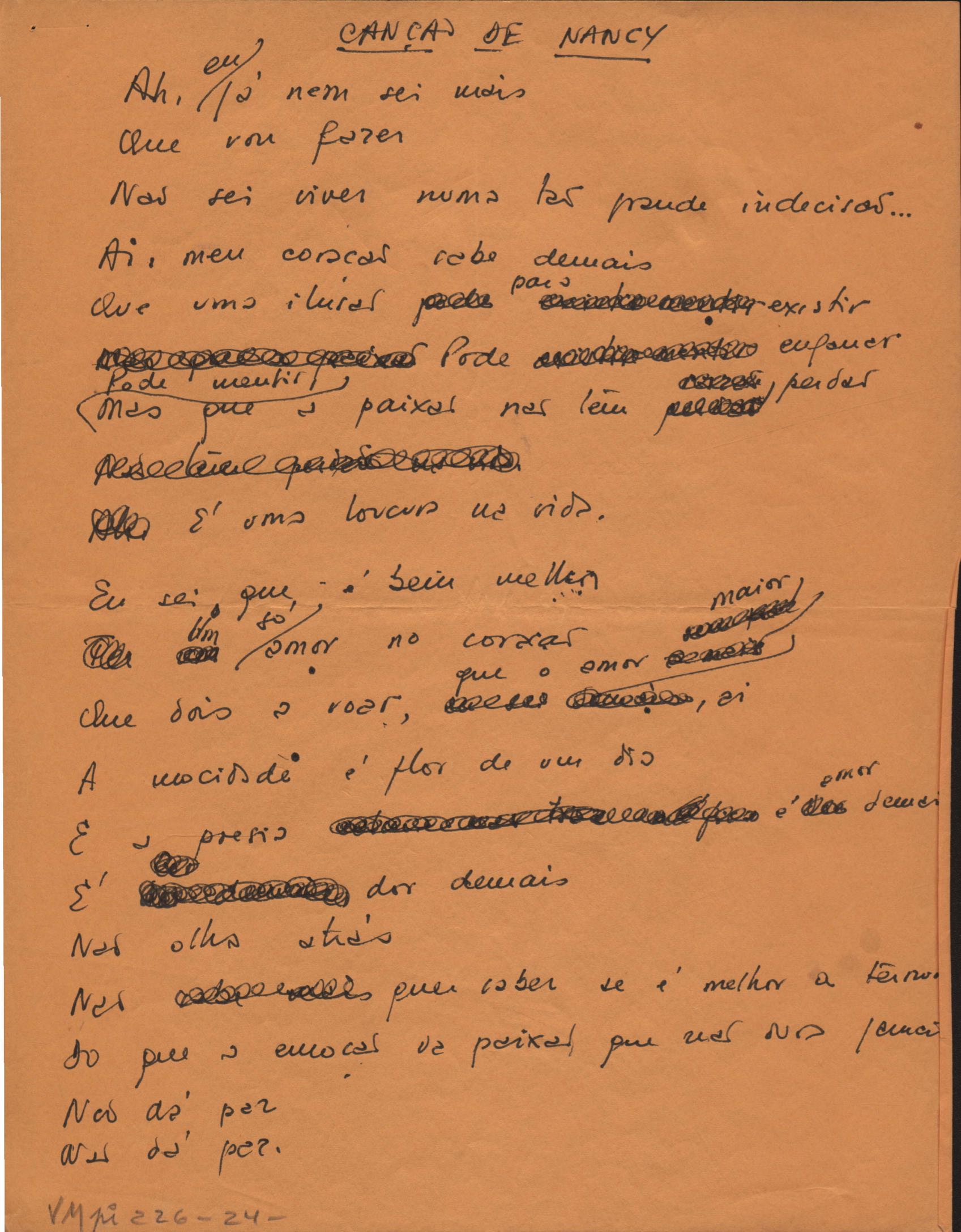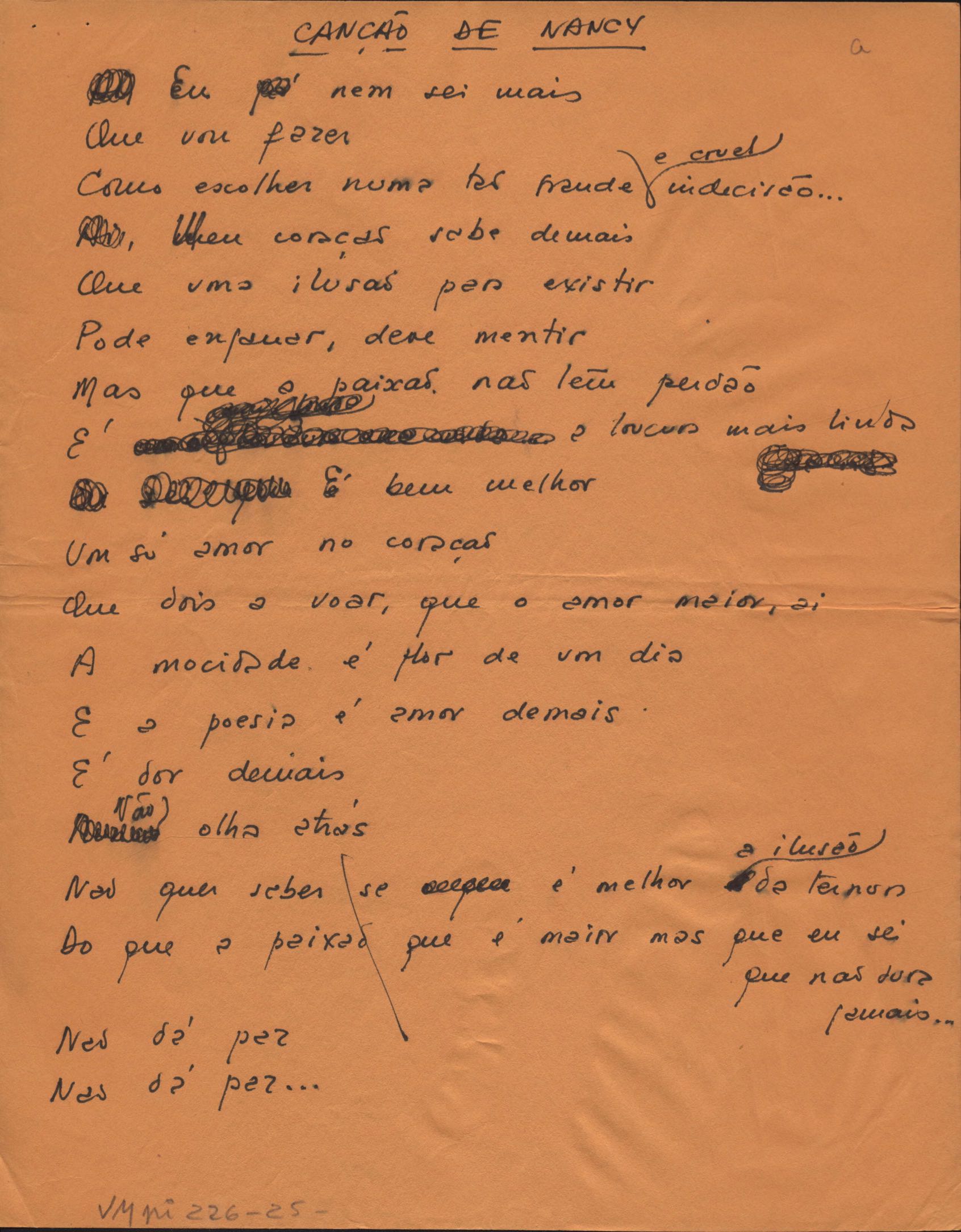 Este documento faz parte do dossiê VMPI226, que contempla um extenso conjunto de letras de música – algumas datadas entre 12 mar. 1966 e 31 maio 1976 –, além de 131 imagens de esboços/rascunhos sem títulos atribuídos (cf. registro VM0PI226_1_195). O dossiê se depara com um problema: a impossibilidade de identificação ou dedução de grande parte das datas. Mesmo que as letras não tenham sido musicalizadas ou publicadas como poemas, ressalva-se que estes originais não podem ser tomados como obra inédita. Ideias, tentativas, escritos inacabados, abandonados ou aproveitados posteriormente com outra forma compõem o dossiê.