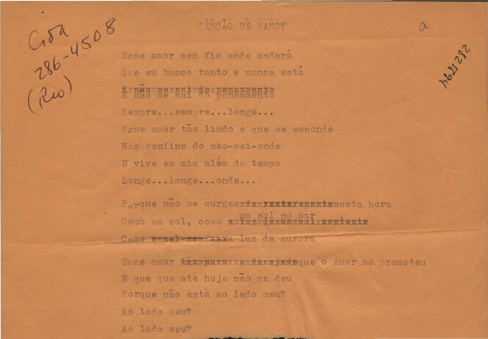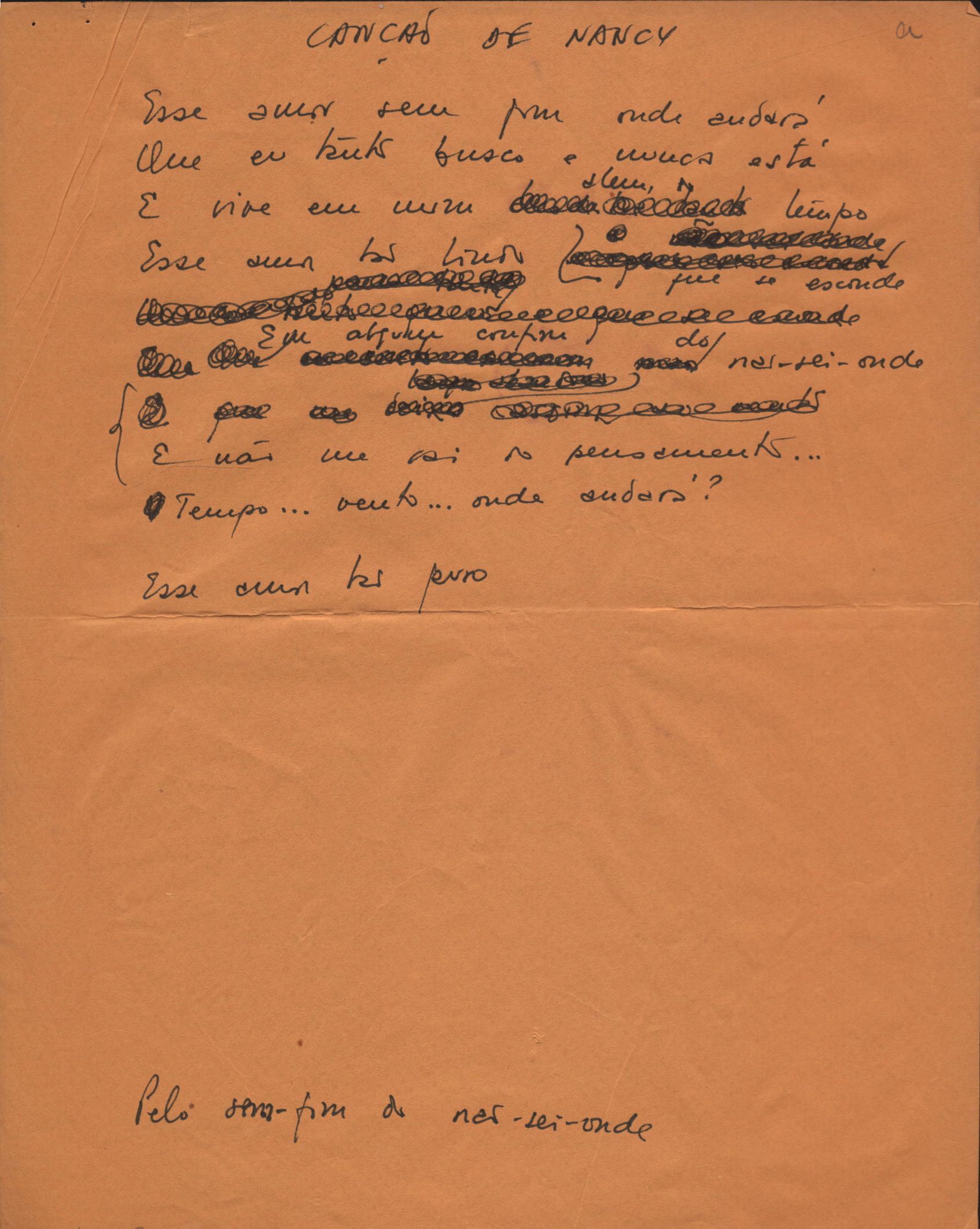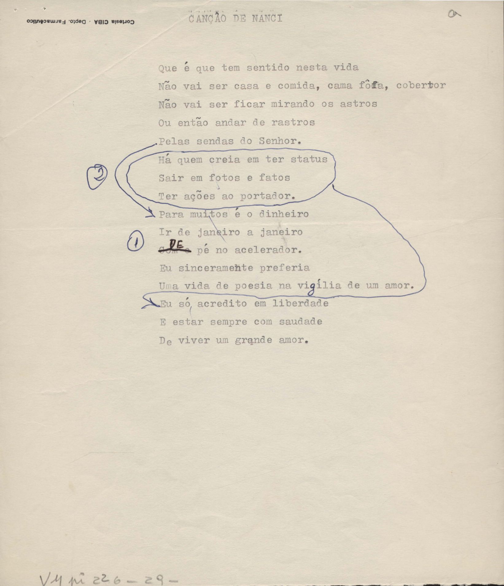 Este documento faz parte do dossiê VMPI226, que contempla um extenso conjunto de letras de música – algumas datadas entre 12 mar. 1966 e 31 maio 1976 –, além de 131 imagens de esboços/rascunhos sem títulos atribuídos (cf. registro VM0PI226_1_195). O dossiê se depara com um problema: a impossibilidade de identificação ou dedução de grande parte das datas. Mesmo que as letras não tenham sido musicalizadas ou publicadas como poemas, ressalva-se que estes originais não podem ser tomados como obra inédita. Ideias, tentativas, escritos inacabados, abandonados ou aproveitados posteriormente com outra forma compõem o dossiê.