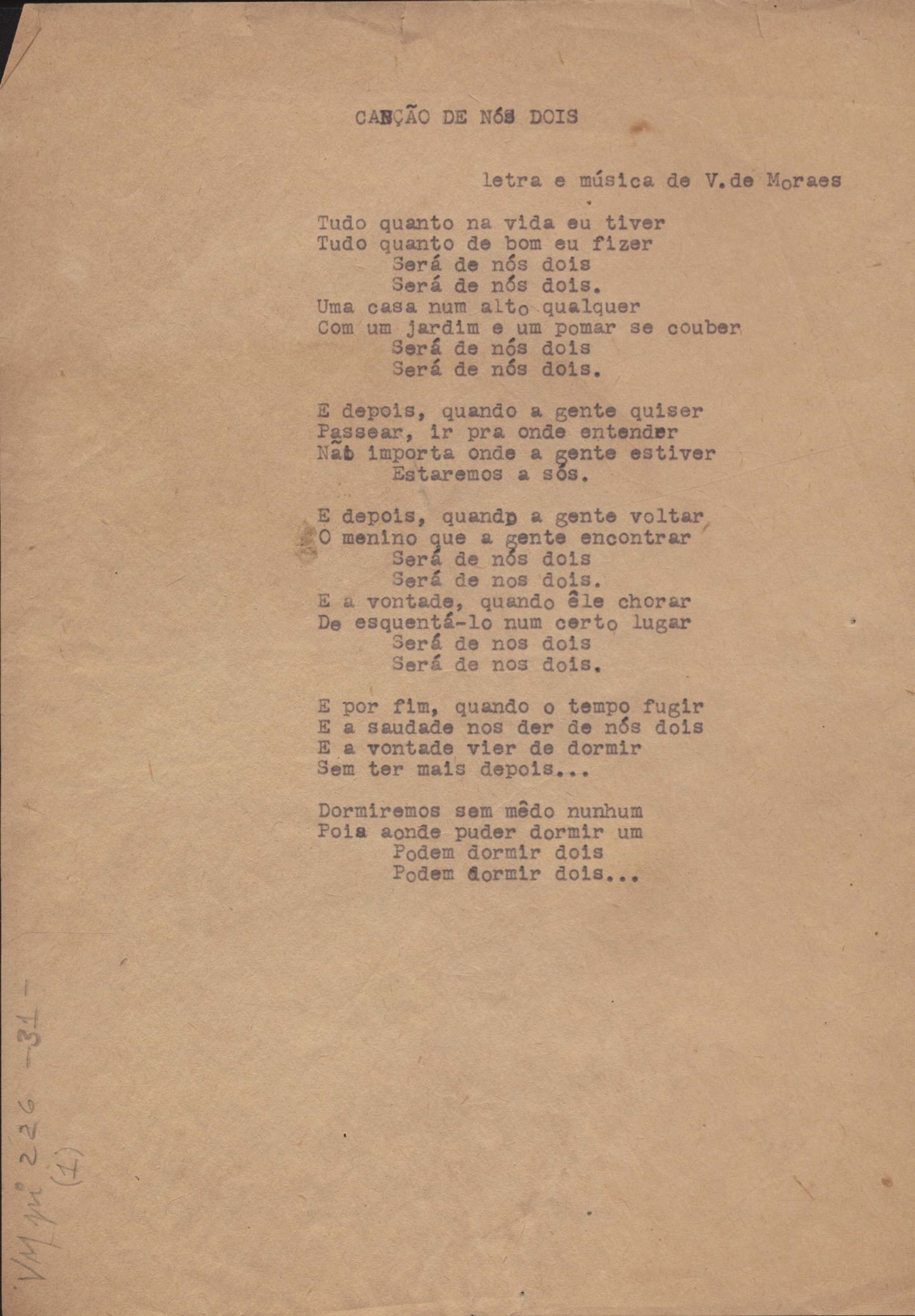 Este documento faz parte do dossiê VMPI226, que contempla um extenso conjunto de letras de música – algumas datadas entre 12 mar. 1966 e 31 maio 1976 –, além de 131 imagens de esboços/rascunhos sem títulos atribuídos (cf. registro VM0PI226_1_195). O dossiê se depara com um problema: a impossibilidade de identificação ou dedução de grande parte das datas. Mesmo que as letras não tenham sido musicalizadas ou publicadas como poemas, ressalva-se que estes originais não podem ser tomados como obra inédita. Ideias, tentativas, escritos inacabados, abandonados ou aproveitados posteriormente com outra forma compõem o dossiê.
