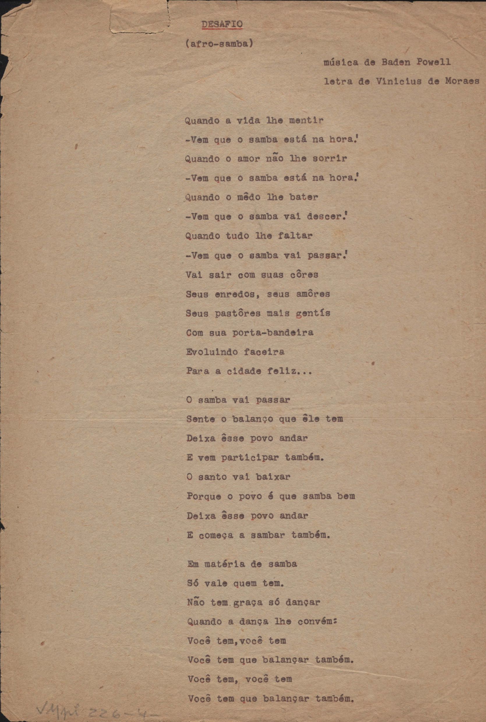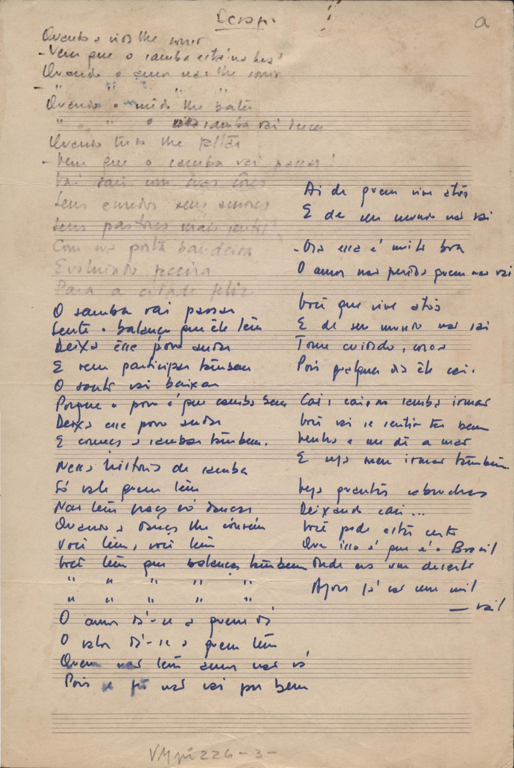 Este documento faz parte do dossiê VMPI226, que contempla um extenso conjunto de letras de música – algumas datadas entre 12 mar. 1966 e 31 maio 1976 –, além de 131 imagens de esboços/rascunhos sem títulos atribuídos (cf. registro VM0PI226_1_195). O dossiê se depara com um problema: a impossibilidade de identificação ou dedução de grande parte das datas. Mesmo que as letras não tenham sido musicalizadas ou publicadas como poemas, ressalva-se que estes originais não podem ser tomados como obra inédita. Ideias, tentativas, escritos inacabados, abandonados ou aproveitados posteriormente com outra forma compõem o dossiê.
