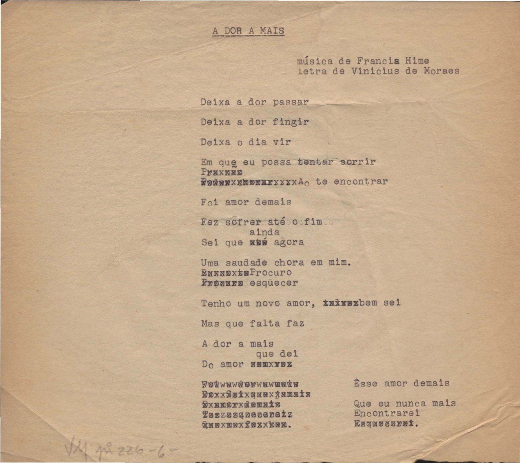 Este documento faz parte do dossiê VMPI226, que contempla um extenso conjunto de letras de música – algumas datadas entre 12 mar. 1966 e 31 maio 1976 –, além de 131 imagens de esboços/rascunhos sem títulos atribuídos (cf. registro VM0PI226_1_195). O dossiê se depara com um problema: a impossibilidade de identificação ou dedução de grande parte das datas. Mesmo que as letras não tenham sido musicalizadas ou publicadas como poemas, ressalva-se que estes originais não podem ser tomados como obra inédita. Ideias, tentativas, escritos inacabados, abandonados ou aproveitados posteriormente com outra forma compõem o dossiê.