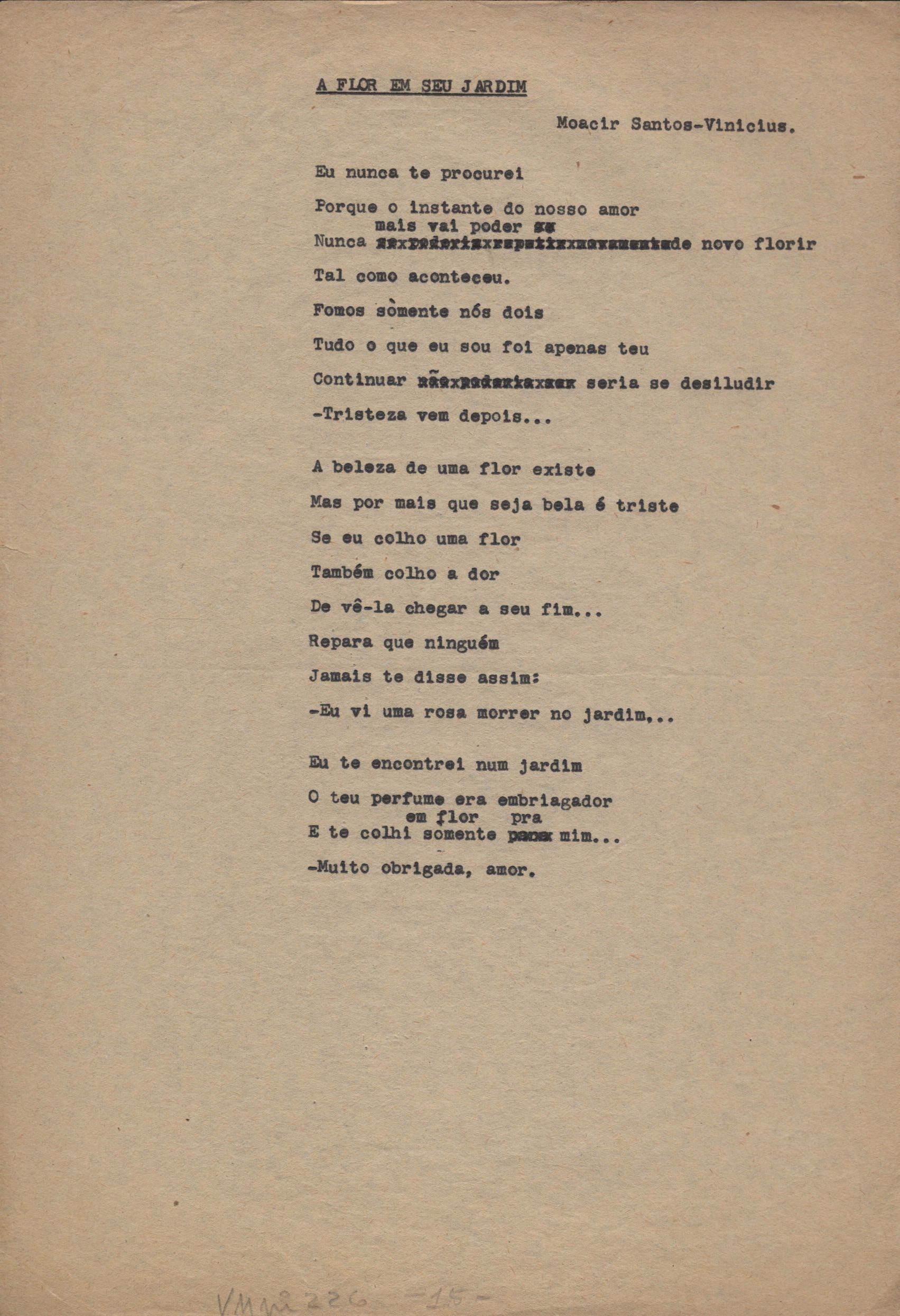 Este documento faz parte do dossiê VMPI226, que contempla um extenso conjunto de letras de música – algumas datadas entre 12 mar. 1966 e 31 maio 1976 –, além de 131 imagens de esboços/rascunhos sem títulos atribuídos (cf. registro VM0PI226_1_195). O dossiê se depara com um problema: a impossibilidade de identificação ou dedução de grande parte das datas. Mesmo que as letras não tenham sido musicalizadas ou publicadas como poemas, ressalva-se que estes originais não podem ser tomados como obra inédita. Ideias, tentativas, escritos inacabados, abandonados ou aproveitados posteriormente com outra forma compõem o dossiê.