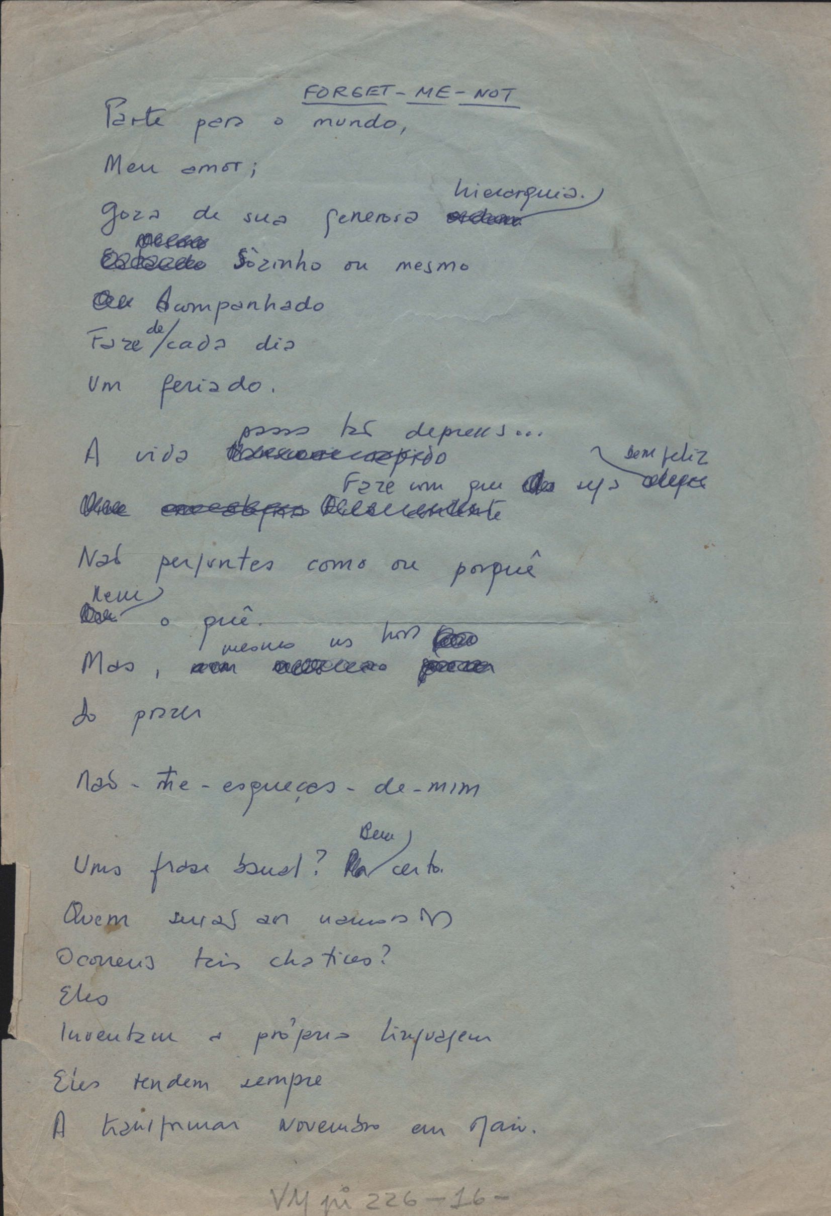 Este documento faz parte do dossiê VMPI226, que contempla um extenso conjunto de letras de música – algumas datadas entre 12 mar. 1966 e 31 maio 1976 –, além de 131 imagens de esboços/rascunhos sem títulos atribuídos (cf. registro VM0PI226_1_195). O dossiê se depara com um problema: a impossibilidade de identificação ou dedução de grande parte das datas. Mesmo que as letras não tenham sido musicalizadas ou publicadas como poemas, ressalva-se que estes originais não podem ser tomados como obra inédita. Ideias, tentativas, escritos inacabados, abandonados ou aproveitados posteriormente com outra forma compõem o dossiê.