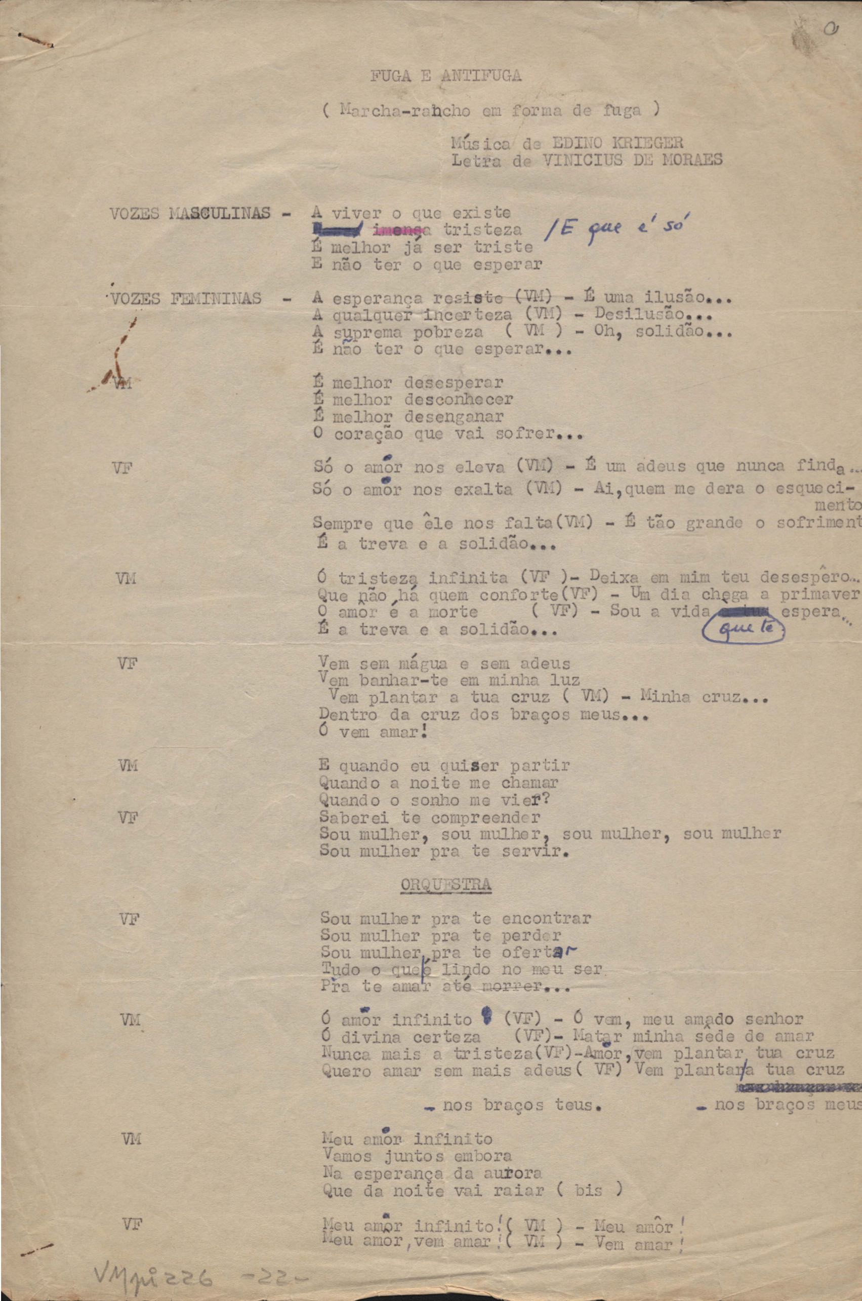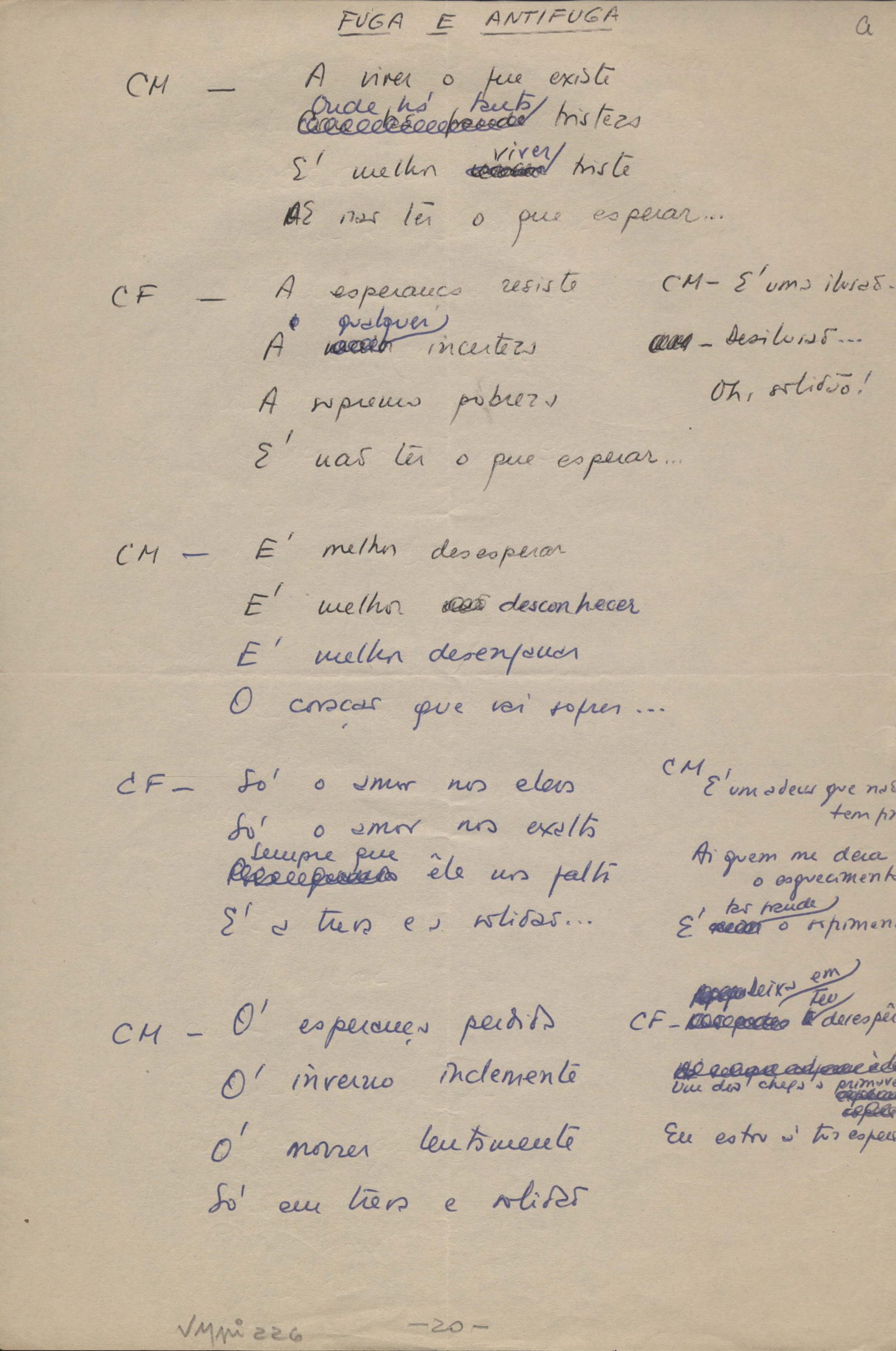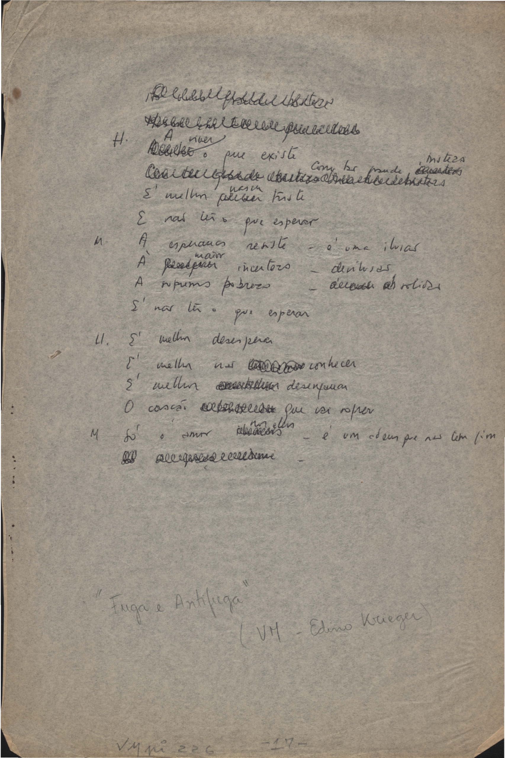 Este documento faz parte do dossiê VMPI226, que contempla um extenso conjunto de letras de música – algumas datadas entre 12 mar. 1966 e 31 maio 1976 –, além de 131 imagens de esboços/rascunhos sem títulos atribuídos (cf. registro VM0PI226_1_195). O dossiê se depara com um problema: a impossibilidade de identificação ou dedução de grande parte das datas. Mesmo que as letras não tenham sido musicalizadas ou publicadas como poemas, ressalva-se que estes originais não podem ser tomados como obra inédita. Ideias, tentativas, escritos inacabados, abandonados ou aproveitados posteriormente com outra forma compõem o dossiê.