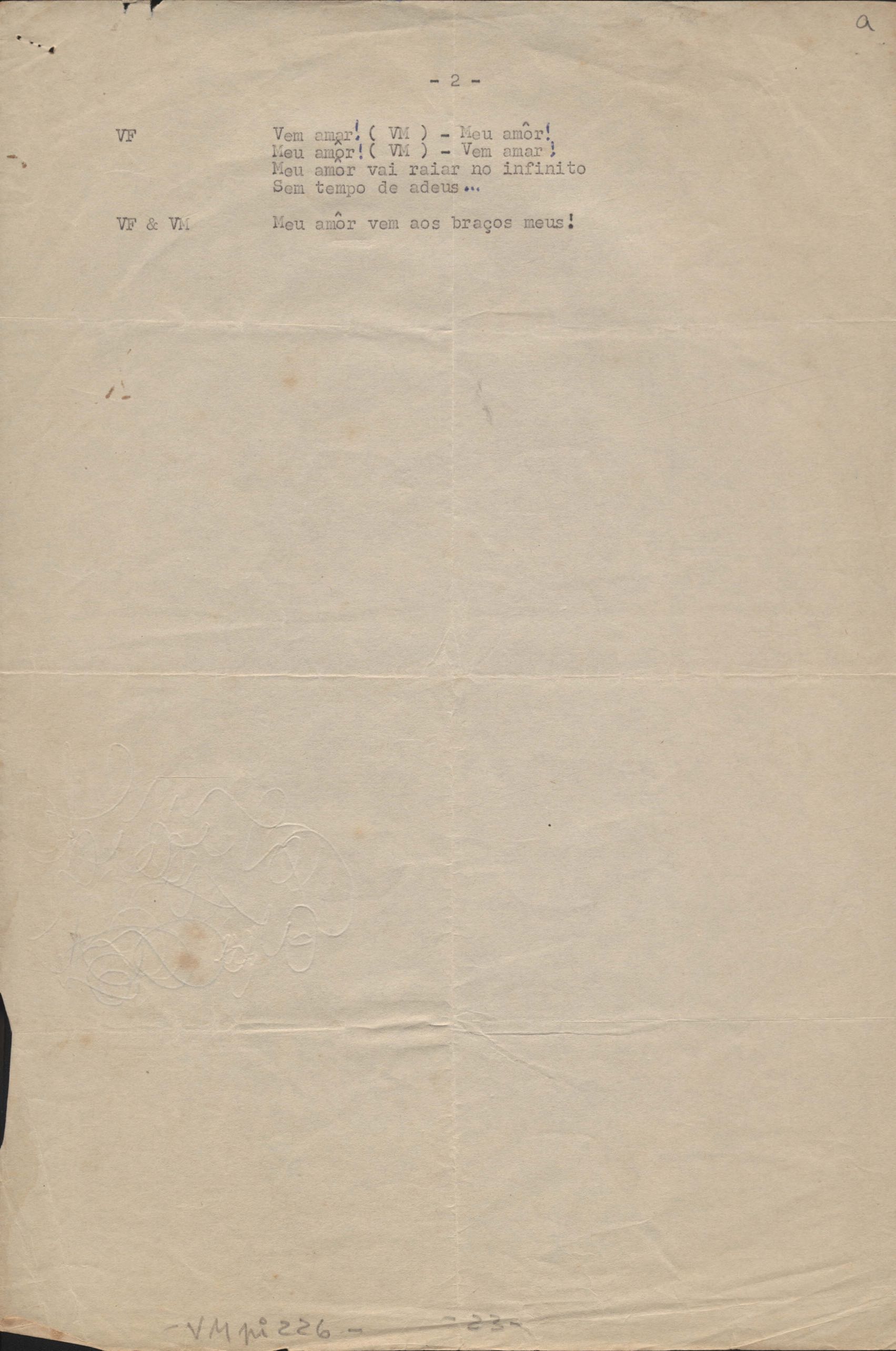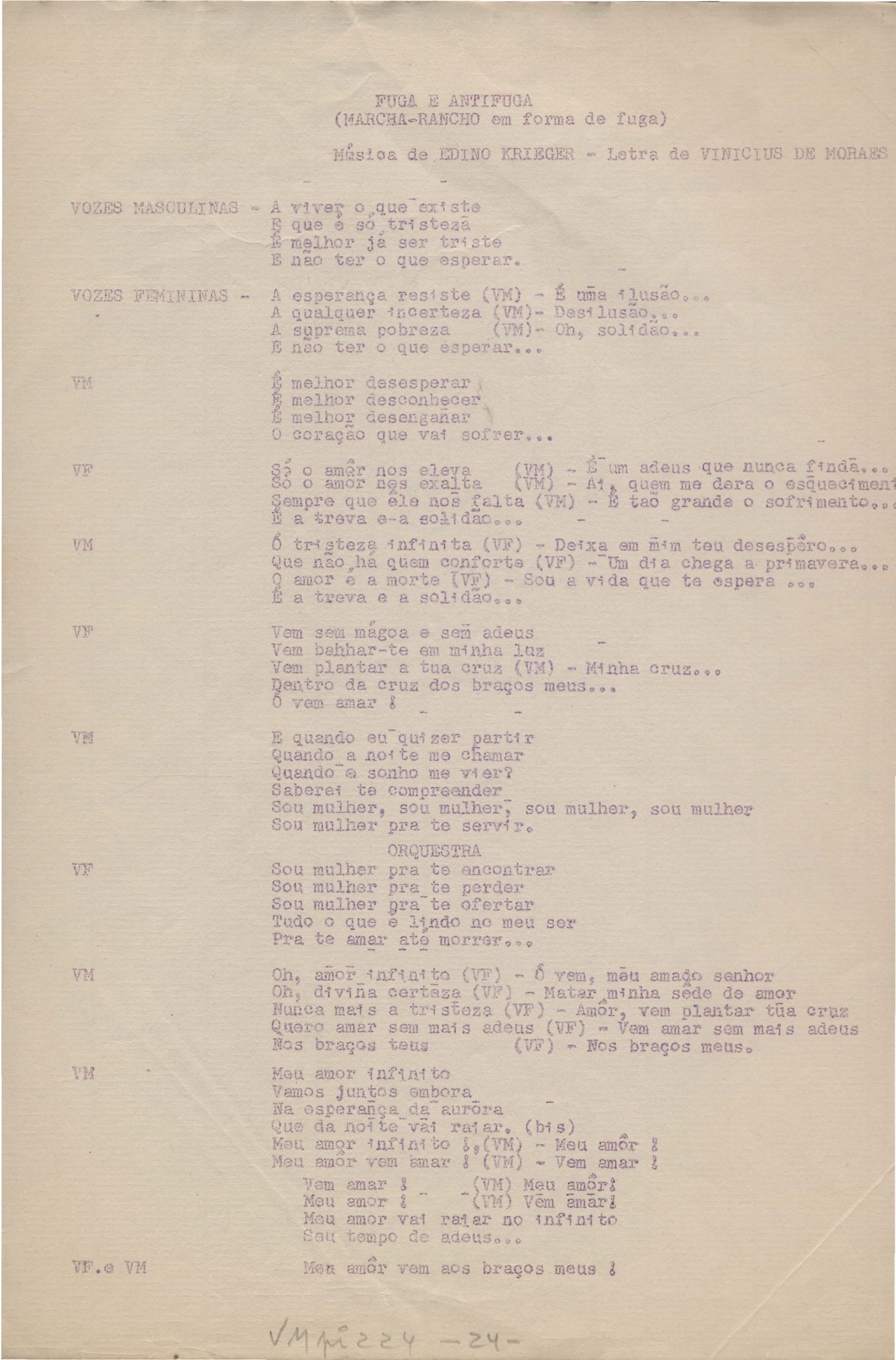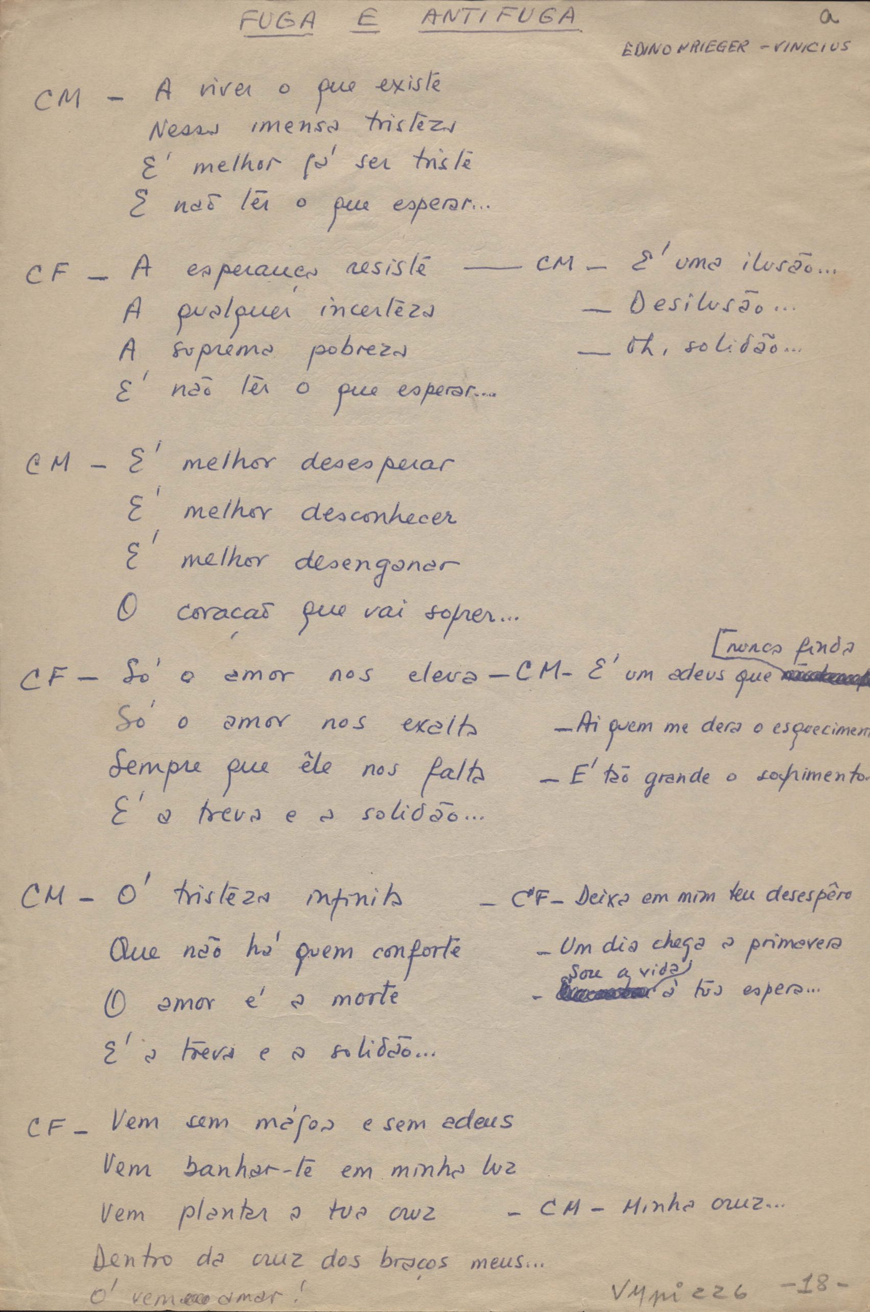 Este documento faz parte do dossiê VMPI226, que contempla um extenso conjunto de letras de música – algumas datadas entre 12 mar. 1966 e 31 maio 1976 –, além de 131 imagens de esboços/rascunhos sem títulos atribuídos (cf. registro VM0PI226_1_195). O dossiê se depara com um problema: a impossibilidade de identificação ou dedução de grande parte das datas. Mesmo que as letras não tenham sido musicalizadas ou publicadas como poemas, ressalva-se que estes originais não podem ser tomados como obra inédita. Ideias, tentativas, escritos inacabados, abandonados ou aproveitados posteriormente com outra forma compõem o dossiê.