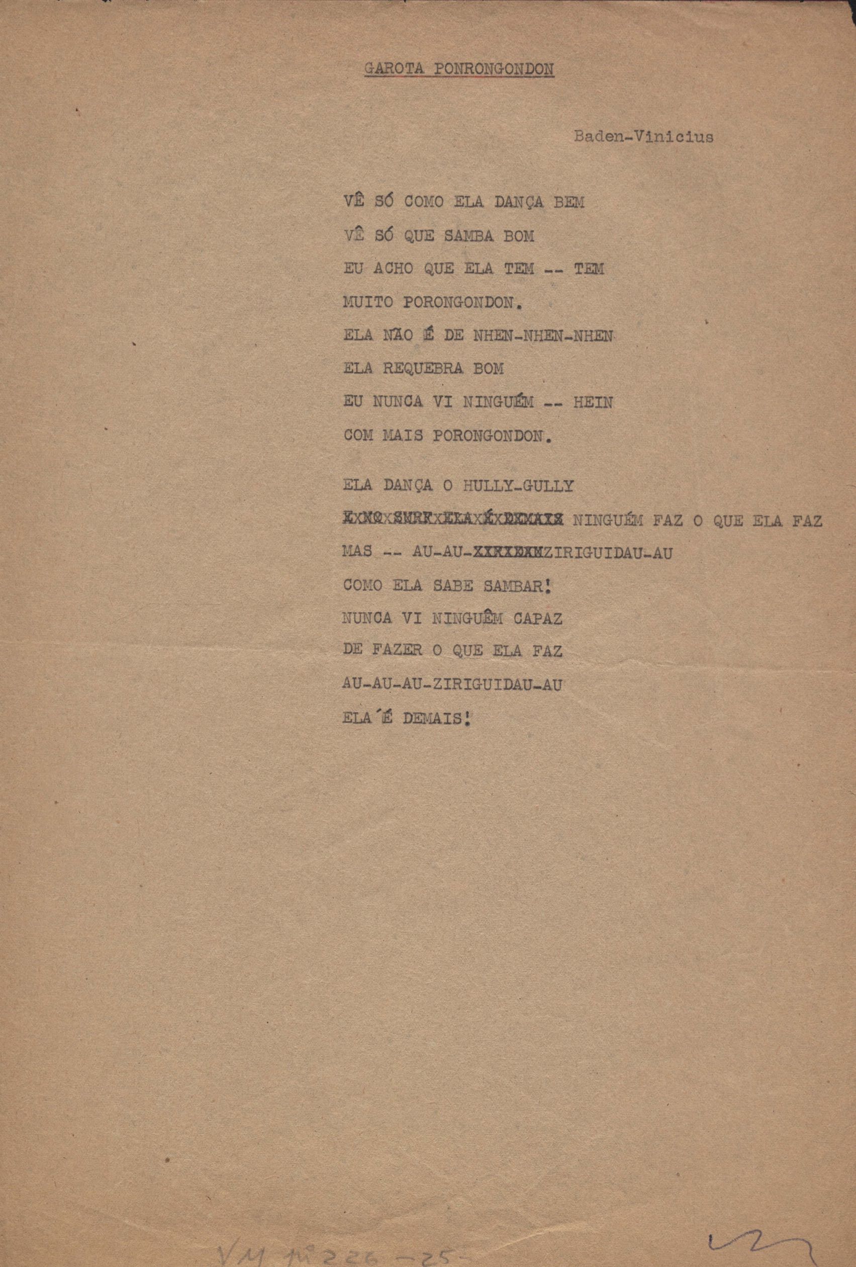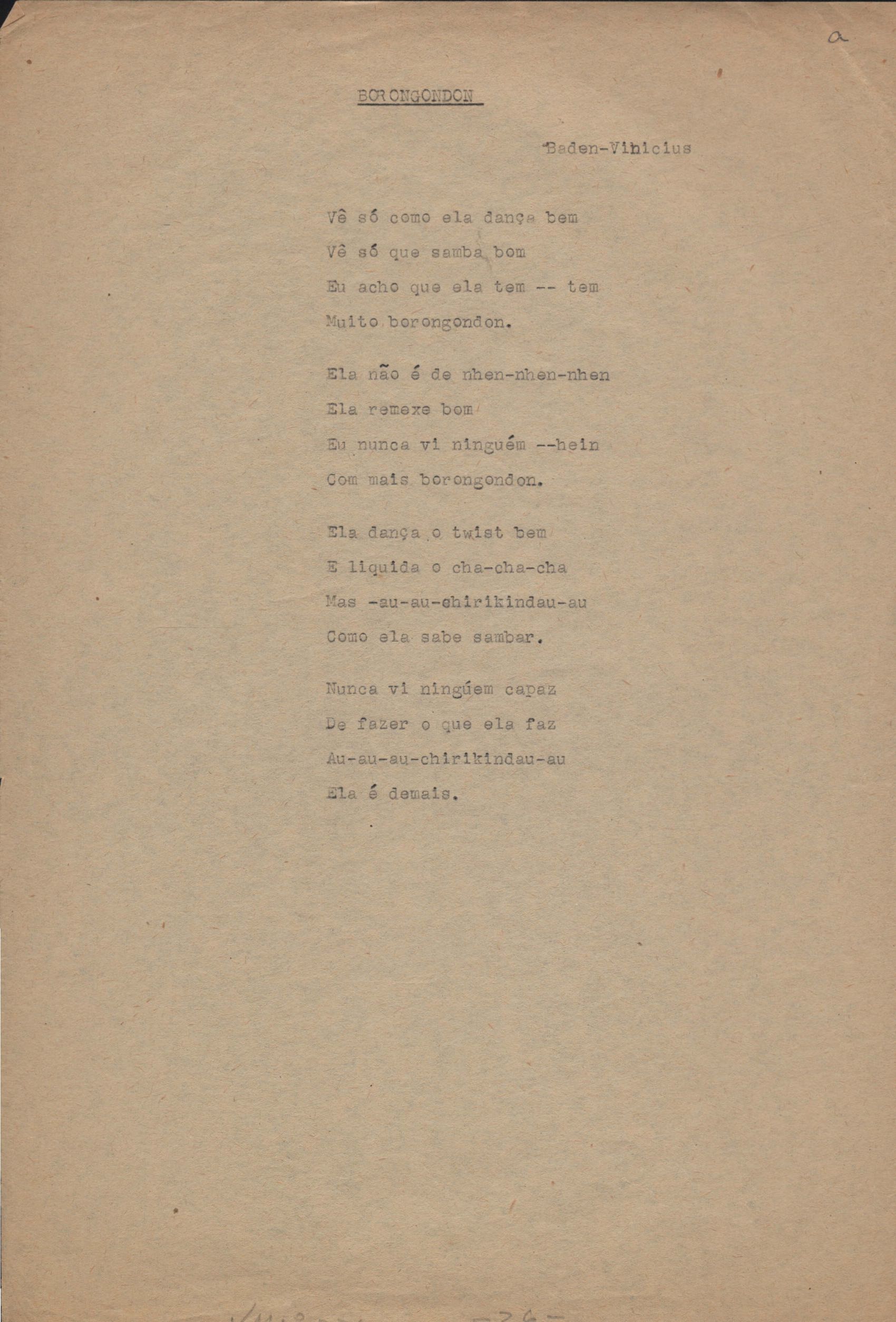 Este documento faz parte do dossiê VMPI226, que contempla um extenso conjunto de letras de música – algumas datadas entre 12 mar. 1966 e 31 maio 1976 –, além de 131 imagens de esboços/rascunhos sem títulos atribuídos (cf. registro VM0PI226_1_195). O dossiê se depara com um problema: a impossibilidade de identificação ou dedução de grande parte das datas. Mesmo que as letras não tenham sido musicalizadas ou publicadas como poemas, ressalva-se que estes originais não podem ser tomados como obra inédita. Ideias, tentativas, escritos inacabados, abandonados ou aproveitados posteriormente com outra forma compõem o dossiê.
