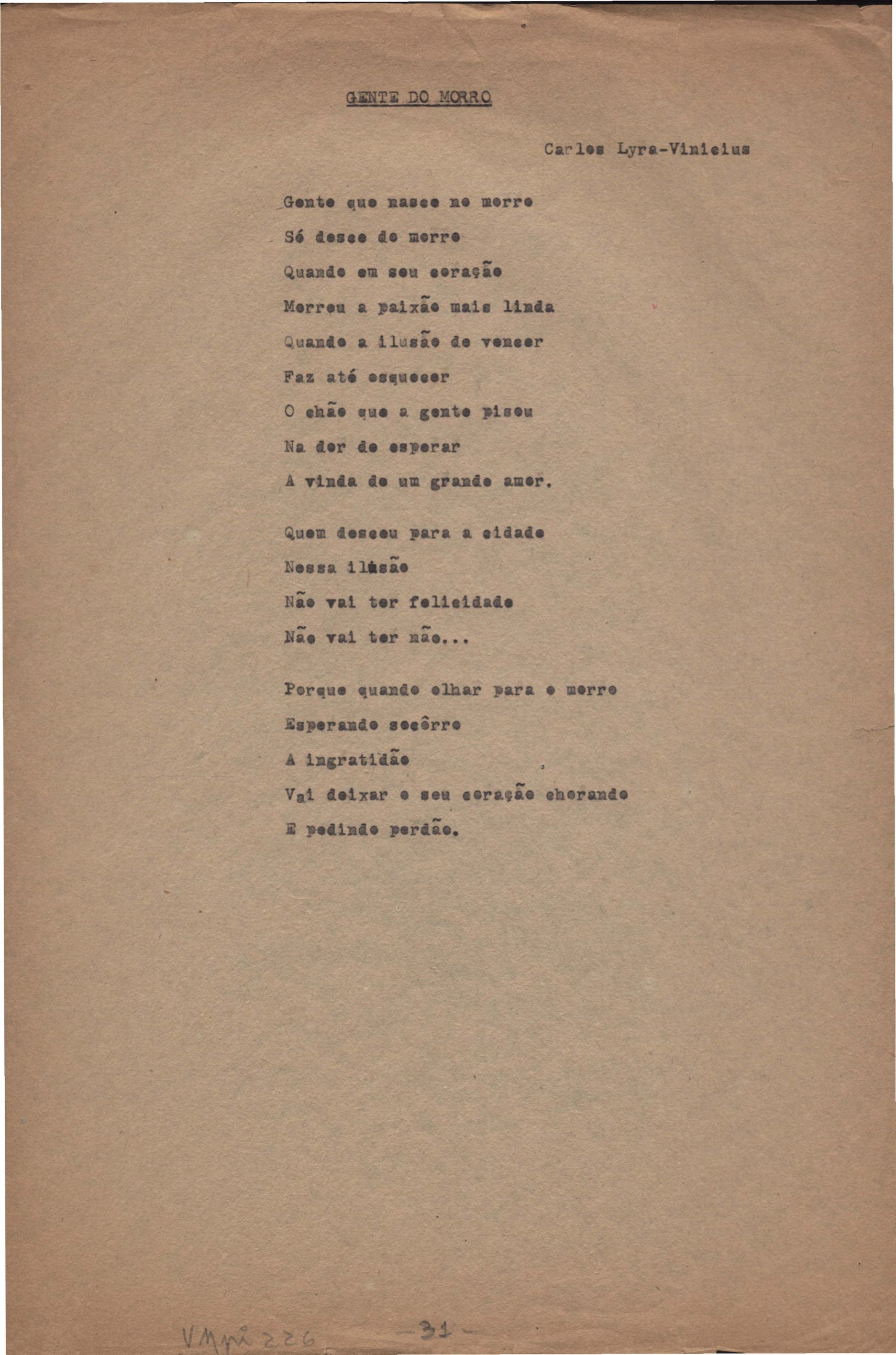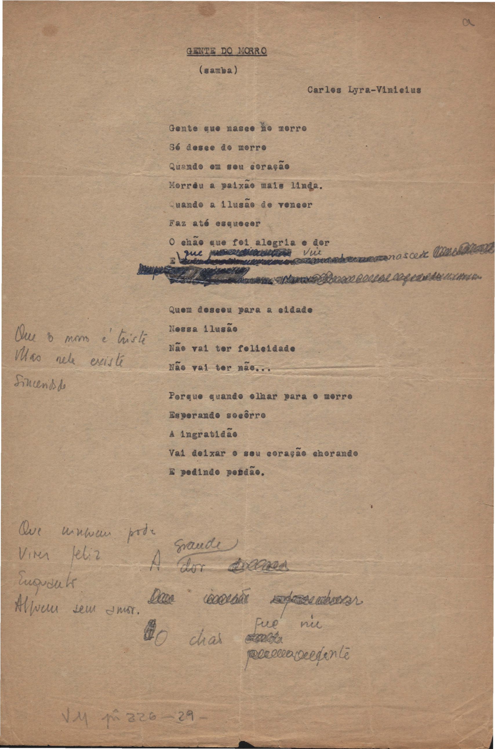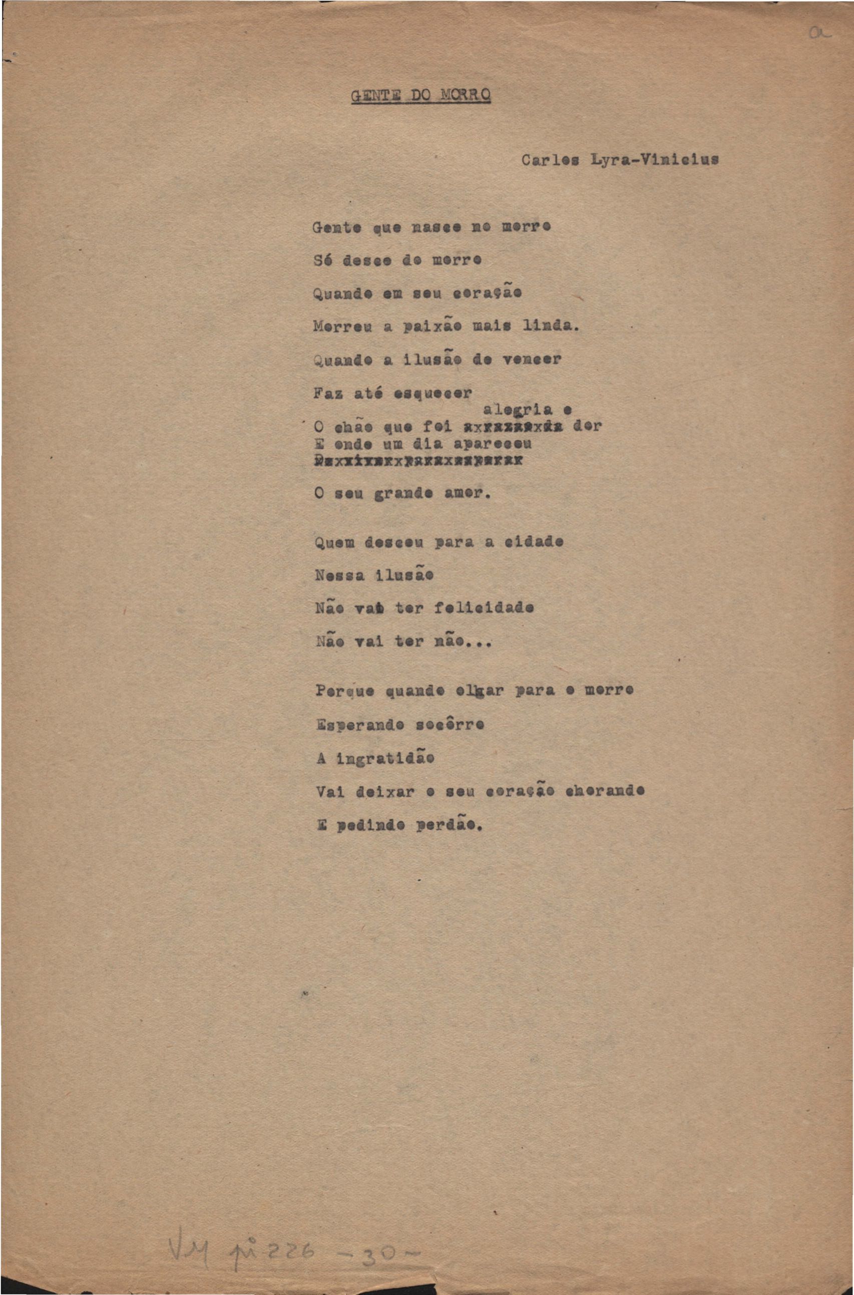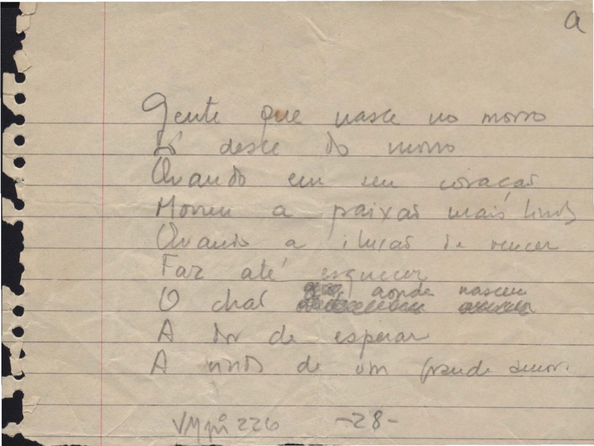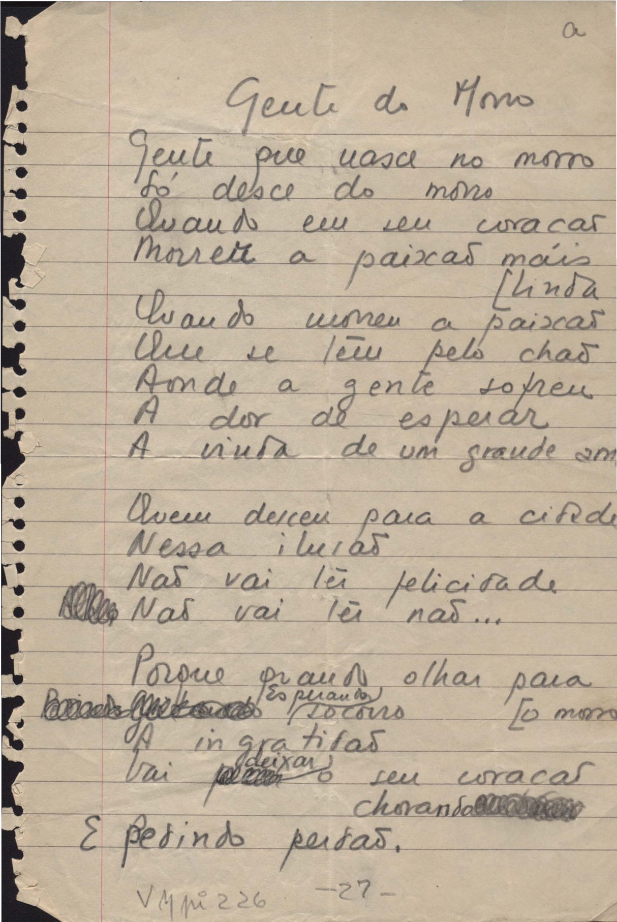 Este documento faz parte do dossiê VMPI226, que contempla um extenso conjunto de letras de música – algumas datadas entre 12 mar. 1966 e 31 maio 1976 –, além de 131 imagens de esboços/rascunhos sem títulos atribuídos (cf. registro VM0PI226_1_195). O dossiê se depara com um problema: a impossibilidade de identificação ou dedução de grande parte das datas. Mesmo que as letras não tenham sido musicalizadas ou publicadas como poemas, ressalva-se que estes originais não podem ser tomados como obra inédita. Ideias, tentativas, escritos inacabados, abandonados ou aproveitados posteriormente com outra forma compõem o dossiê.
