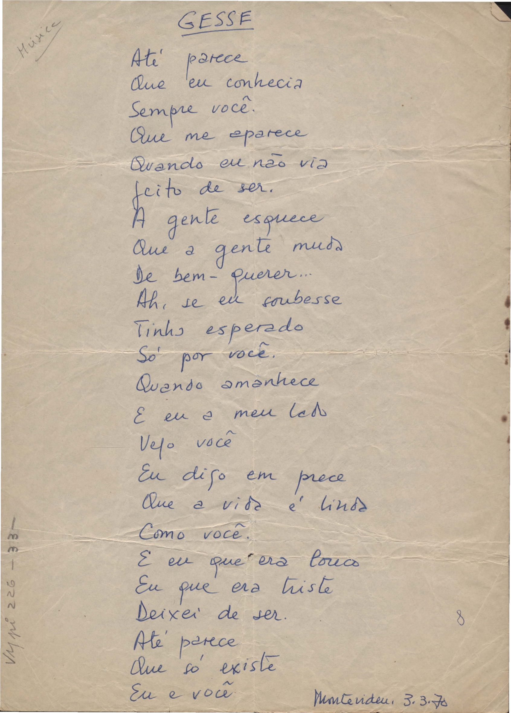 Este documento faz parte do dossiê VMPI226, que contempla um extenso conjunto de letras de música – algumas datadas entre 12 mar. 1966 e 31 maio 1976 –, além de 131 imagens de esboços/rascunhos sem títulos atribuídos (cf. registro VM0PI226_1_195). O dossiê se depara com um problema: a impossibilidade de identificação ou dedução de grande parte das datas. Mesmo que as letras não tenham sido musicalizadas ou publicadas como poemas, ressalva-se que estes originais não podem ser tomados como obra inédita. Ideias, tentativas, escritos inacabados, abandonados ou aproveitados posteriormente com outra forma compõem o dossiê.