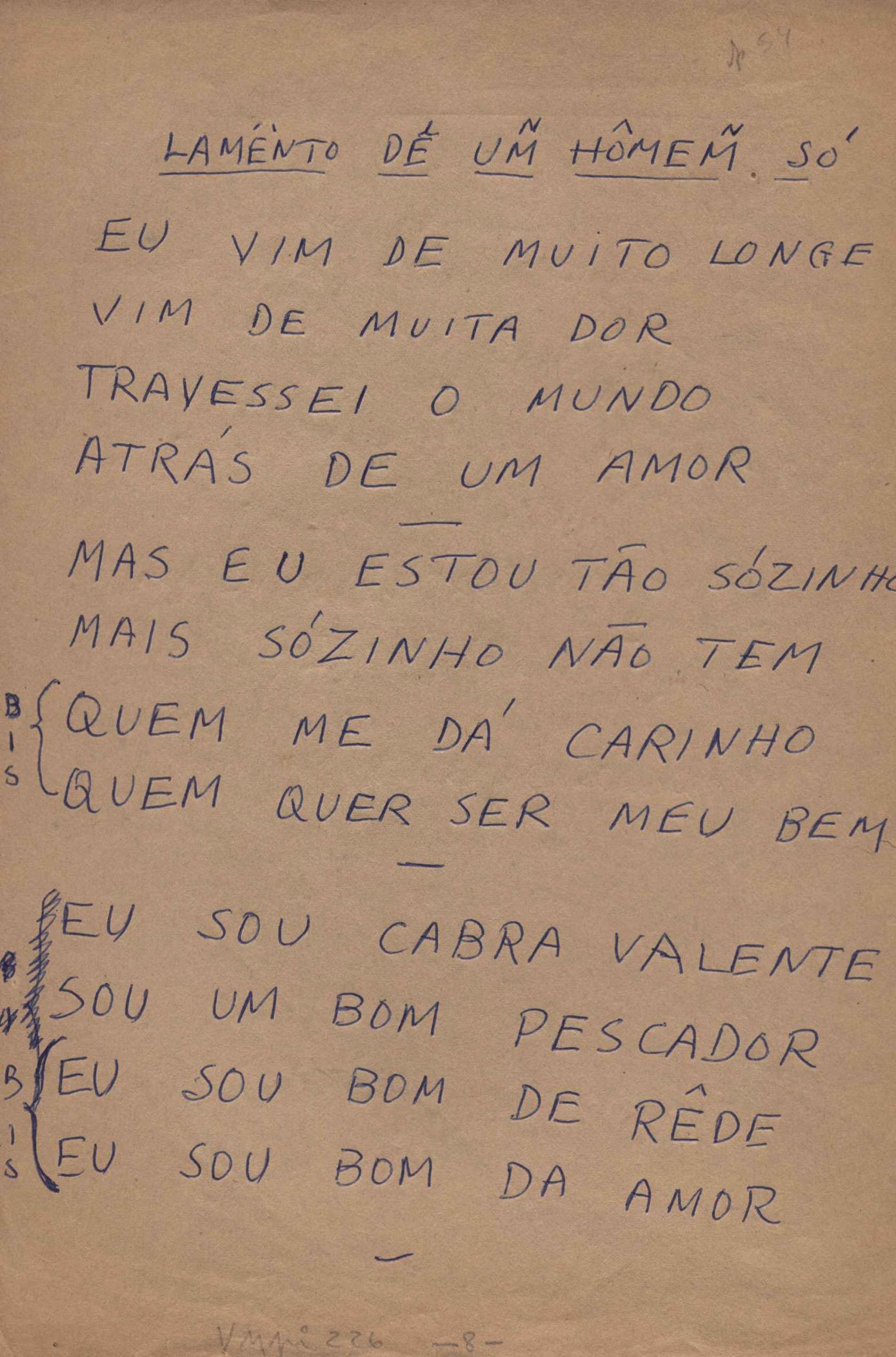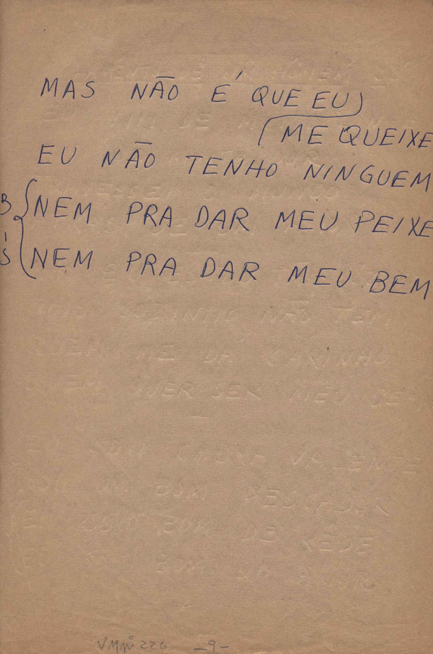 Este documento faz parte do dossiê VMPI226, que contempla um extenso conjunto de letras de música – algumas datadas entre 12 mar. 1966 e 31 maio 1976 –, além de 131 imagens de esboços/rascunhos sem títulos atribuídos (cf. registro VM0PI226_1_195). O dossiê se depara com um problema: a impossibilidade de identificação ou dedução de grande parte das datas. Mesmo que as letras não tenham sido musicalizadas ou publicadas como poemas, ressalva-se que estes originais não podem ser tomados como obra inédita. Ideias, tentativas, escritos inacabados, abandonados ou aproveitados posteriormente com outra forma compõem o dossiê.