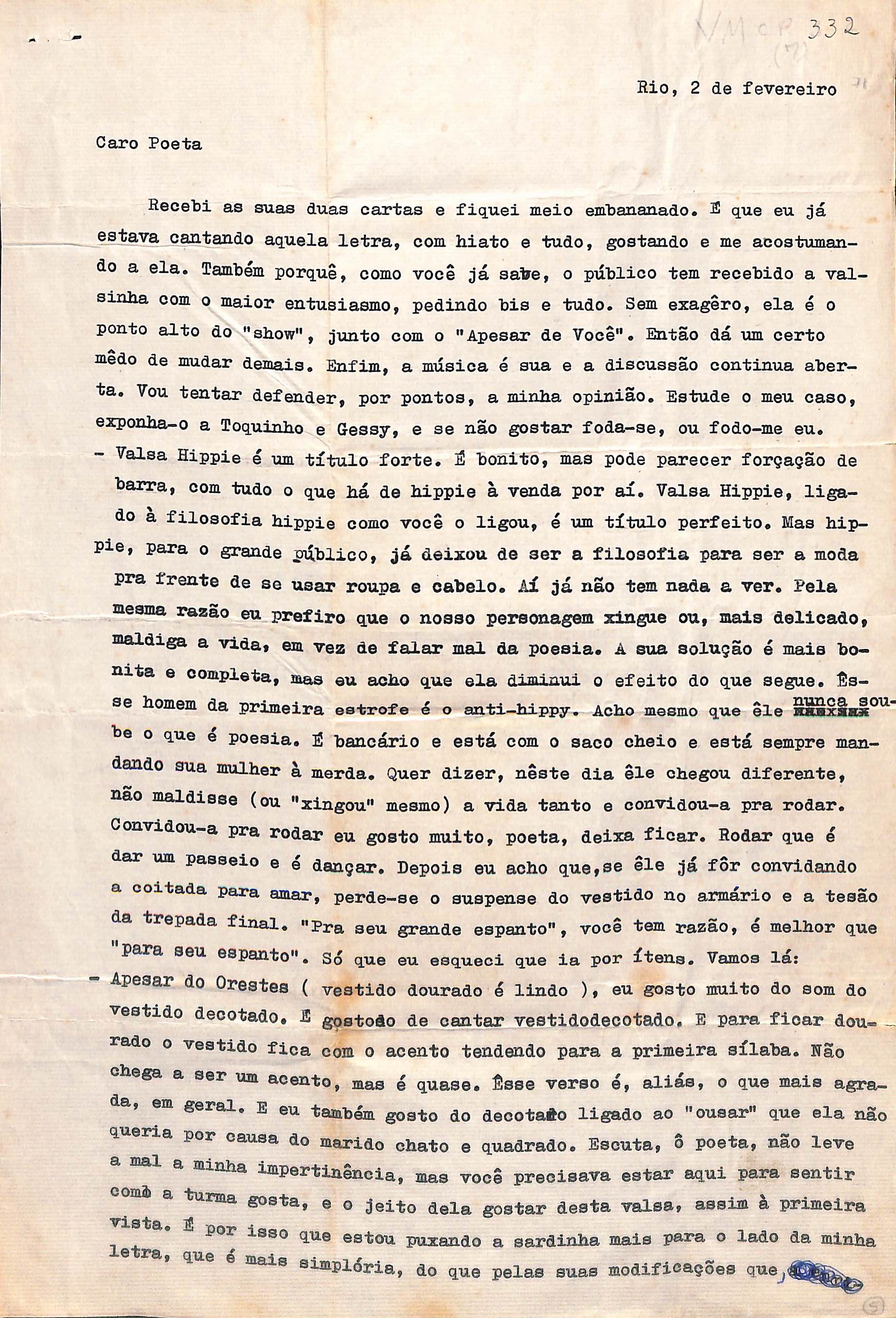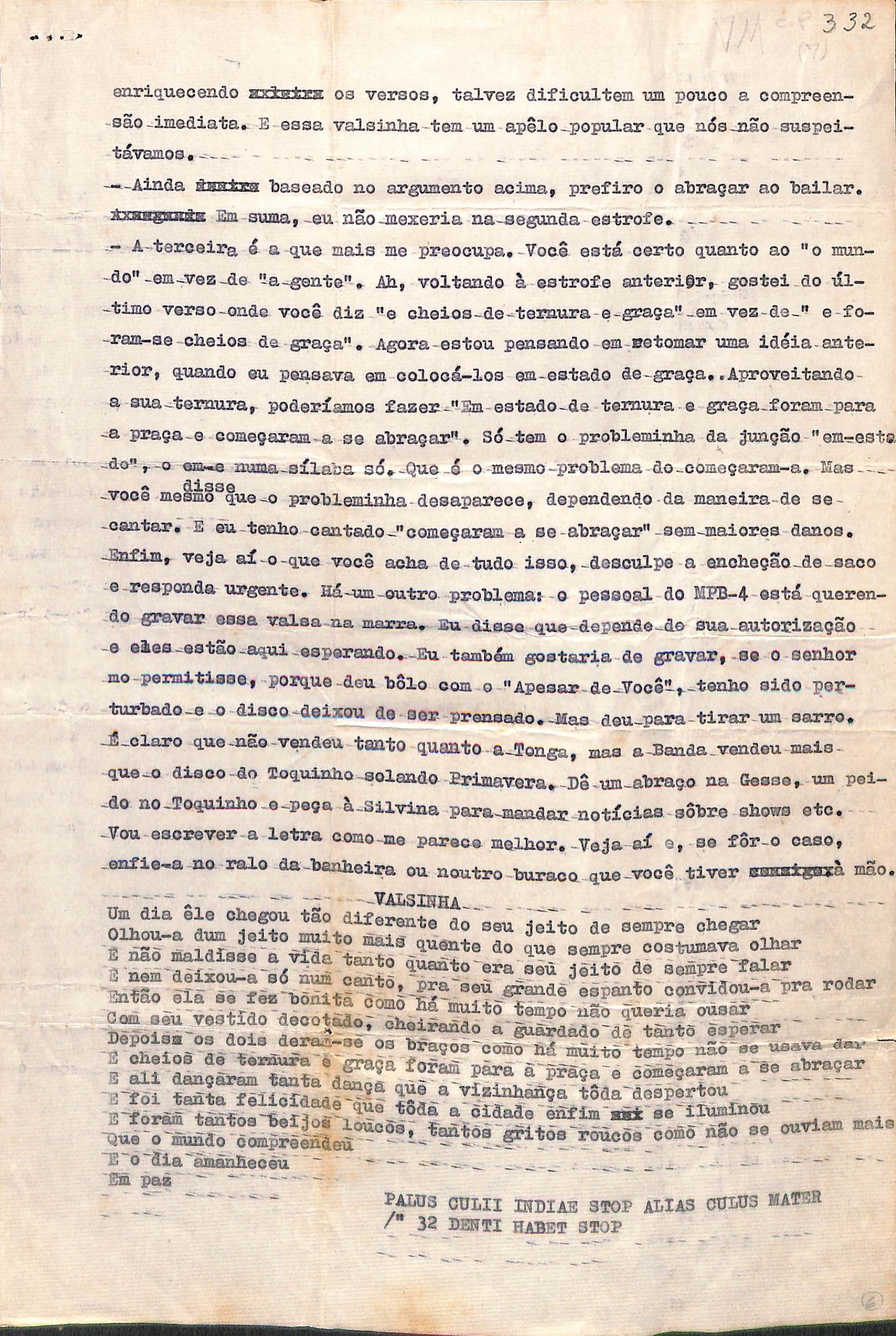 Modificações na letra da música "Valsinha". Comentários sobre show com Toquinho.