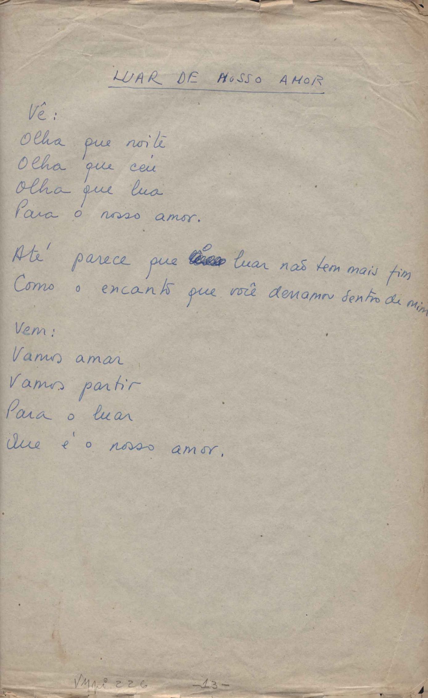 Este documento faz parte do dossiê VMPI226, que contempla um extenso conjunto de letras de música – algumas datadas entre 12 mar. 1966 e 31 maio 1976 –, além de 131 imagens de esboços/rascunhos sem títulos atribuídos (cf. registro VM0PI226_1_195). O dossiê se depara com um problema: a impossibilidade de identificação ou dedução de grande parte das datas. Mesmo que as letras não tenham sido musicalizadas ou publicadas como poemas, ressalva-se que estes originais não podem ser tomados como obra inédita. Ideias, tentativas, escritos inacabados, abandonados ou aproveitados posteriormente com outra forma compõem o dossiê.