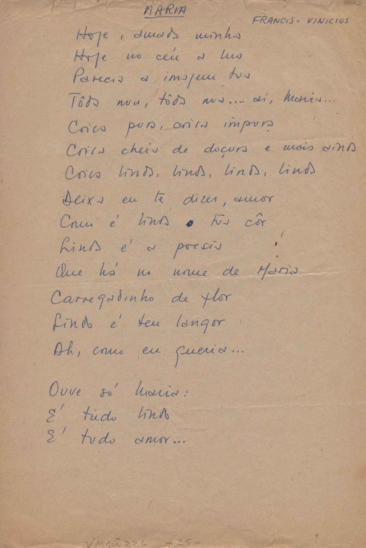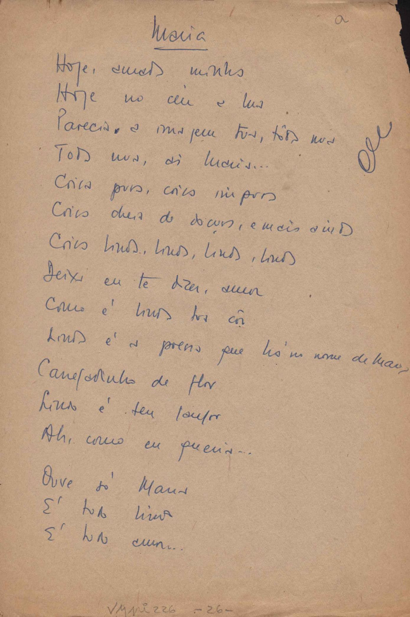 Este documento faz parte do dossiê VMPI226, que contempla um extenso conjunto de letras de música – algumas datadas entre 12 mar. 1966 e 31 maio 1976 –, além de 131 imagens de esboços/rascunhos sem títulos atribuídos (cf. registro VM0PI226_1_195). O dossiê se depara com um problema: a impossibilidade de identificação ou dedução de grande parte das datas. Mesmo que as letras não tenham sido musicalizadas ou publicadas como poemas, ressalva-se que estes originais não podem ser tomados como obra inédita. Ideias, tentativas, escritos inacabados, abandonados ou aproveitados posteriormente com outra forma compõem o dossiê.
