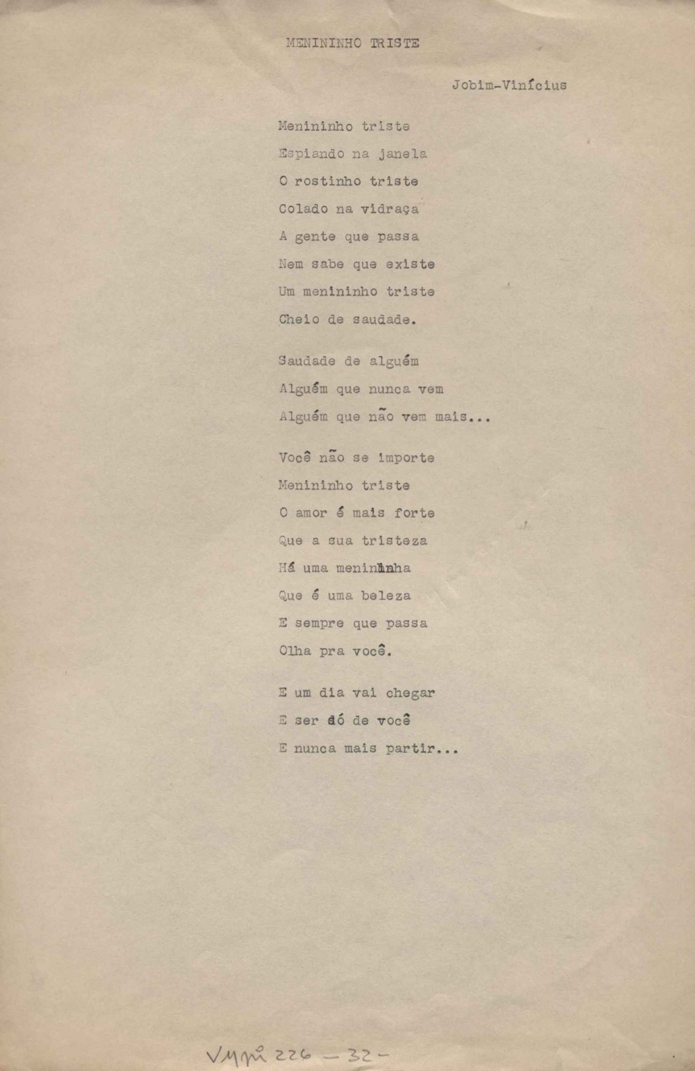 Este documento faz parte do dossiê VMPI226, que contempla um extenso conjunto de letras de música – algumas datadas entre 12 mar. 1966 e 31 maio 1976 –, além de 131 imagens de esboços/rascunhos sem títulos atribuídos (cf. registro VM0PI226_1_195). O dossiê se depara com um problema: a impossibilidade de identificação ou dedução de grande parte das datas. Mesmo que as letras não tenham sido musicalizadas ou publicadas como poemas, ressalva-se que estes originais não podem ser tomados como obra inédita. Ideias, tentativas, escritos inacabados, abandonados ou aproveitados posteriormente com outra forma compõem o dossiê.