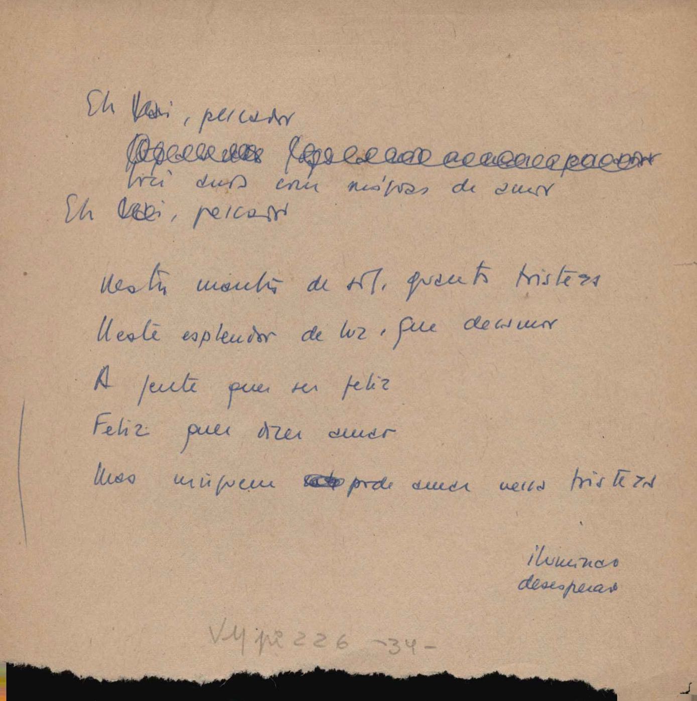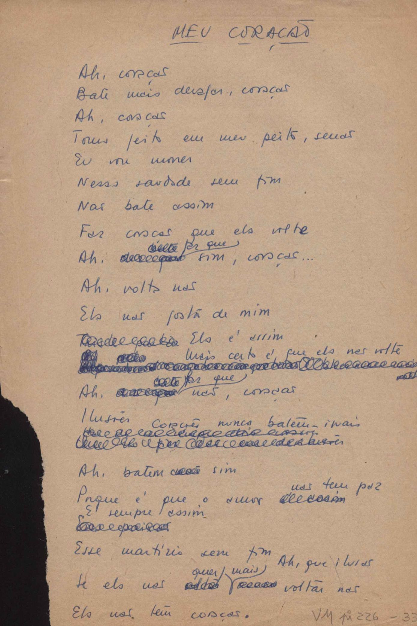 Este documento faz parte do dossiê VMPI226, que contempla um extenso conjunto de letras de música – algumas datadas entre 12 mar. 1966 e 31 maio 1976 –, além de 131 imagens de esboços/rascunhos sem títulos atribuídos (cf. registro VM0PI226_1_195). O dossiê se depara com um problema: a impossibilidade de identificação ou dedução de grande parte das datas. Mesmo que as letras não tenham sido musicalizadas ou publicadas como poemas, ressalva-se que estes originais não podem ser tomados como obra inédita. Ideias, tentativas, escritos inacabados, abandonados ou aproveitados posteriormente com outra forma compõem o dossiê.
