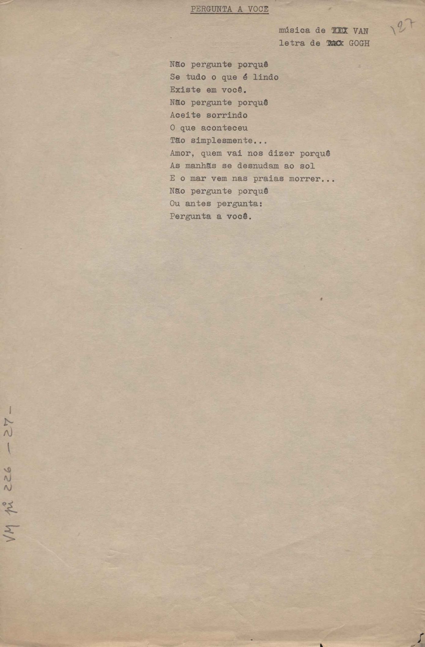 Este documento faz parte do dossiê VMPI226, que contempla um extenso conjunto de letras de música – algumas datadas entre 12 mar. 1966 e 31 maio 1976 –, além de 131 imagens de esboços/rascunhos sem títulos atribuídos (cf. registro VM0PI226_1_195). O dossiê se depara com um problema: a impossibilidade de identificação ou dedução de grande parte das datas. Mesmo que as letras não tenham sido musicalizadas ou publicadas como poemas, ressalva-se que estes originais não podem ser tomados como obra inédita. Ideias, tentativas, escritos inacabados, abandonados ou aproveitados posteriormente com outra forma compõem o dossiê.