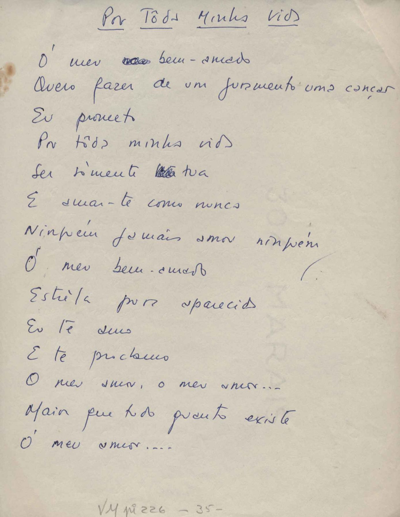 Este documento faz parte do dossiê VMPI226, que contempla um extenso conjunto de letras de música – algumas datadas entre 12 mar. 1966 e 31 maio 1976 –, além de 131 imagens de esboços/rascunhos sem títulos atribuídos (cf. registro VM0PI226_1_195). O dossiê se depara com um problema: a impossibilidade de identificação ou dedução de grande parte das datas. Mesmo que as letras não tenham sido musicalizadas ou publicadas como poemas, ressalva-se que estes originais não podem ser tomados como obra inédita. Ideias, tentativas, escritos inacabados, abandonados ou aproveitados posteriormente com outra forma compõem o dossiê.