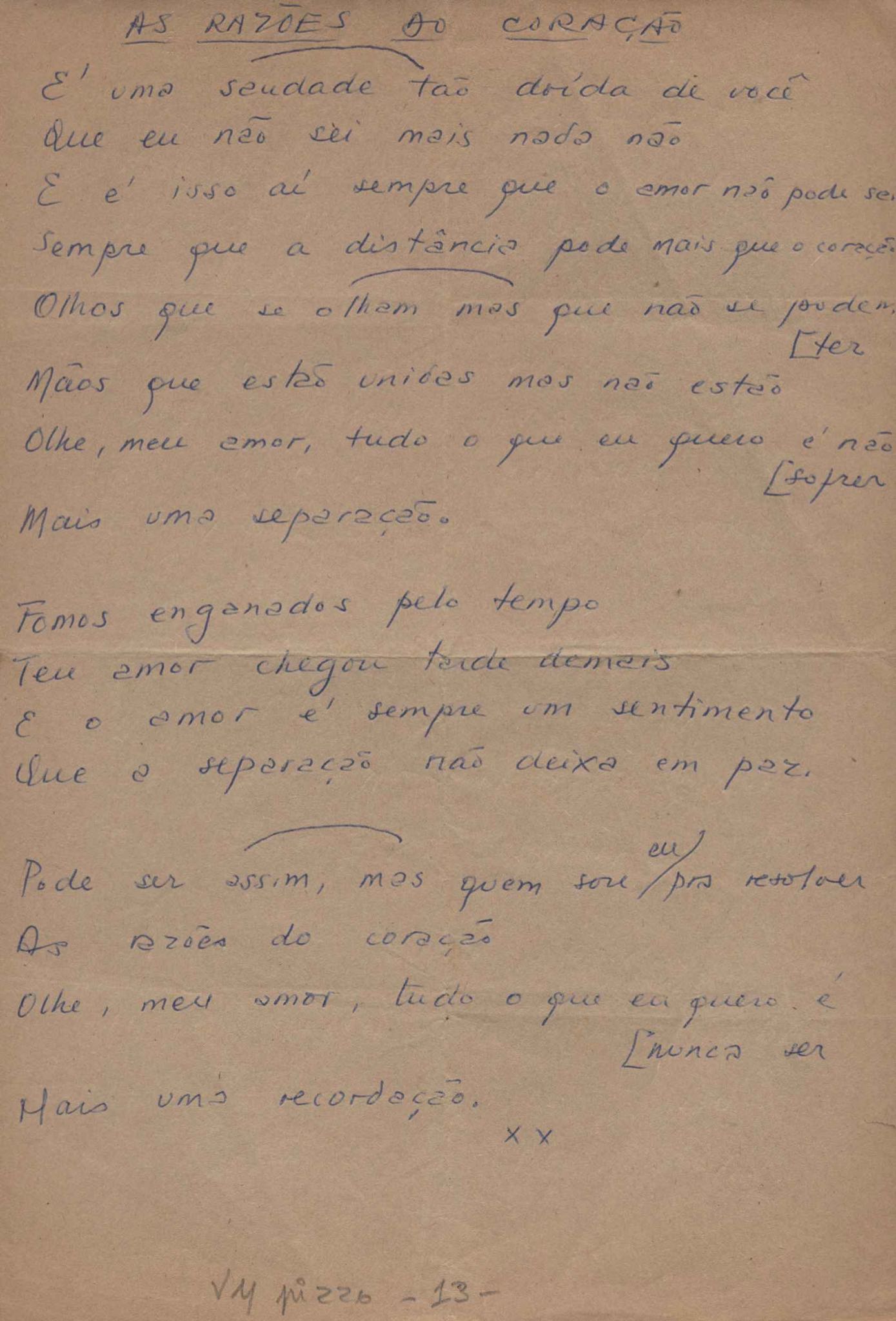 Este documento faz parte do dossiê VMPI226, que contempla um extenso conjunto de letras de música – algumas datadas entre 12 mar. 1966 e 31 maio 1976 –, além de 131 imagens de esboços/rascunhos sem títulos atribuídos (cf. registro VM0PI226_1_195). O dossiê se depara com um problema: a impossibilidade de identificação ou dedução de grande parte das datas. Mesmo que as letras não tenham sido musicalizadas ou publicadas como poemas, ressalva-se que estes originais não podem ser tomados como obra inédita. Ideias, tentativas, escritos inacabados, abandonados ou aproveitados posteriormente com outra forma compõem o dossiê.
