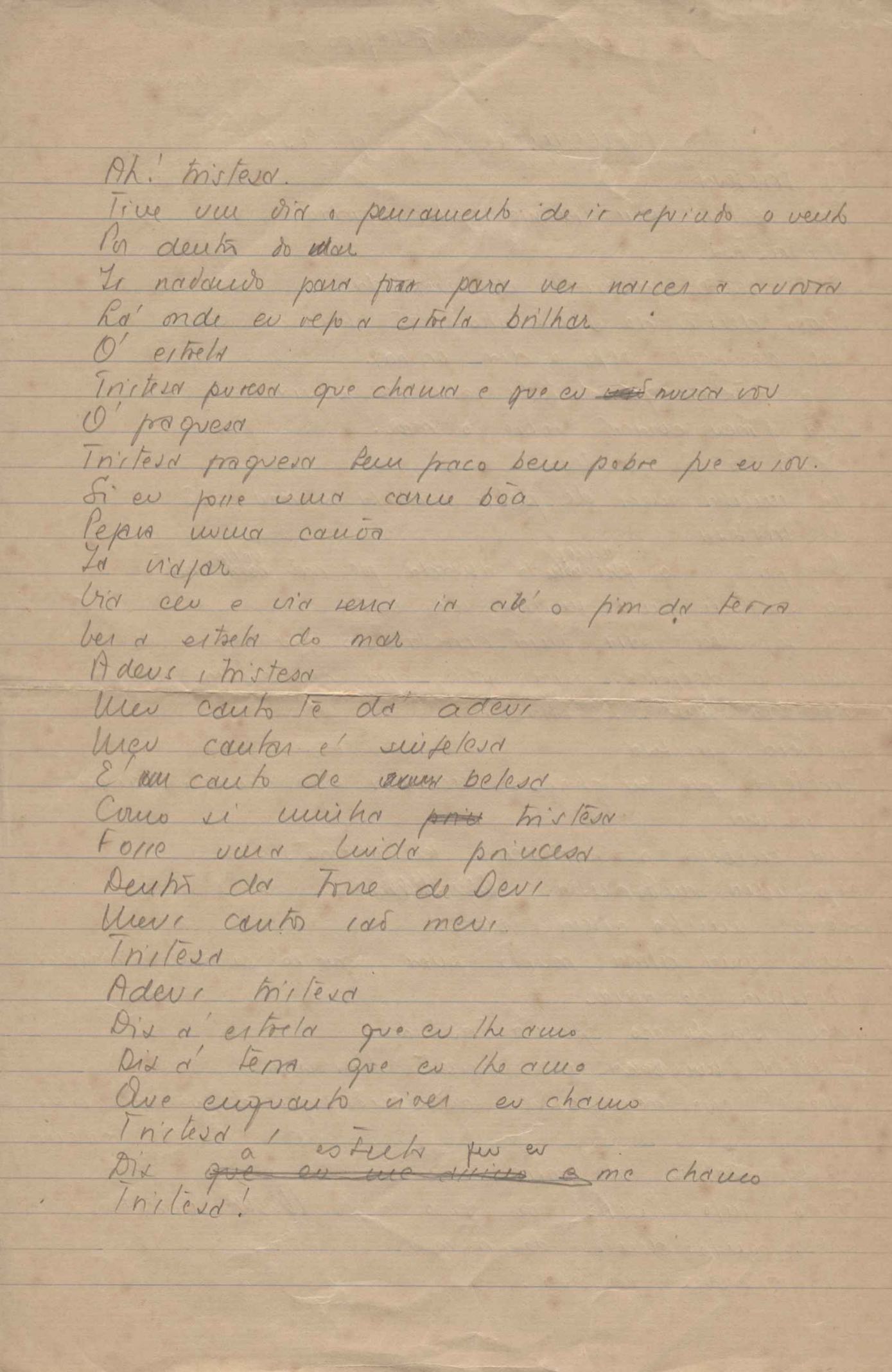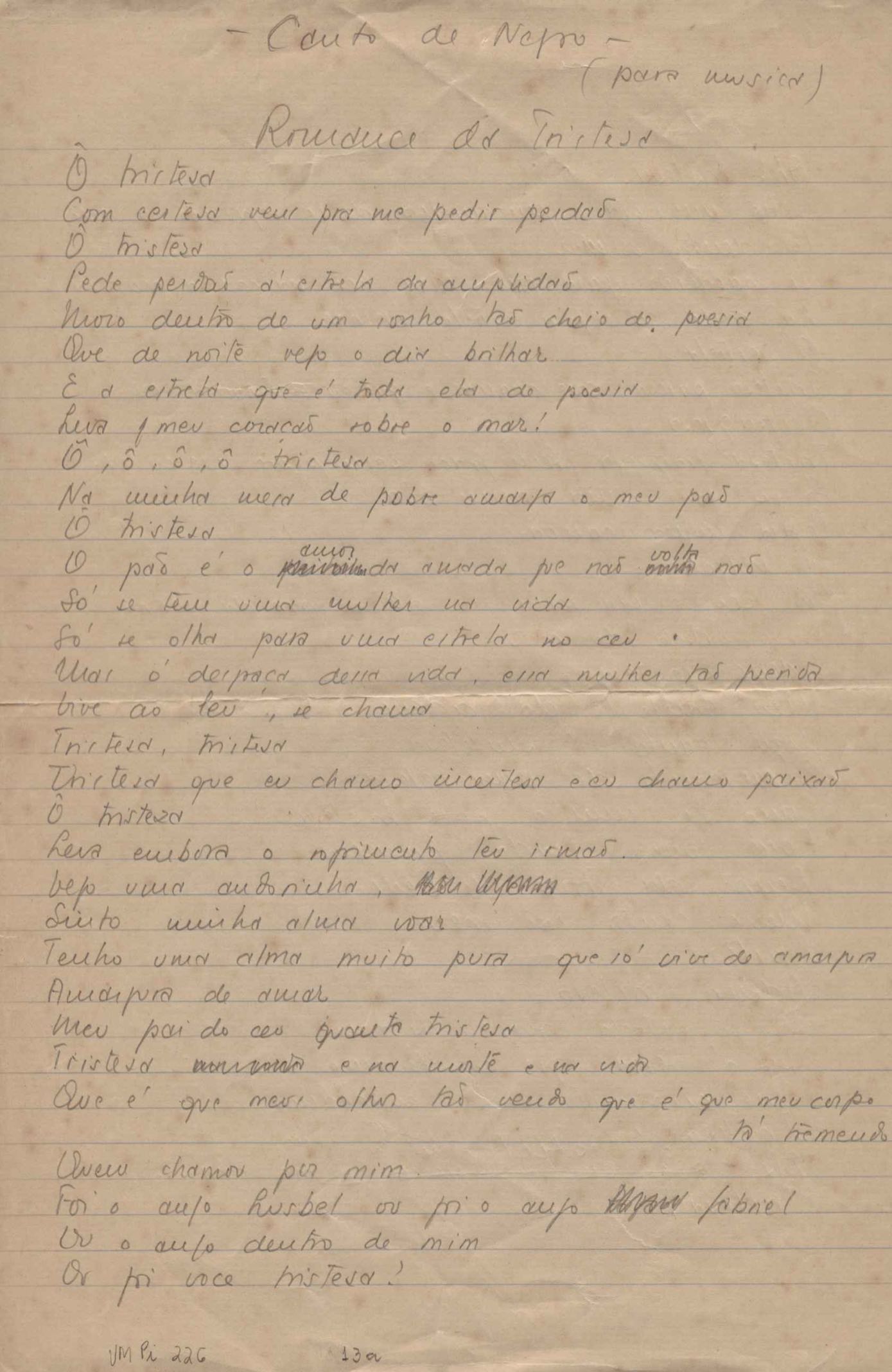 Este documento faz parte do dossiê VMPI226, que contempla um extenso conjunto de letras de música – algumas datadas entre 12 mar. 1966 e 31 maio 1976 –, além de 131 imagens de esboços/rascunhos sem títulos atribuídos (cf. registro VM0PI226_1_195). O dossiê se depara com um problema: a impossibilidade de identificação ou dedução de grande parte das datas. Mesmo que as letras não tenham sido musicalizadas ou publicadas como poemas, ressalva-se que estes originais não podem ser tomados como obra inédita. Ideias, tentativas, escritos inacabados, abandonados ou aproveitados posteriormente com outra forma compõem o dossiê.