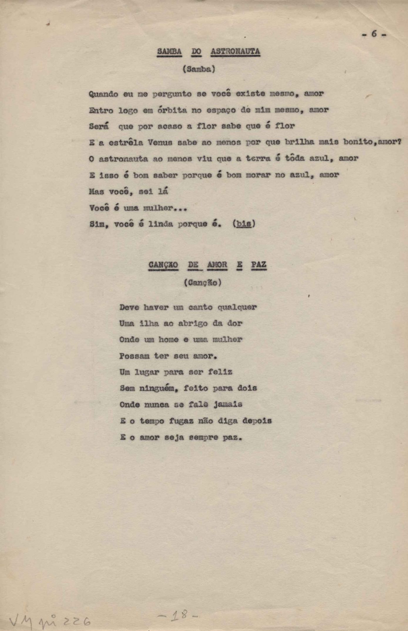 Este documento faz parte do dossiê VMPI226, que contempla um extenso conjunto de letras de música – algumas datadas entre 12 mar. 1966 e 31 maio 1976 –, além de 131 imagens de esboços/rascunhos sem títulos atribuídos (cf. registro VM0PI226_1_195). O dossiê se depara com um problema: a impossibilidade de identificação ou dedução de grande parte das datas. Mesmo que as letras não tenham sido musicalizadas ou publicadas como poemas, ressalva-se que estes originais não podem ser tomados como obra inédita. Ideias, tentativas, escritos inacabados, abandonados ou aproveitados posteriormente com outra forma compõem o dossiê.