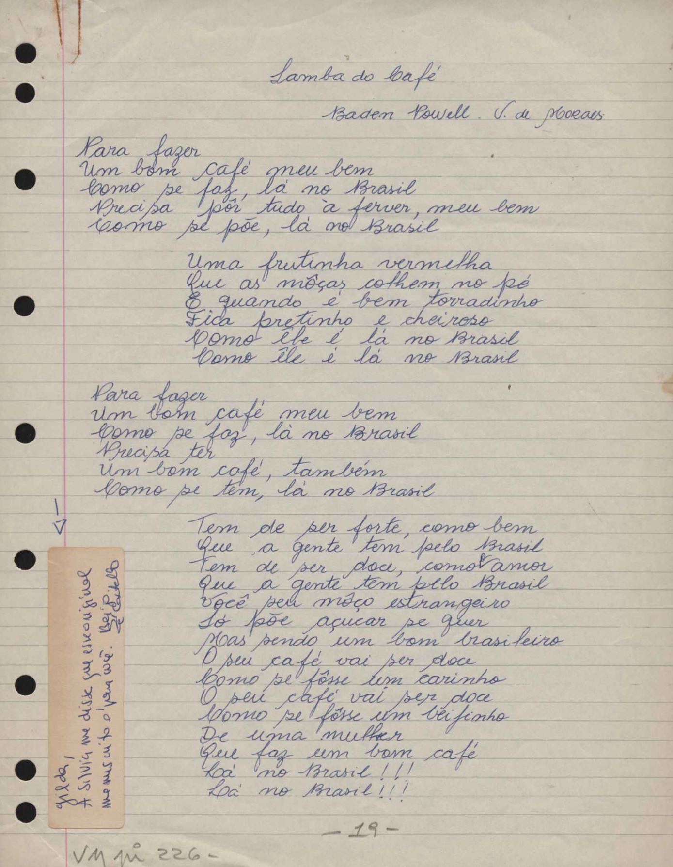 Este documento faz parte do dossiê VMPI226, que contempla um extenso conjunto de letras de música – algumas datadas entre 12 mar. 1966 e 31 maio 1976 –, além de 131 imagens de esboços/rascunhos sem títulos atribuídos (cf. registro VM0PI226_1_195). O dossiê se depara com um problema: a impossibilidade de identificação ou dedução de grande parte das datas. Mesmo que as letras não tenham sido musicalizadas ou publicadas como poemas, ressalva-se que estes originais não podem ser tomados como obra inédita. Ideias, tentativas, escritos inacabados, abandonados ou aproveitados posteriormente com outra forma compõem o dossiê.