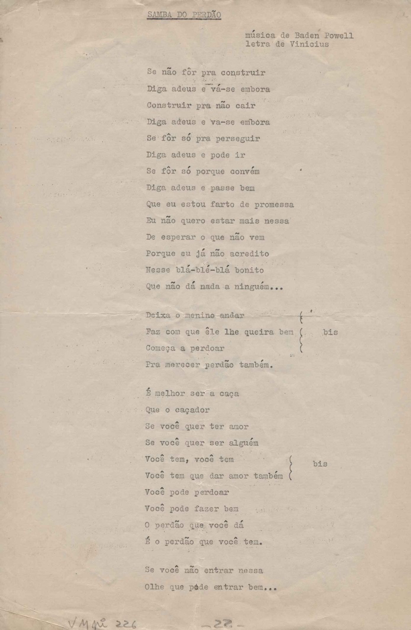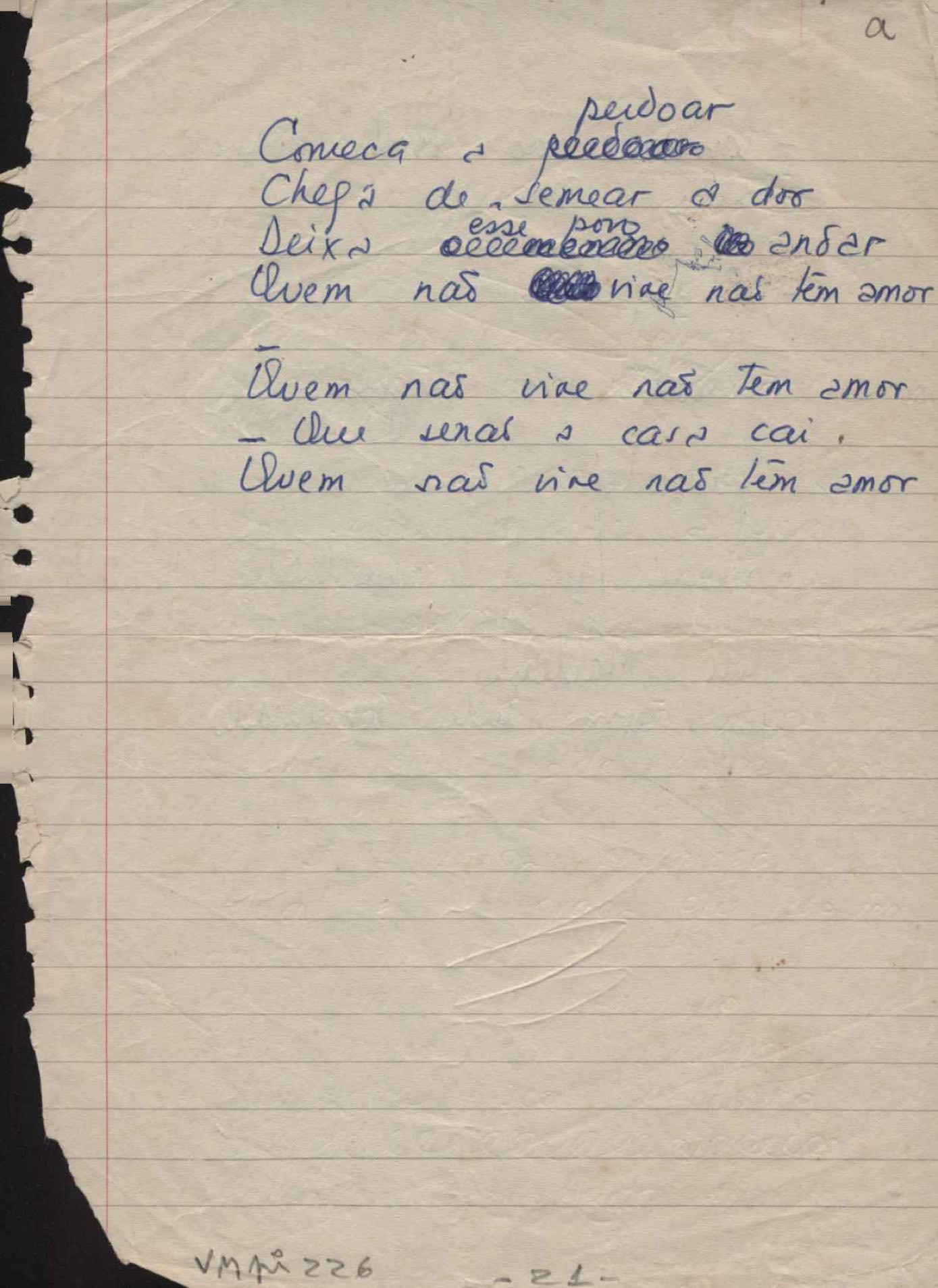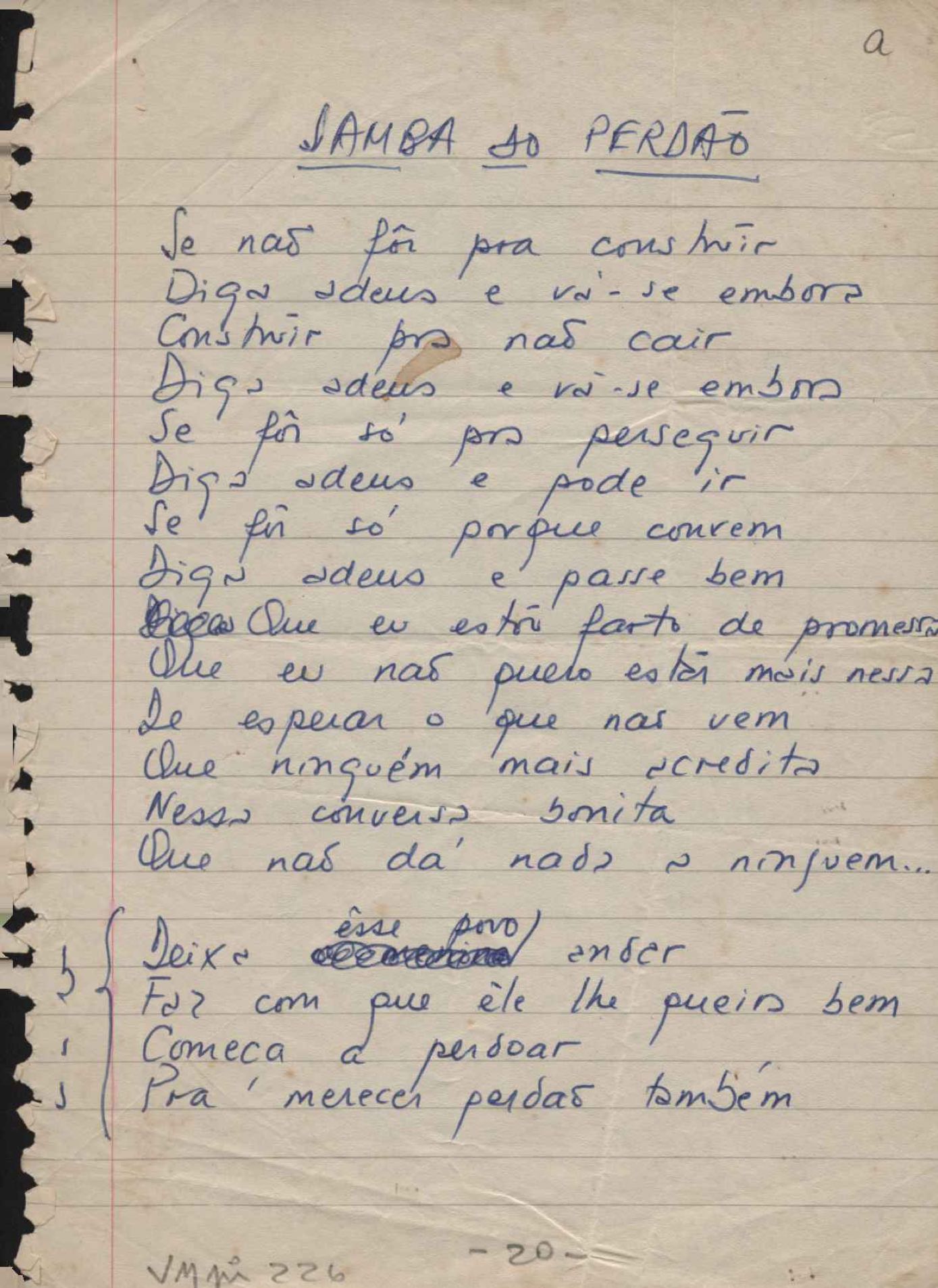 Este documento faz parte do dossiê VMPI226, que contempla um extenso conjunto de letras de música – algumas datadas entre 12 mar. 1966 e 31 maio 1976 –, além de 131 imagens de esboços/rascunhos sem títulos atribuídos (cf. registro VM0PI226_1_195). O dossiê se depara com um problema: a impossibilidade de identificação ou dedução de grande parte das datas. Mesmo que as letras não tenham sido musicalizadas ou publicadas como poemas, ressalva-se que estes originais não podem ser tomados como obra inédita. Ideias, tentativas, escritos inacabados, abandonados ou aproveitados posteriormente com outra forma compõem o dossiê.