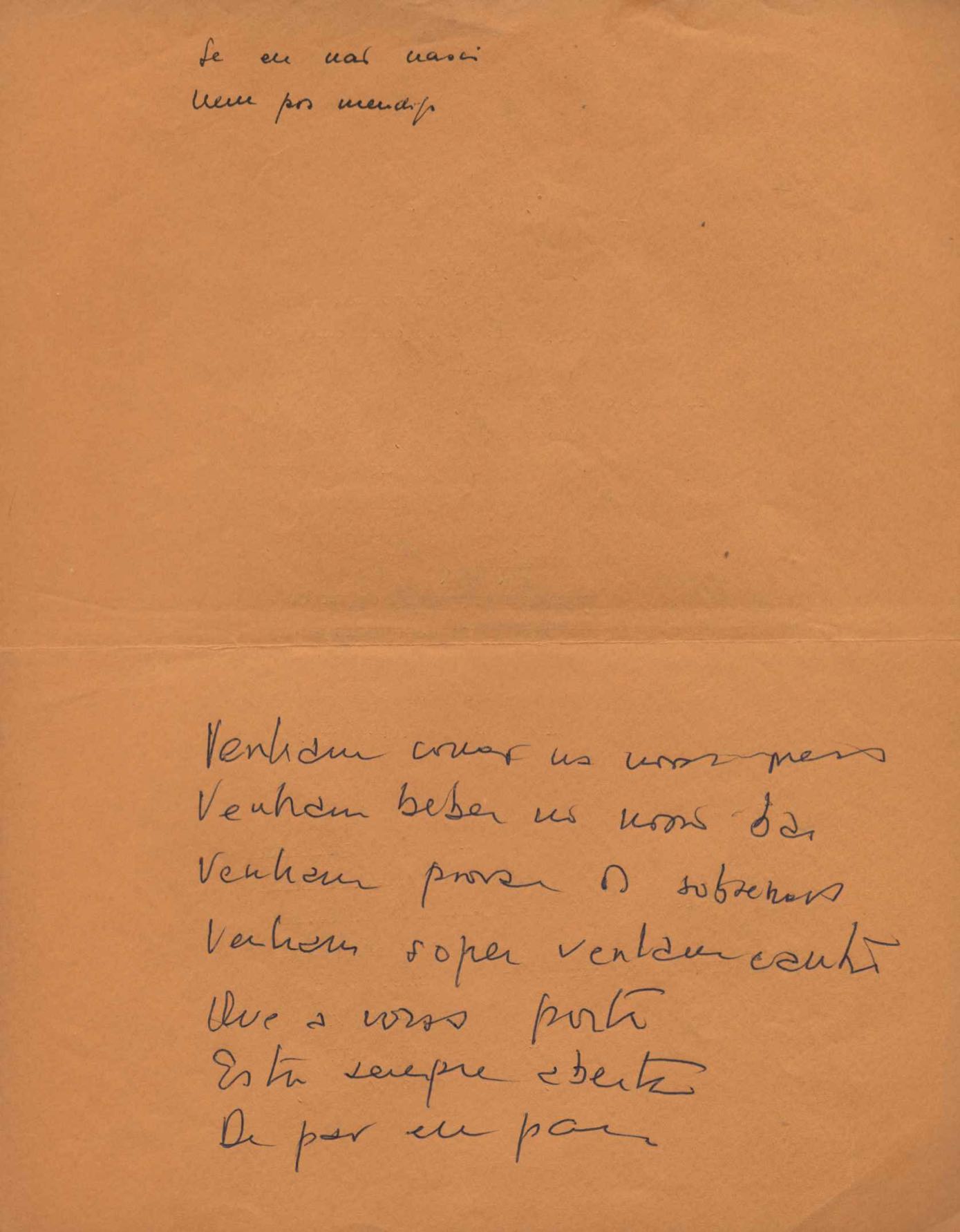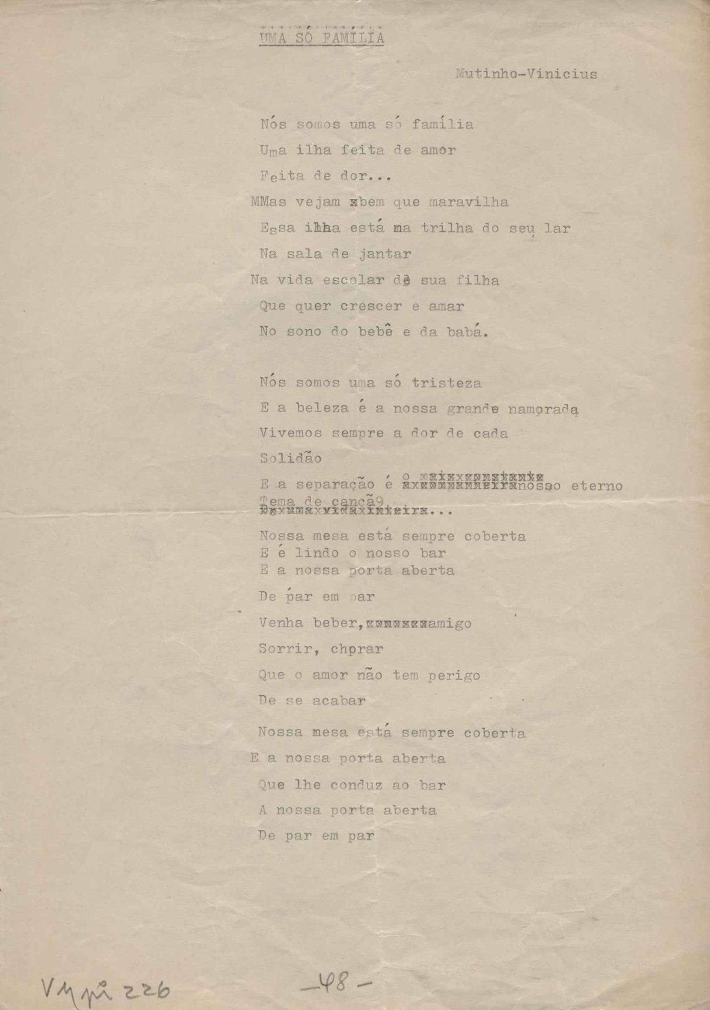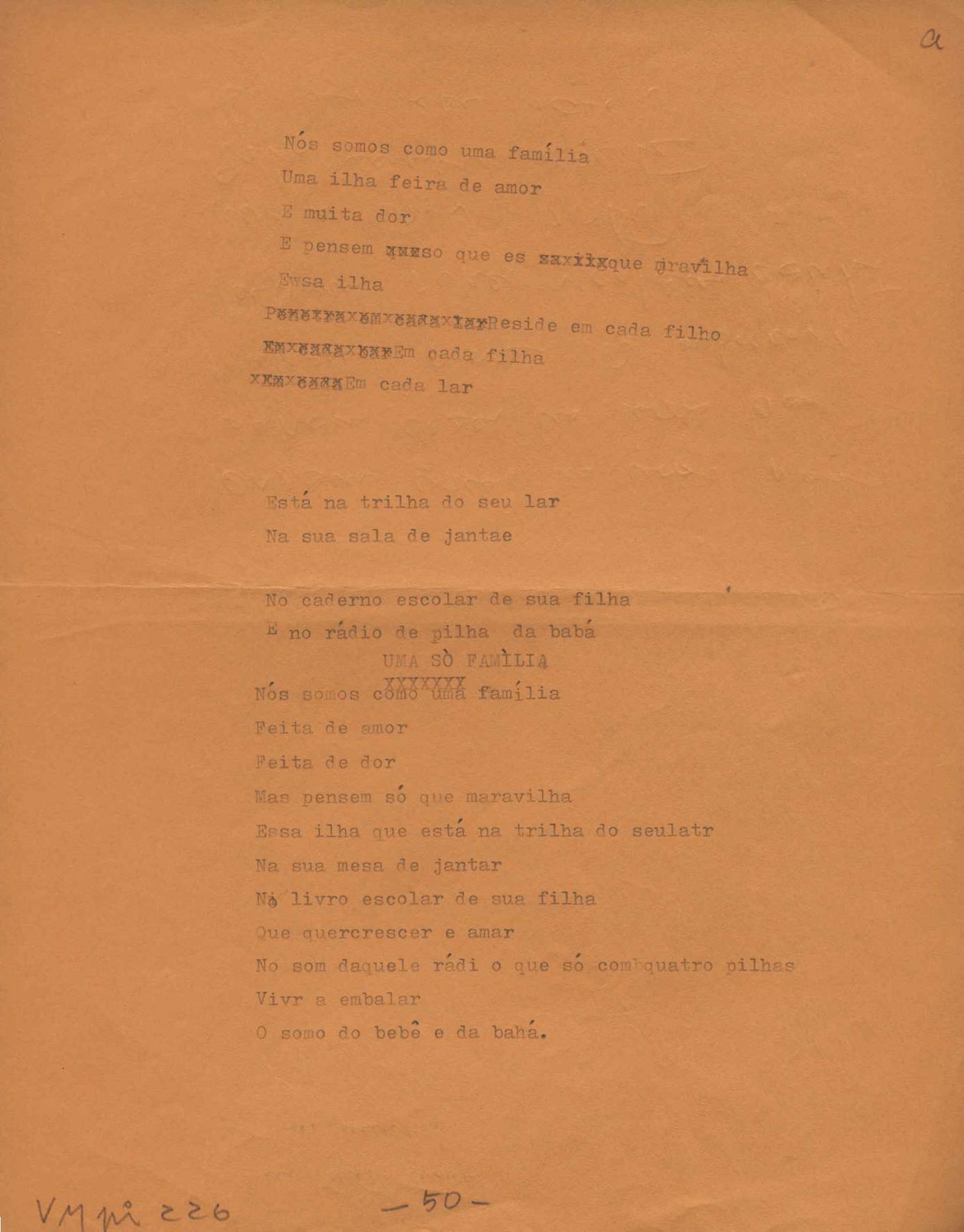 Este documento faz parte do dossiê VMPI226, que contempla um extenso conjunto de letras de música – algumas datadas entre 12 mar. 1966 e 31 maio 1976 –, além de 131 imagens de esboços/rascunhos sem títulos atribuídos (cf. registro VM0PI226_1_195). O dossiê se depara com um problema: a impossibilidade de identificação ou dedução de grande parte das datas. Mesmo que as letras não tenham sido musicalizadas ou publicadas como poemas, ressalva-se que estes originais não podem ser tomados como obra inédita. Ideias, tentativas, escritos inacabados, abandonados ou aproveitados posteriormente com outra forma compõem o dossiê.