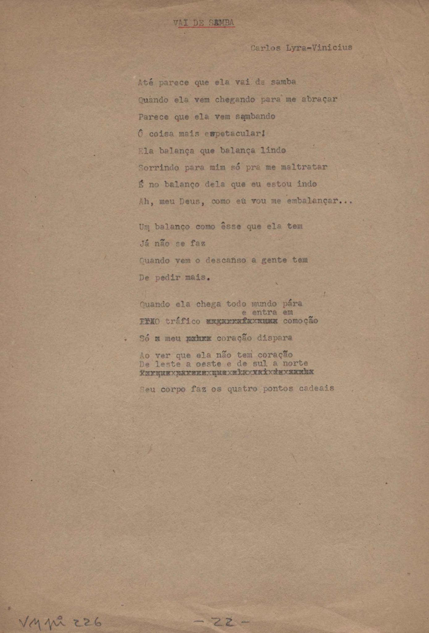 Este documento faz parte do dossiê VMPI226, que contempla um extenso conjunto de letras de música – algumas datadas entre 12 mar. 1966 e 31 maio 1976 –, além de 131 imagens de esboços/rascunhos sem títulos atribuídos (cf. registro VM0PI226_1_195). O dossiê se depara com um problema: a impossibilidade de identificação ou dedução de grande parte das datas. Mesmo que as letras não tenham sido musicalizadas ou publicadas como poemas, ressalva-se que estes originais não podem ser tomados como obra inédita. Ideias, tentativas, escritos inacabados, abandonados ou aproveitados posteriormente com outra forma compõem o dossiê.