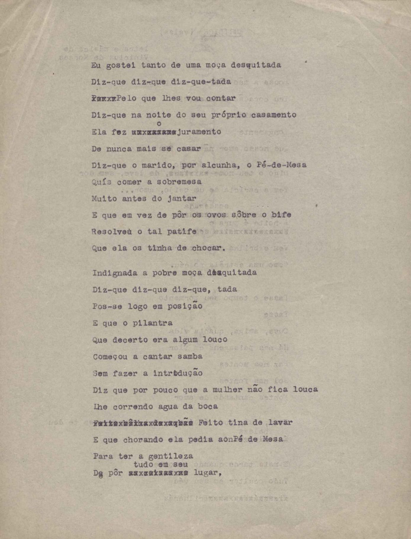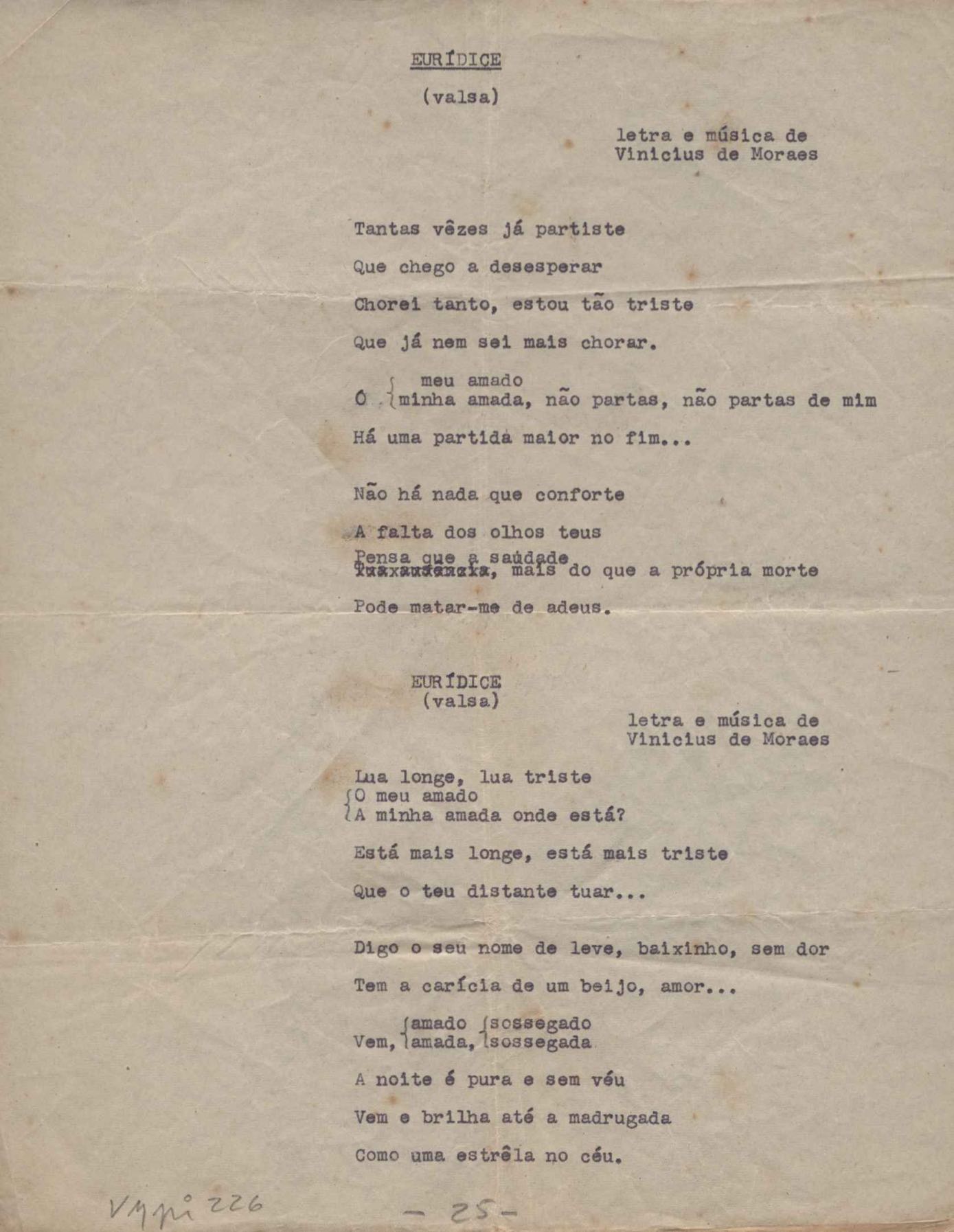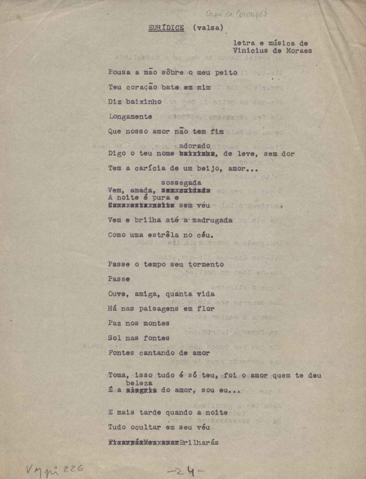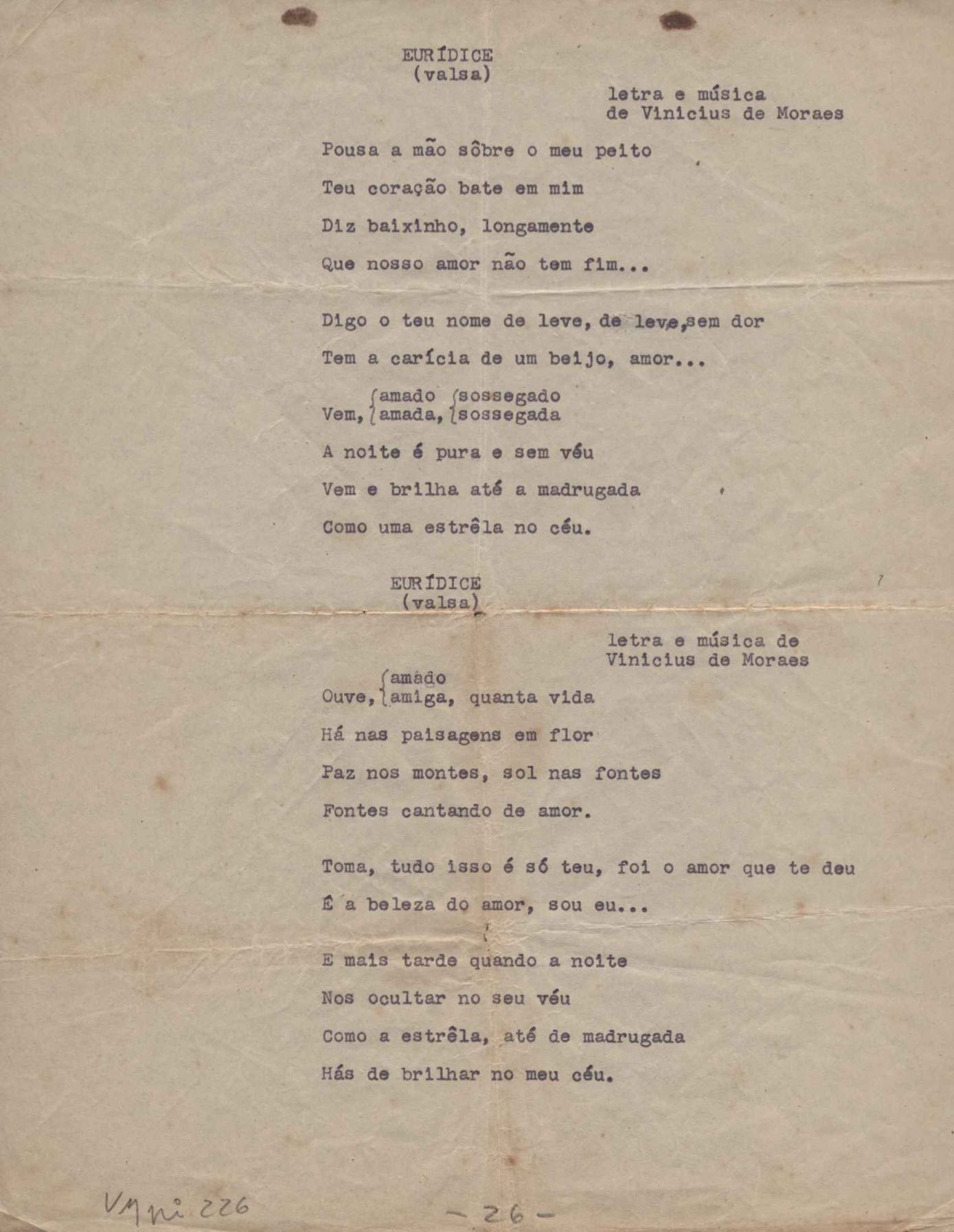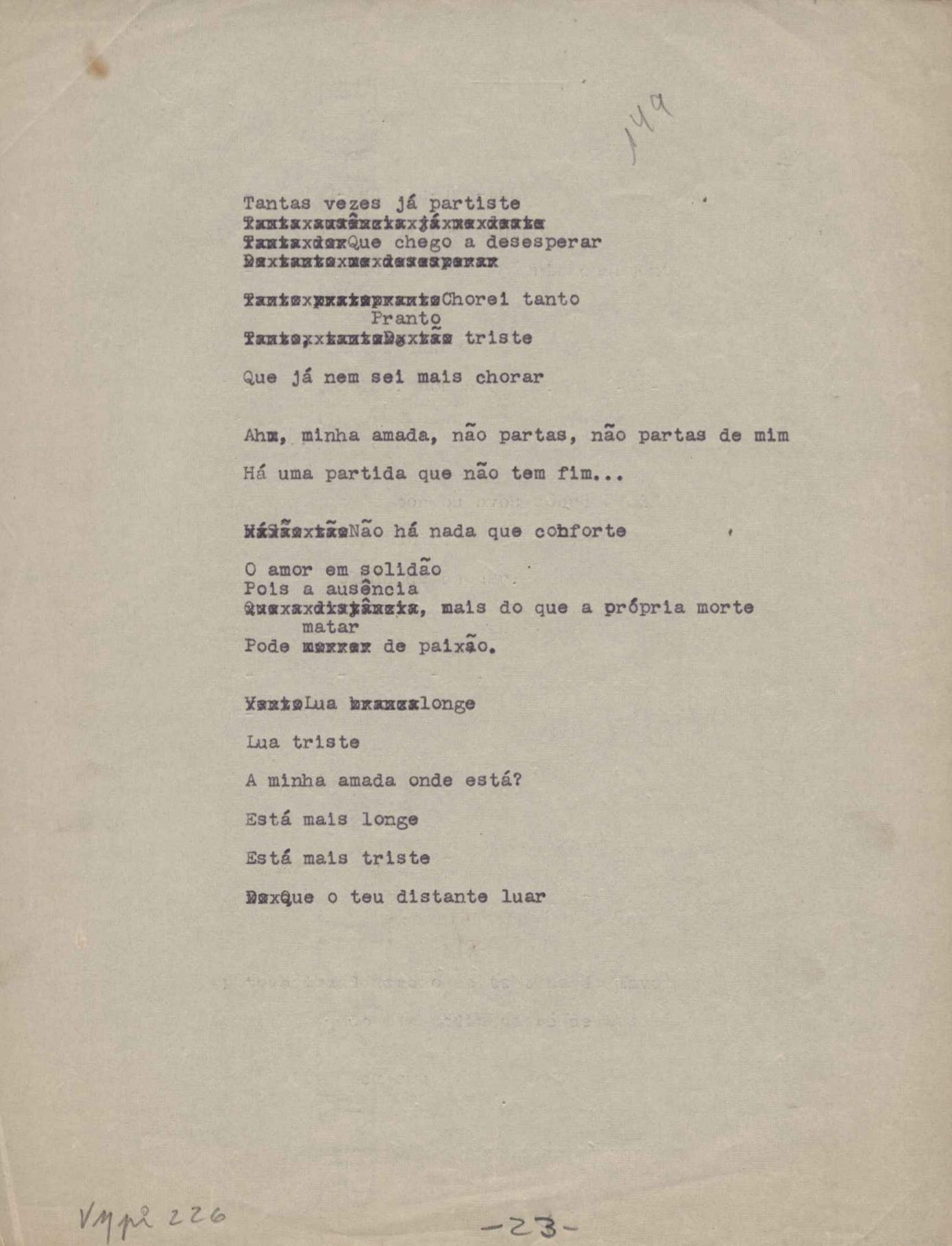 Este documento faz parte do dossiê VMPI226, que contempla um extenso conjunto de letras de música – algumas datadas entre 12 mar. 1966 e 31 maio 1976 –, além de 131 imagens de esboços/rascunhos sem títulos atribuídos (cf. registro VM0PI226_1_195). O dossiê se depara com um problema: a impossibilidade de identificação ou dedução de grande parte das datas. Mesmo que as letras não tenham sido musicalizadas ou publicadas como poemas, ressalva-se que estes originais não podem ser tomados como obra inédita. Ideias, tentativas, escritos inacabados, abandonados ou aproveitados posteriormente com outra forma compõem o dossiê.