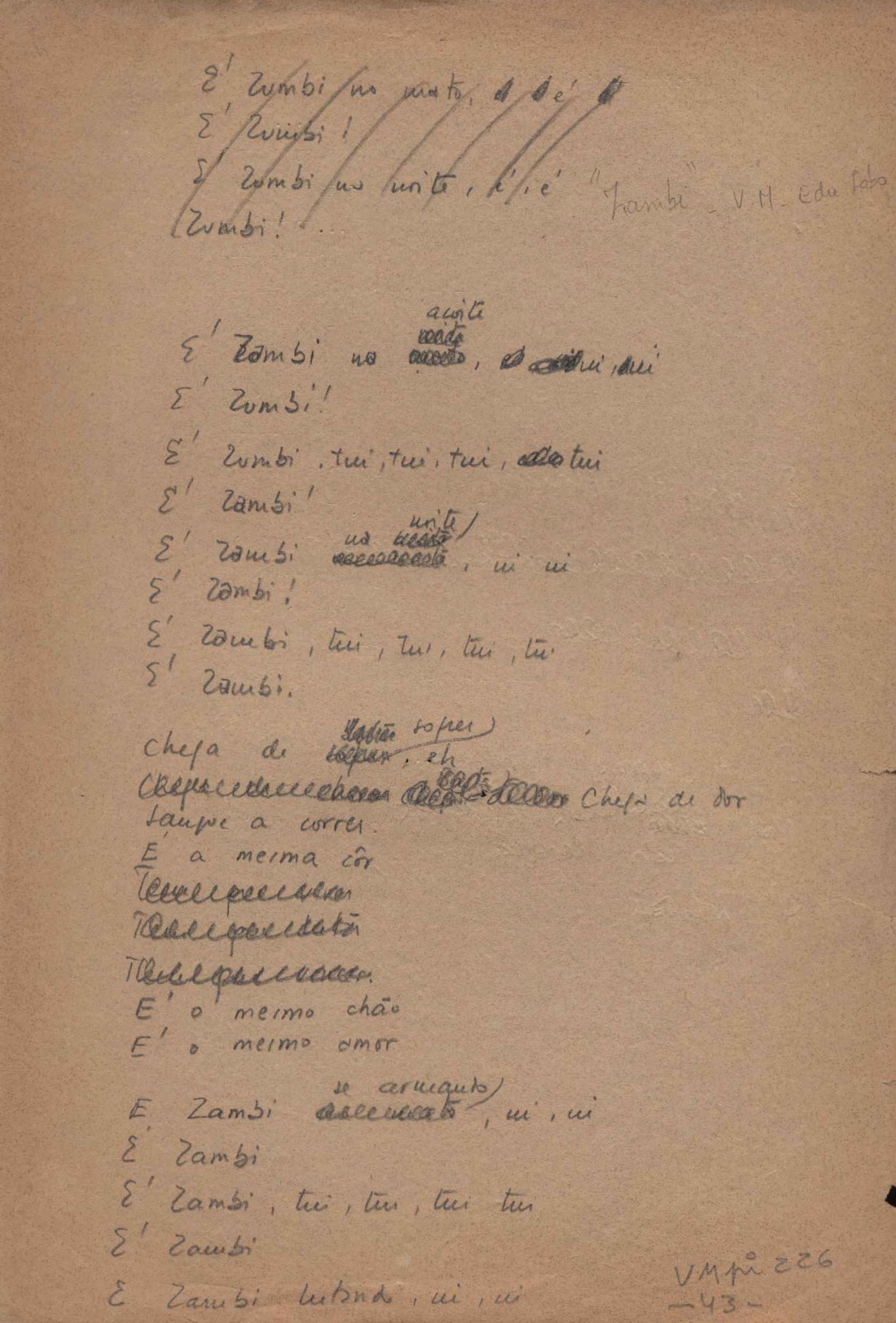 Este documento faz parte do dossiê VMPI226, que contempla um extenso conjunto de letras de música – algumas datadas entre 12 mar. 1966 e 31 maio 1976 –, além de 131 imagens de esboços/rascunhos sem títulos atribuídos (cf. registro VM0PI226_1_195). O dossiê se depara com um problema: a impossibilidade de identificação ou dedução de grande parte das datas. Mesmo que as letras não tenham sido musicalizadas ou publicadas como poemas, ressalva-se que estes originais não podem ser tomados como obra inédita. Ideias, tentativas, escritos inacabados, abandonados ou aproveitados posteriormente com outra forma compõem o dossiê.
