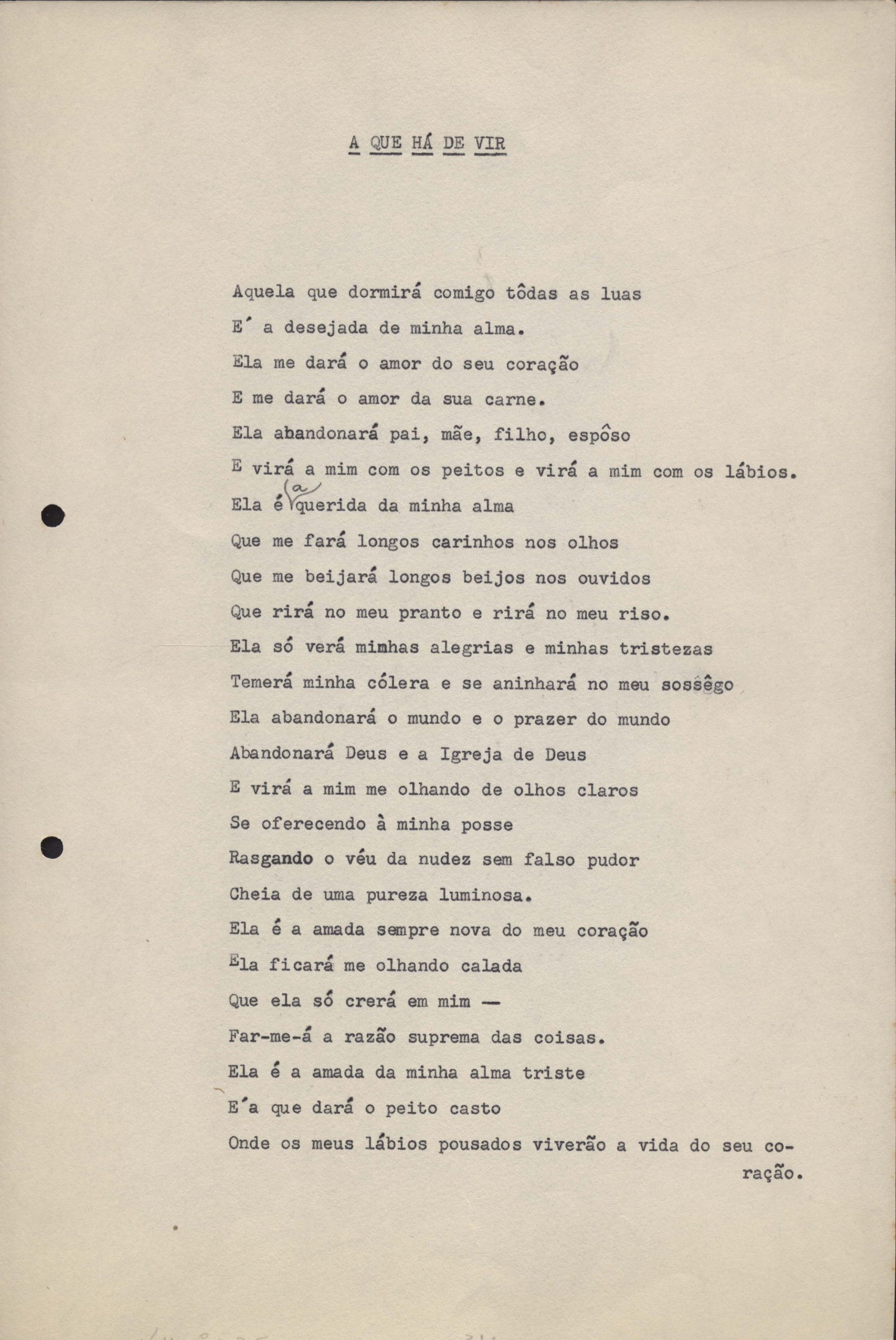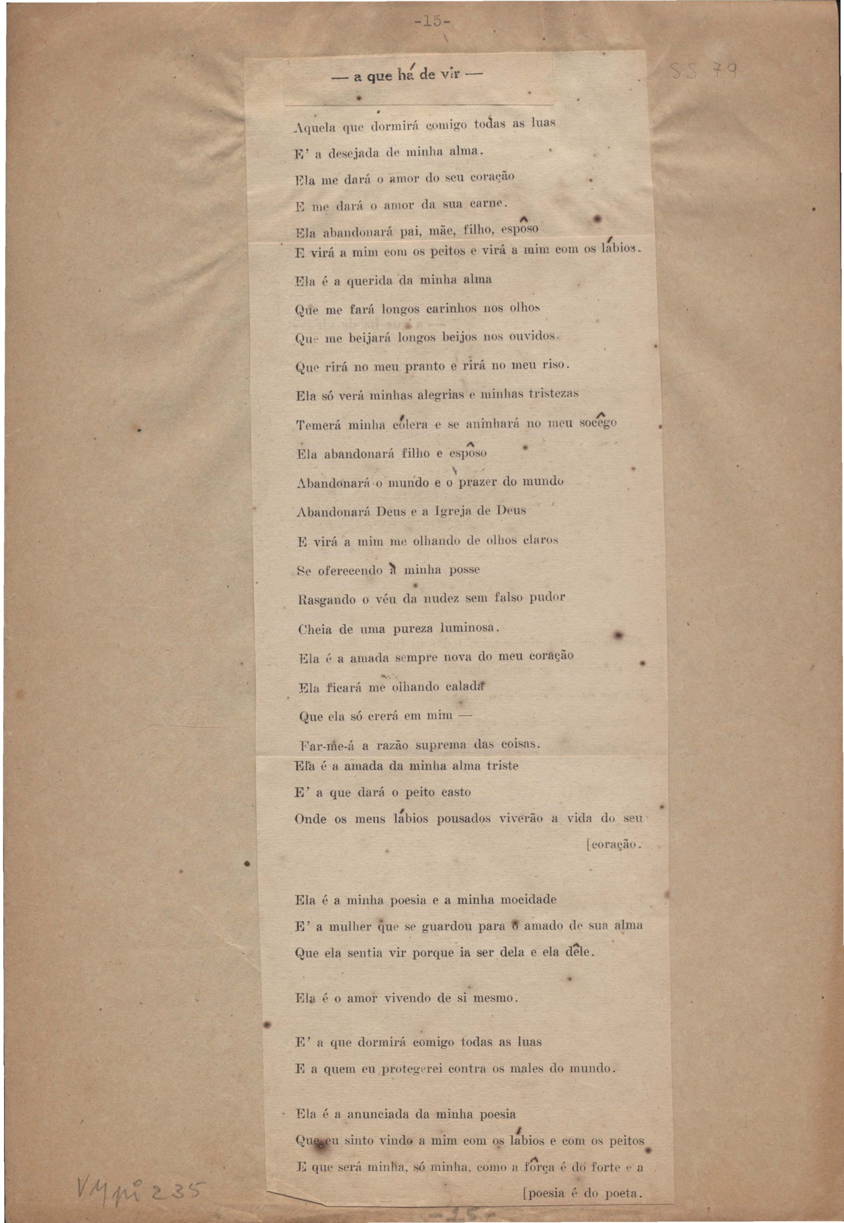 Este documento faz parte do dossiê VMPI235, que contempla poemas datados entre 17 ago. 1932 e 11 ago. 1933, publicados no livro O caminho para a distância. Inclui recortes de alguns poemas impressos da 1ª edição com correções manuscritas.