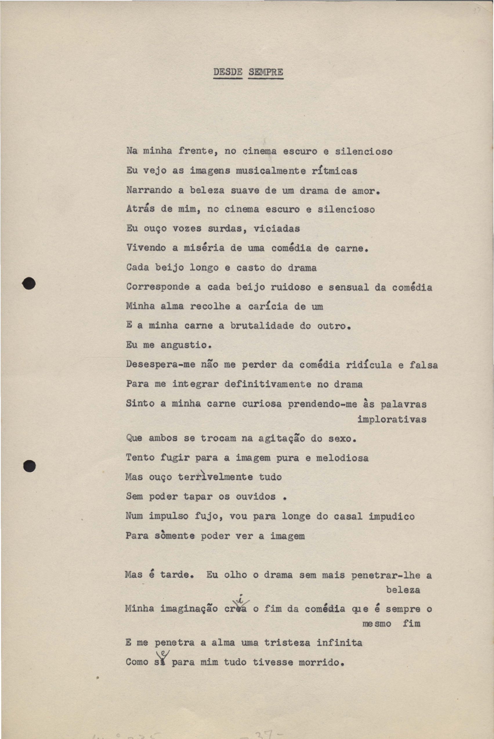 Este documento faz parte do dossiê VMPI235, que contempla poemas datados entre 17 ago. 1932 e 11 ago. 1933, publicados no livro O caminho para a distância. Inclui recortes de alguns poemas impressos da 1ª edição com correções manuscritas.