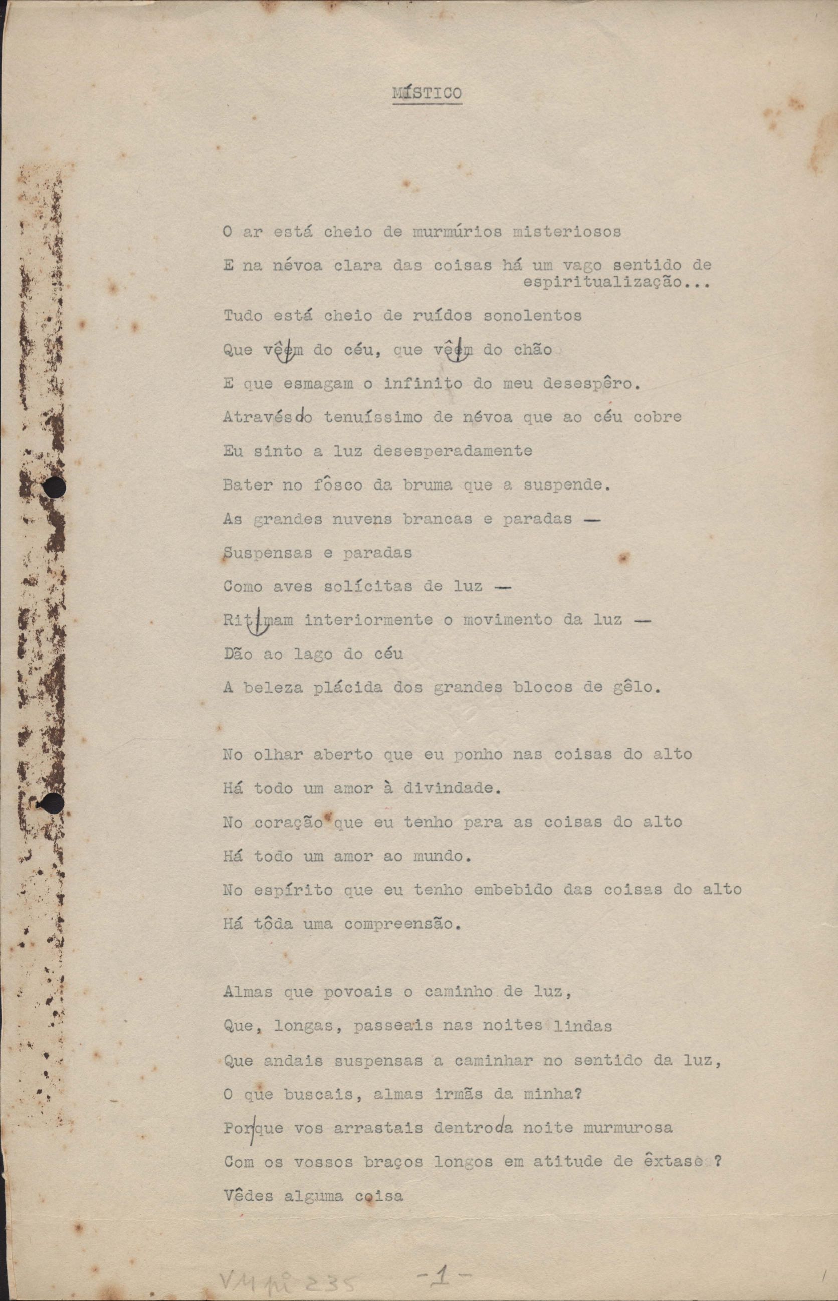 Este documento faz parte do dossiê VMPI235, que contempla poemas datados entre 17 ago. 1932 e 11 ago. 1933, publicados no livro O caminho para a distância. Inclui recortes de alguns poemas impressos da 1ª edição com correções manuscritas.