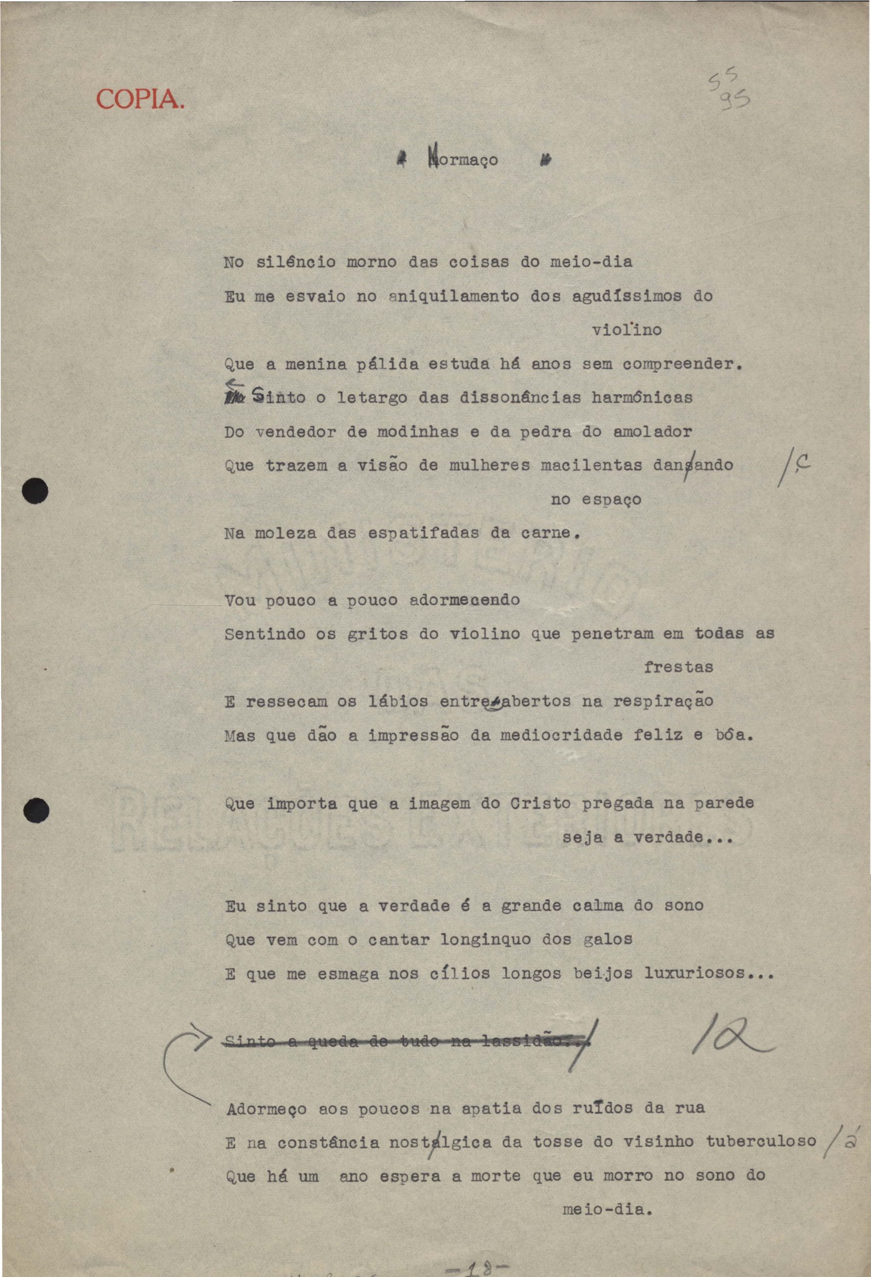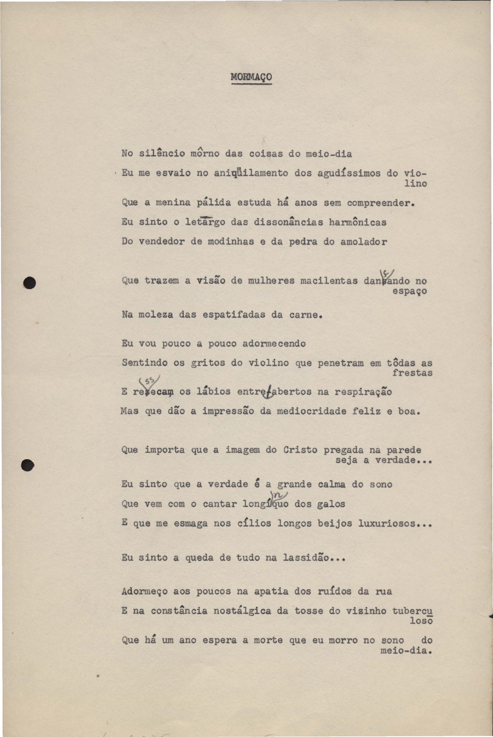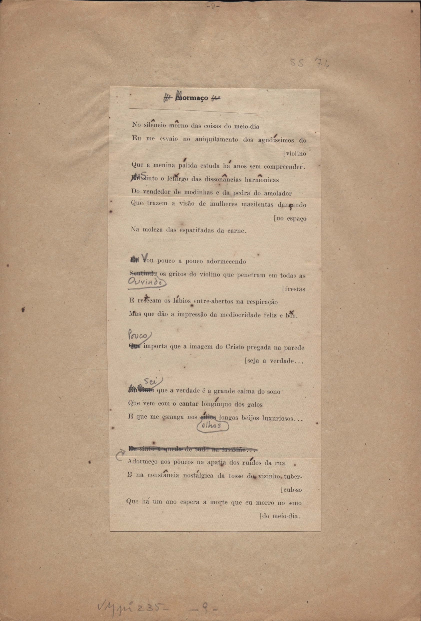 Este documento faz parte do dossiê VMPI235, que contempla poemas datados entre 17 ago. 1932 e 11 ago. 1933, publicados no livro O caminho para a distância. Inclui recortes de alguns poemas impressos da 1ª edição com correções manuscritas.
