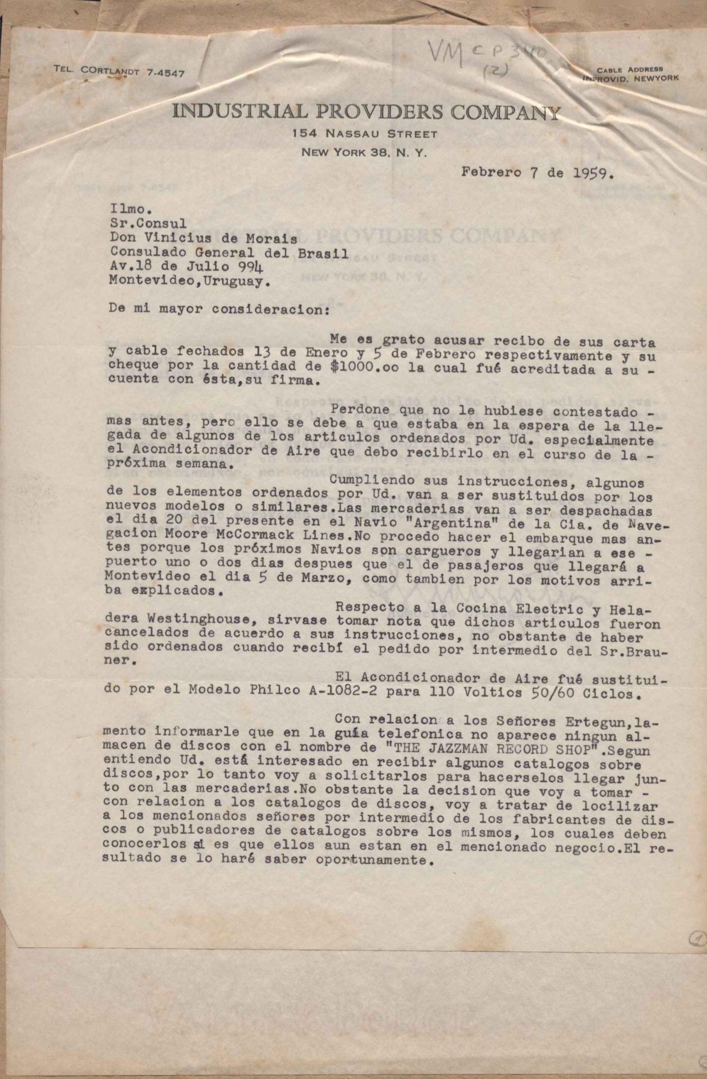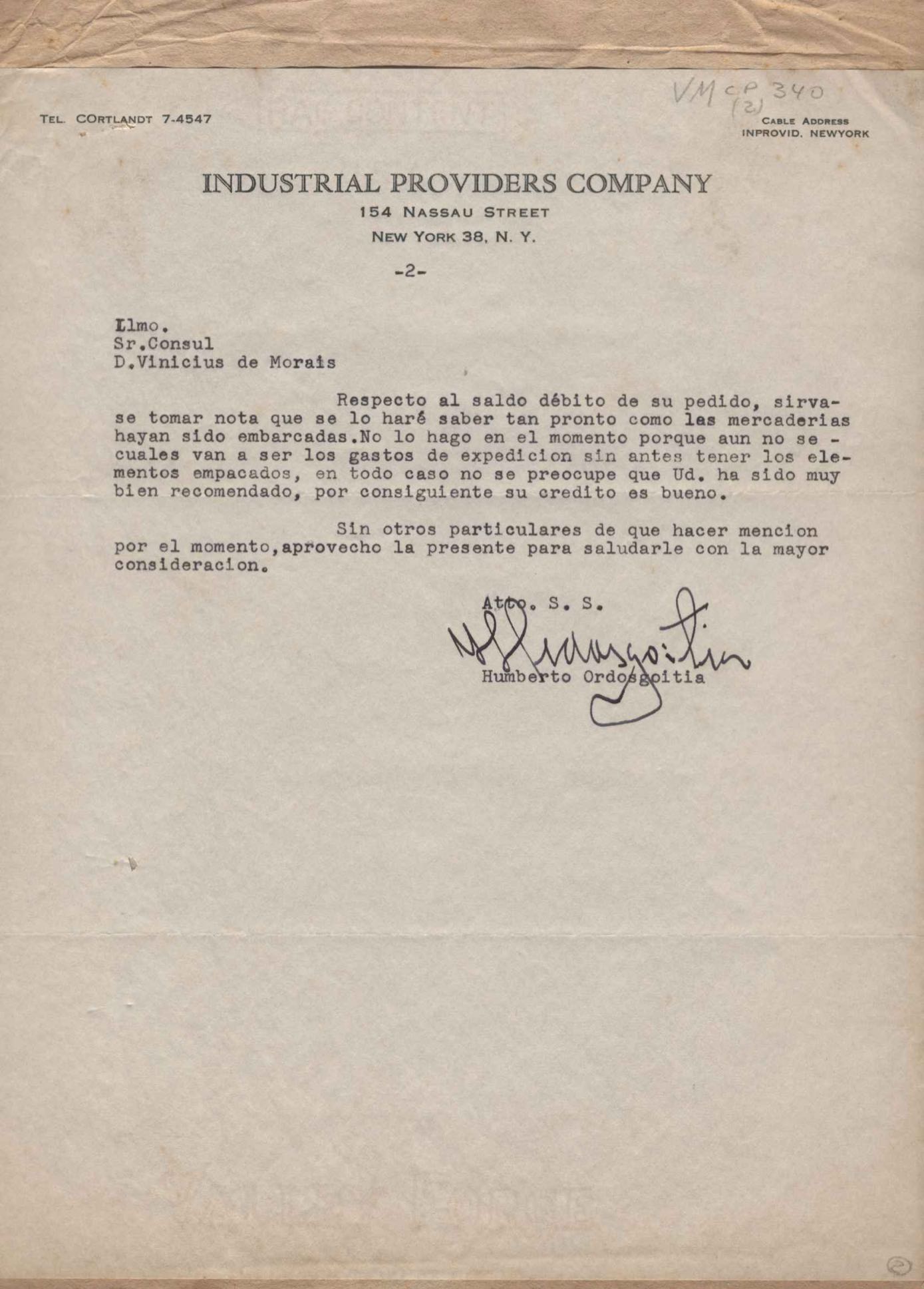 Comunicado de que estão sendo despachadas por navio as mercadorias solicitadas por VM.