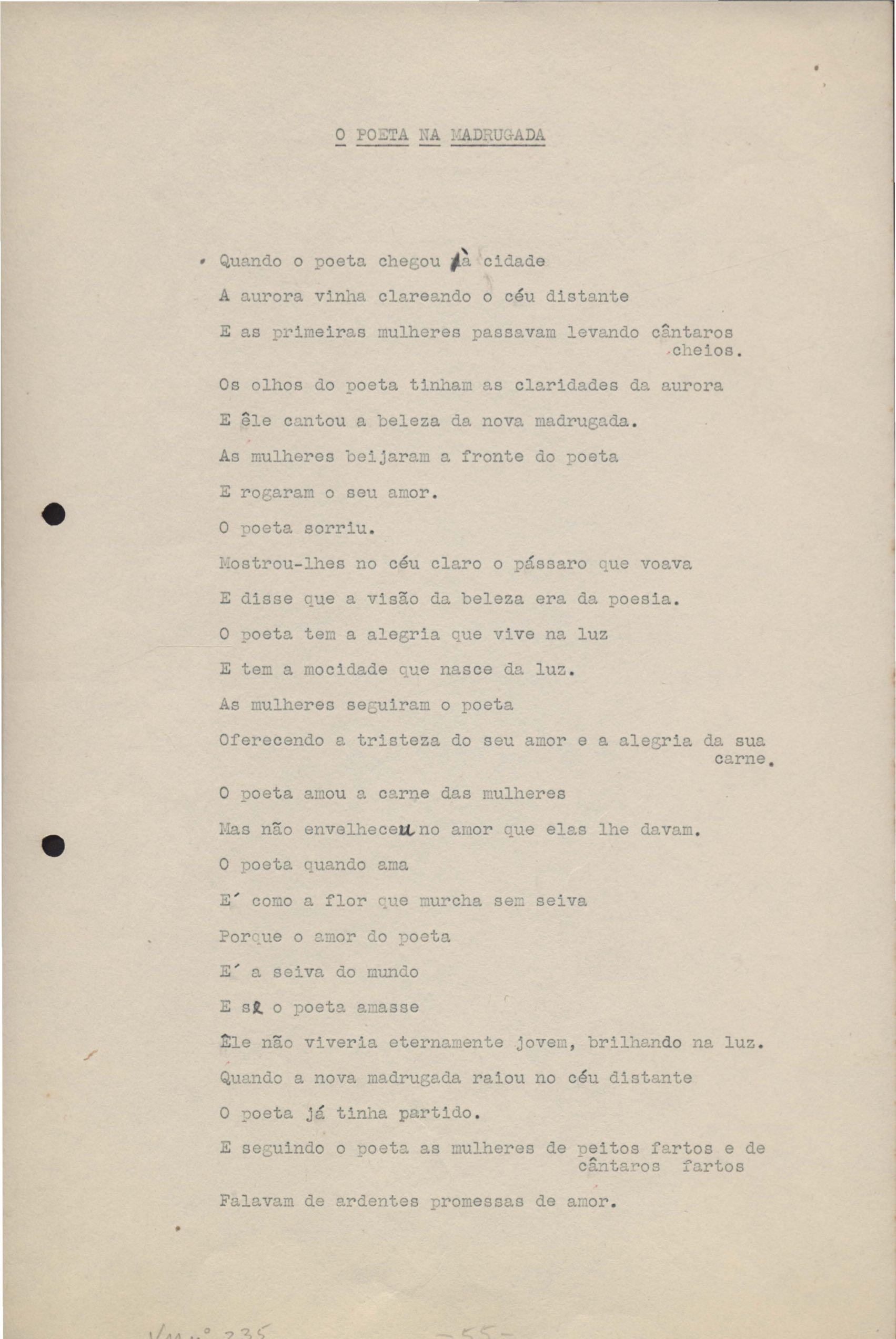 Este documento faz parte do dossiê VMPI235, que contempla poemas datados entre 17 ago. 1932 e 11 ago. 1933, publicados no livro O caminho para a distância. Inclui recortes de alguns poemas impressos da 1ª edição com correções manuscritas.