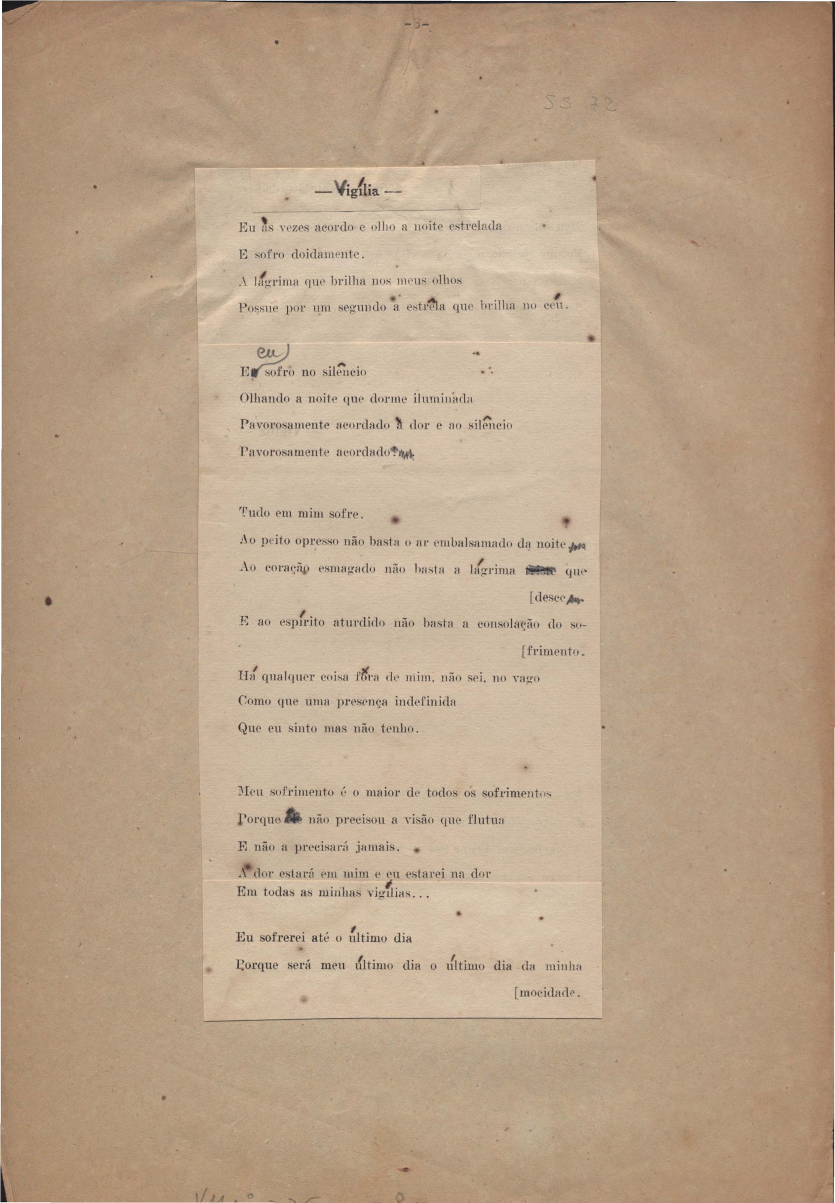 Este documento faz parte do dossiê VMPI235, que contempla poemas datados entre 17 ago. 1932 e 11 ago. 1933, publicados no livro O caminho para a distância. Inclui recortes de alguns poemas impressos da 1ª edição com correções manuscritas.