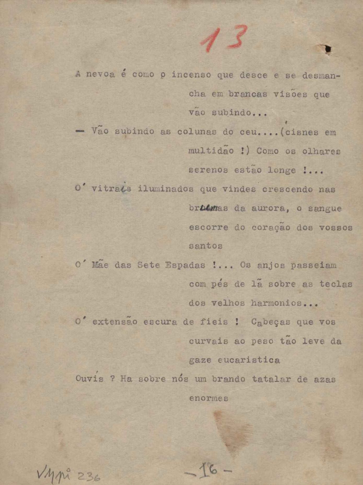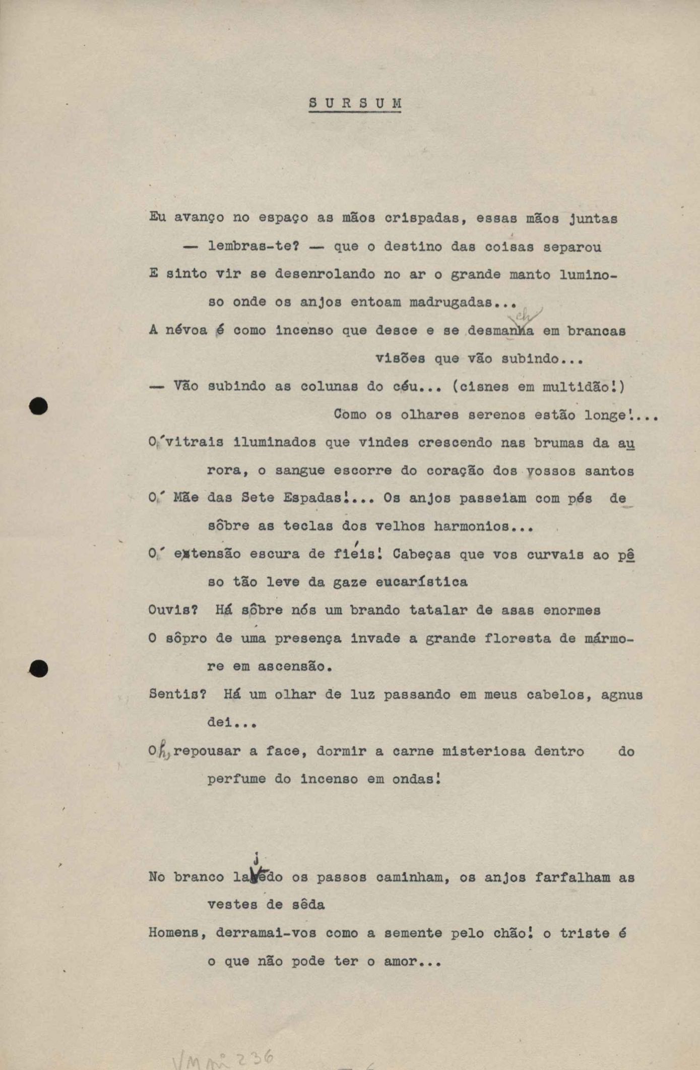 Este documento faz parte do dossiê VMPI236, que contempla poemas datados entre 22 out. 1932 e 20 out. 1938, publicados no livro Forma e exegese. Inclui o datiloscrito que serviu de base à primeira edição.
