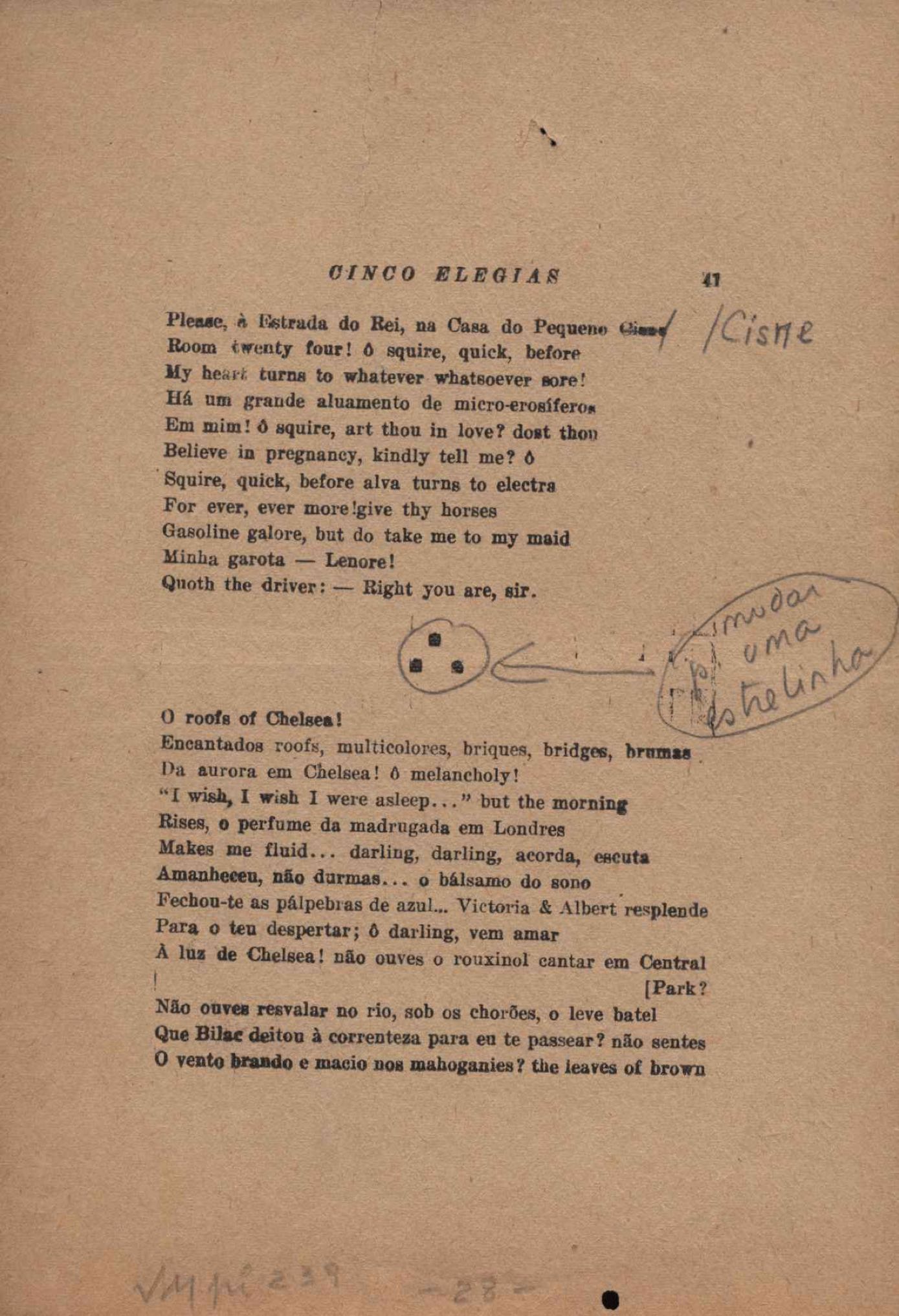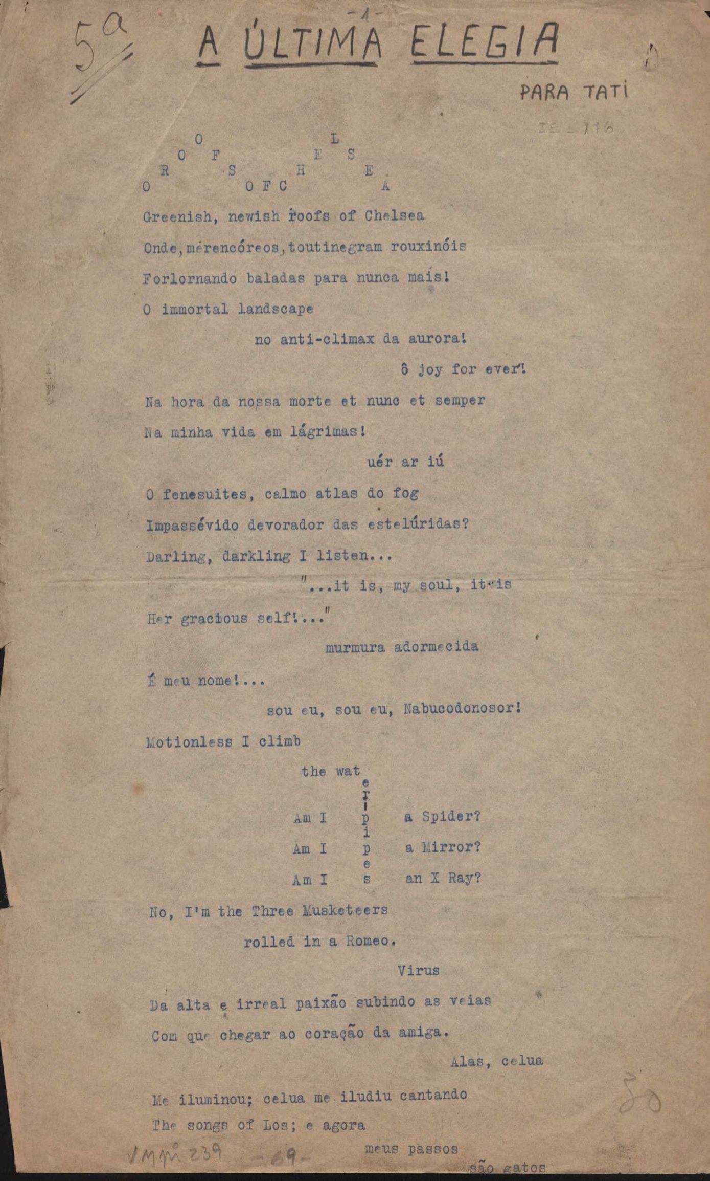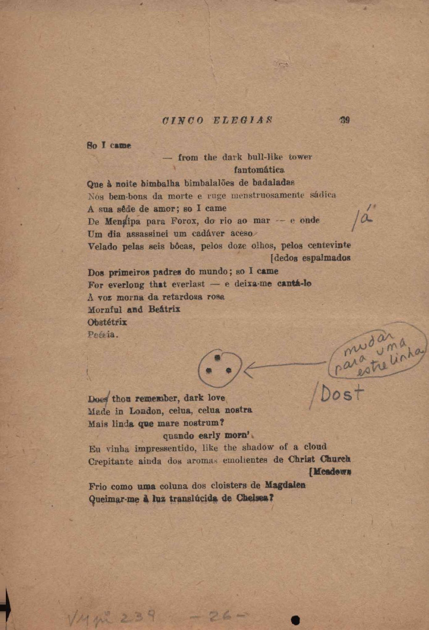 Este documento faz parte do dossiê VMPI239, que contempla poemas datados entre ago. 1937 e nov. 1943, publicados no livro Cinco elegias. Inclui prova tipográfica da primeira edição (incompleta) e outras versões manuscritas e datilografadas dos poemas, além de um prefácio.