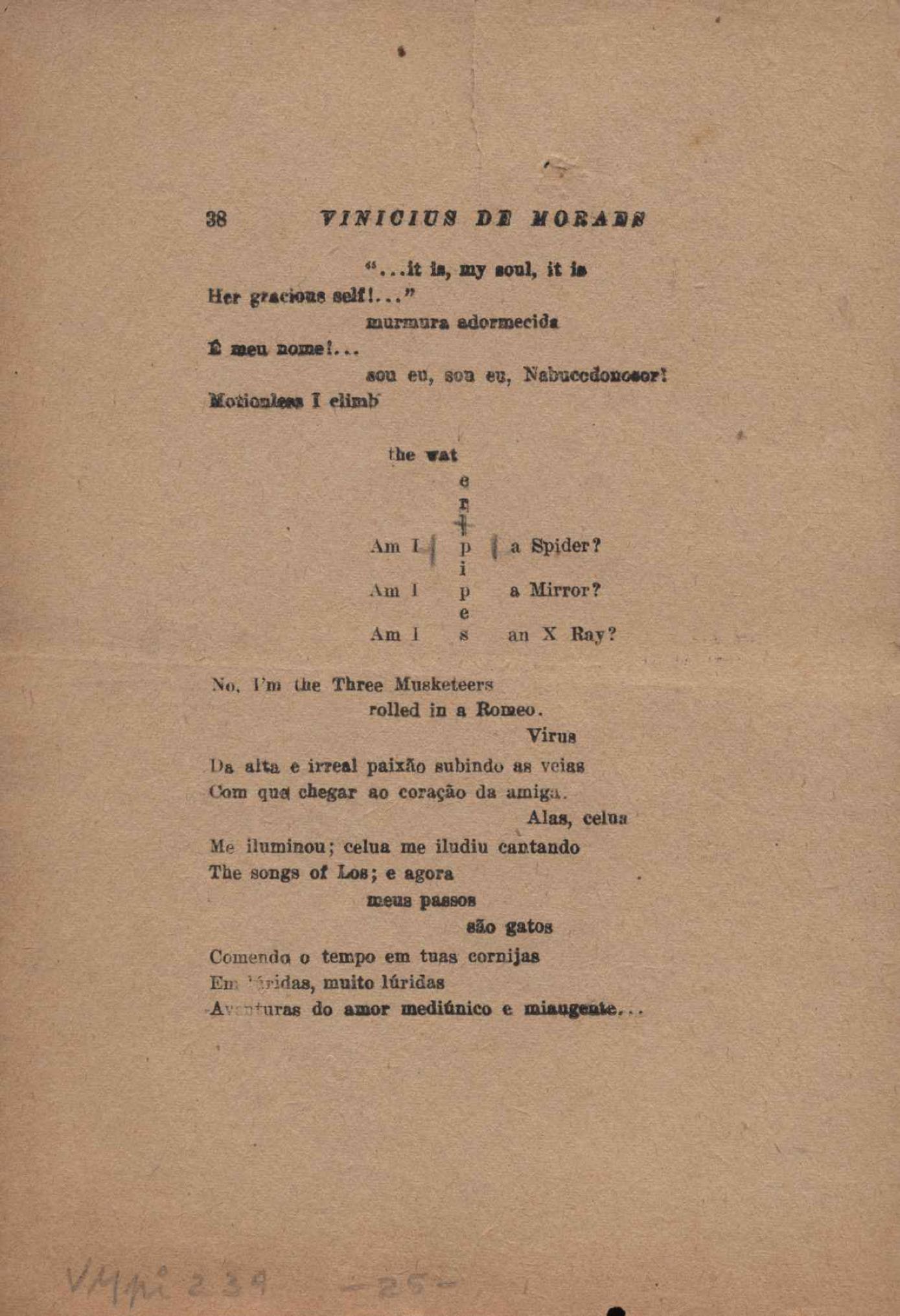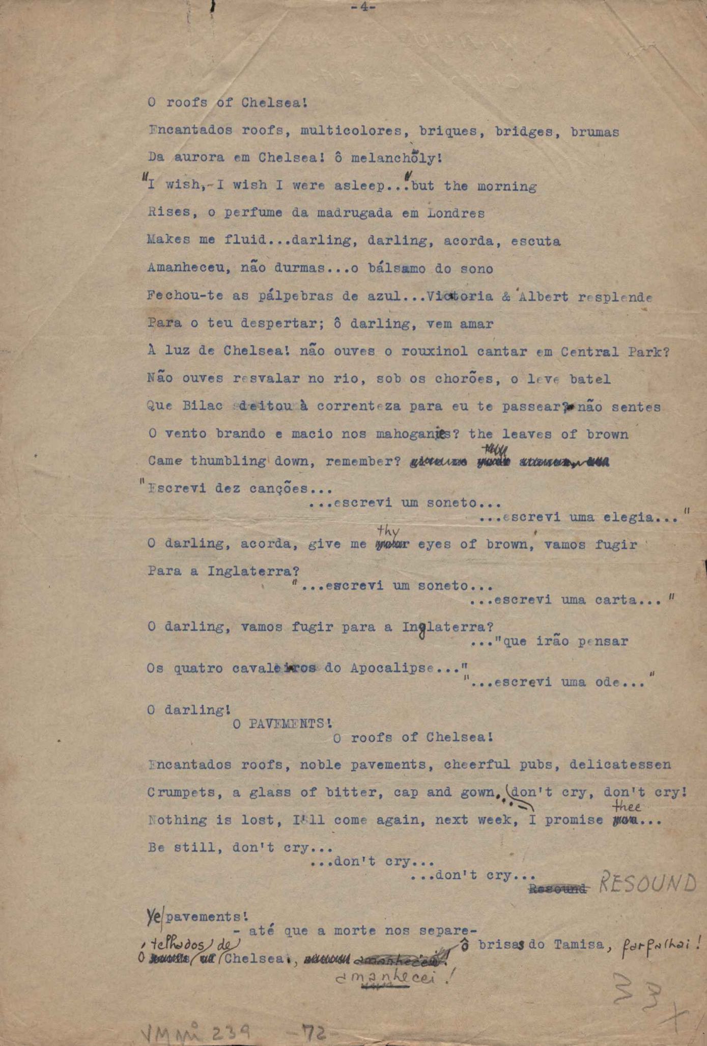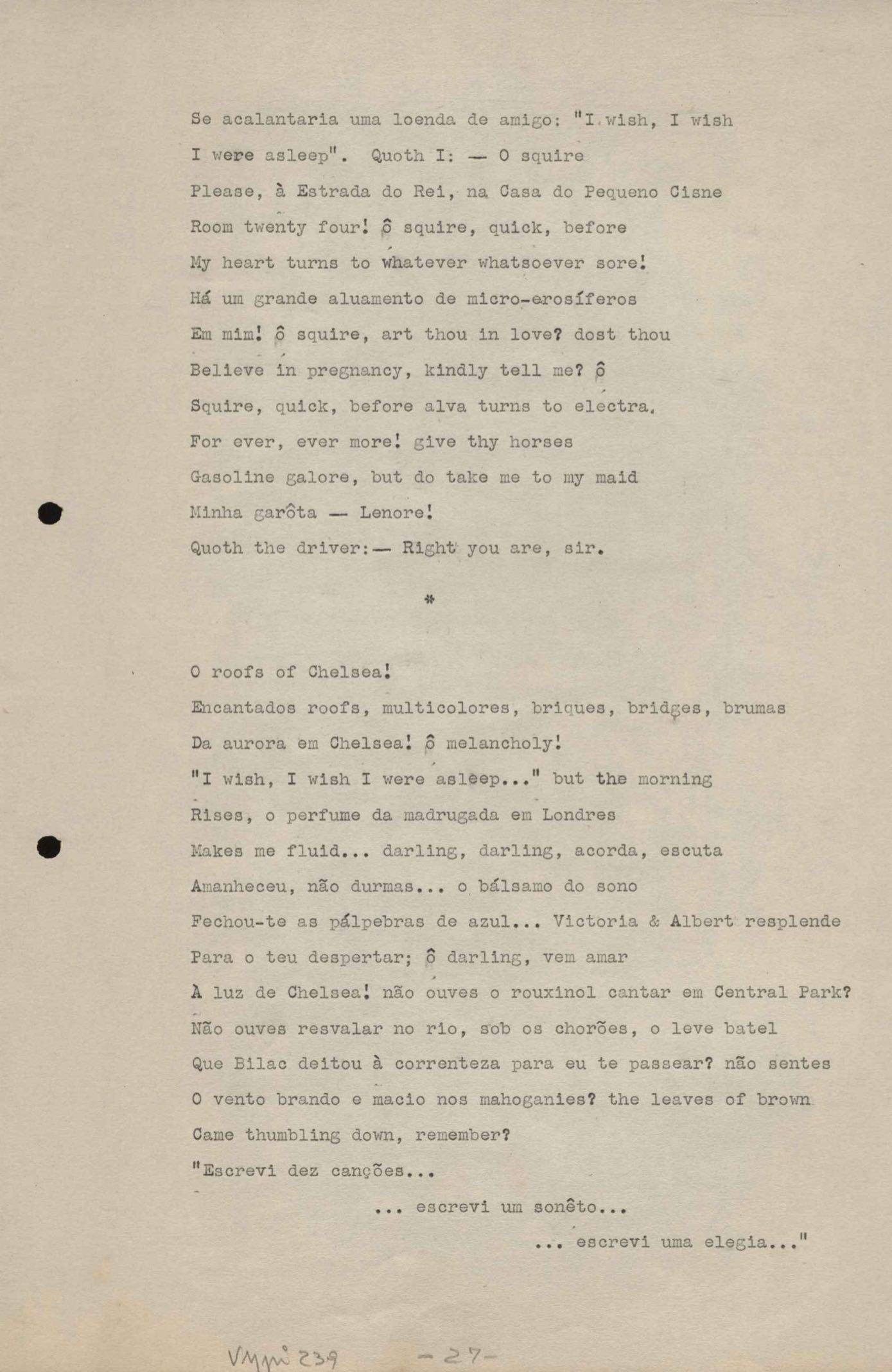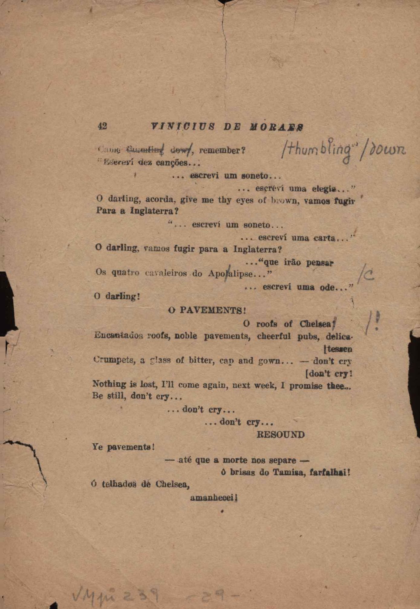 Este documento faz parte do dossiê VMPI239, que contempla poemas datados entre ago. 1937 e nov. 1943, publicados no livro Cinco elegias. Inclui prova tipográfica da primeira edição (incompleta) e outras versões manuscritas e datilografadas dos poemas, além de um prefácio.