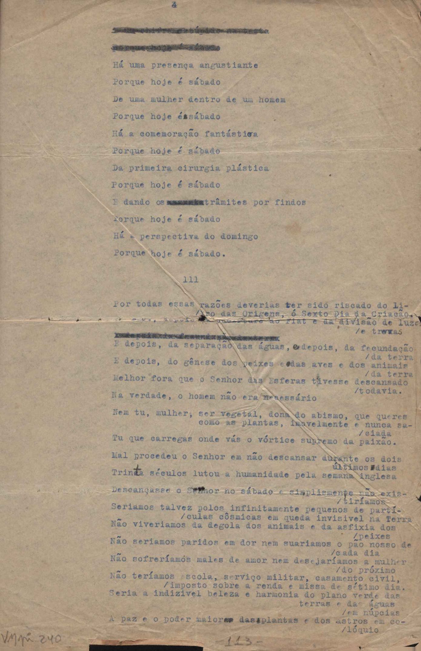 Este documento faz parte do dossiê VMPI240, que contempla poemas datados entre maio 1935 e 3 nov. 1942, publicados no livro Poemas, sonetos e baladas. Inclui prova tipográfica da primeira edição (incompleta) e outras versões manuscritas e datilografadas, algumas com emendas.