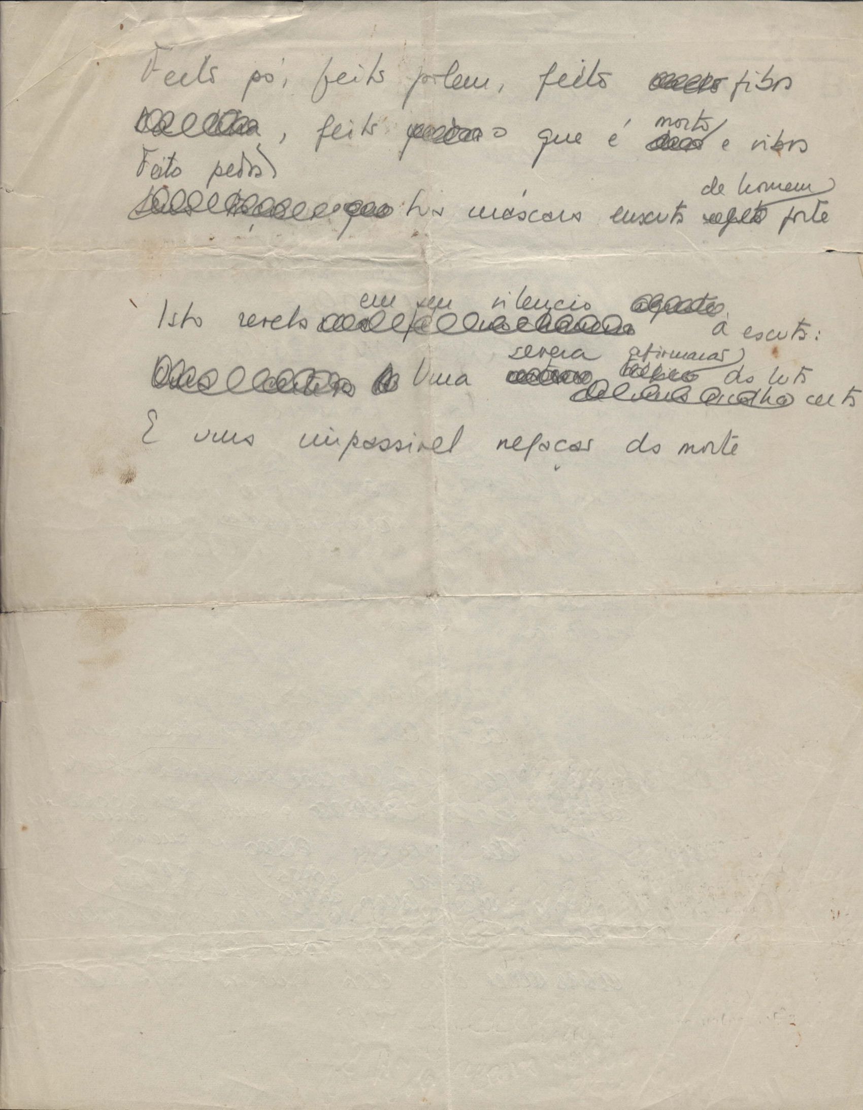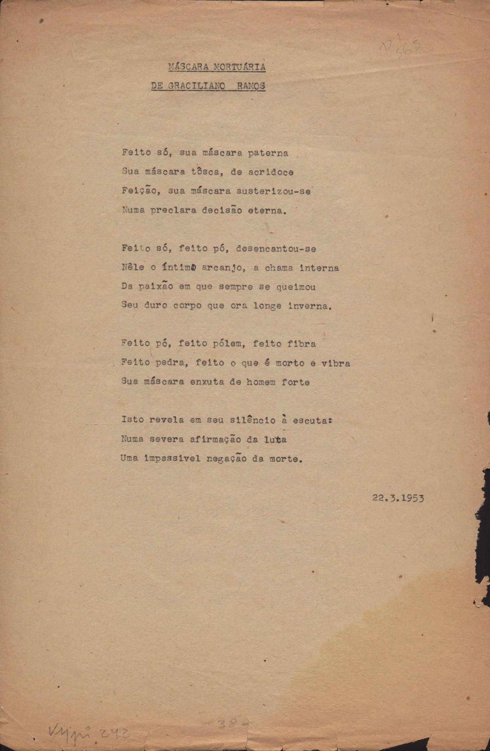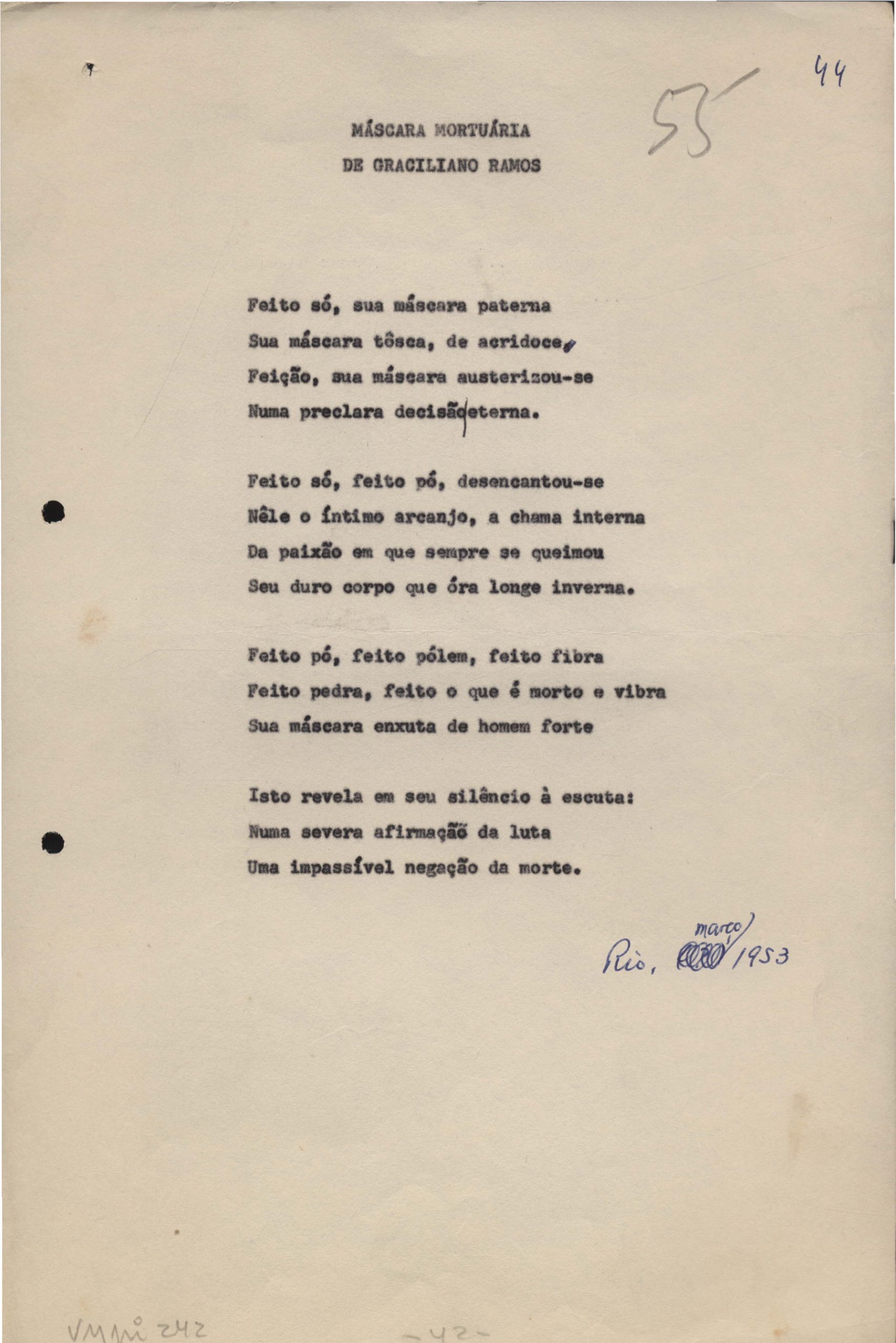 Este documento faz parte do dossiê VMPI242, que contempla poemas datados entre 1936 e 1965, publicados no Livro de sonetos. Inclui versões manuscritas e datilografadas, algumas com emendas.