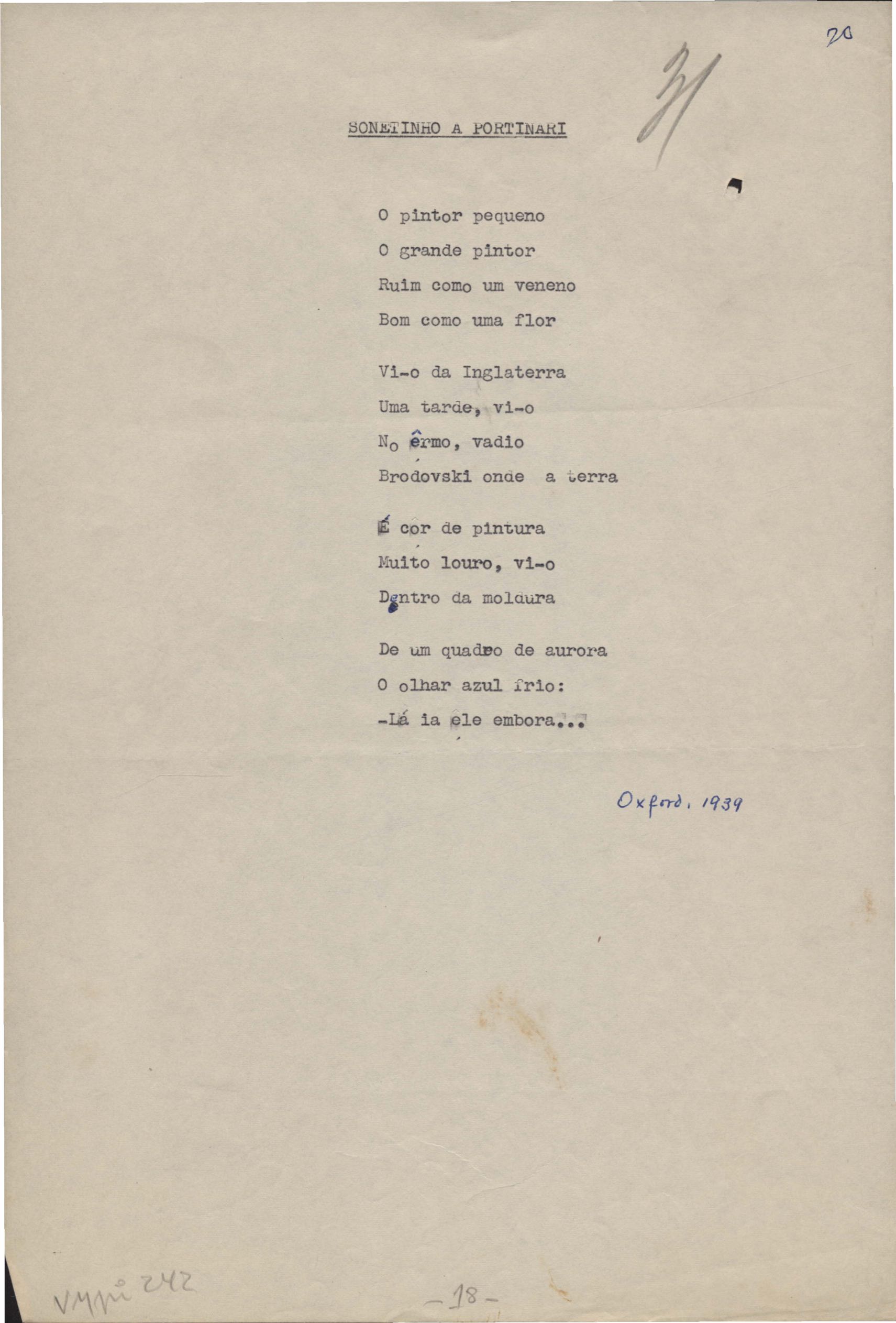 Este documento faz parte do dossiê VMPI242, que contempla poemas datados entre 1936 e 1965, publicados no Livro de sonetos. Inclui versões manuscritas e datilografadas, algumas com emendas.