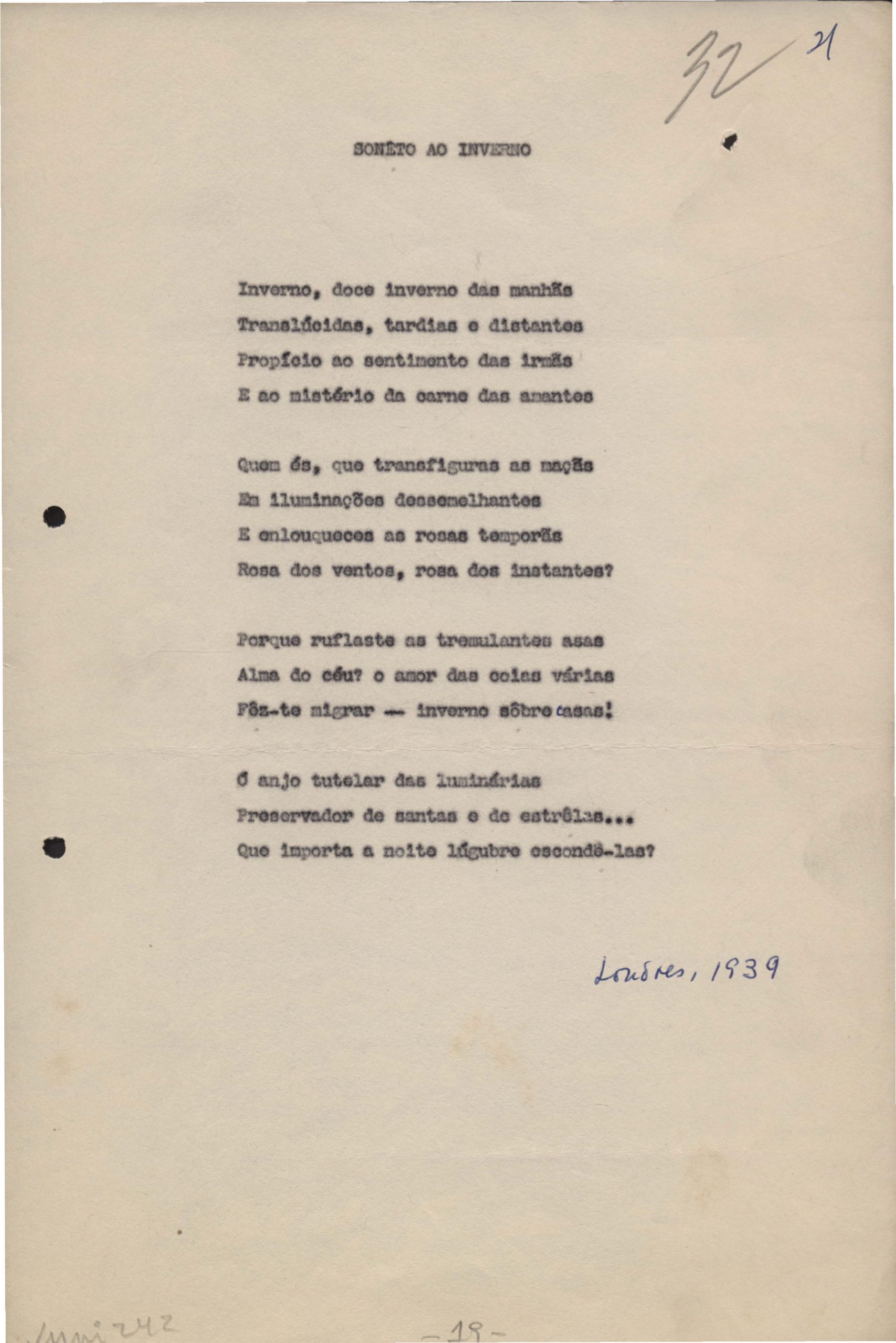 Este documento faz parte do dossiê VMPI242, que contempla poemas datados entre 1936 e 1965, publicados no Livro de sonetos. Inclui versões manuscritas e datilografadas, algumas com emendas.