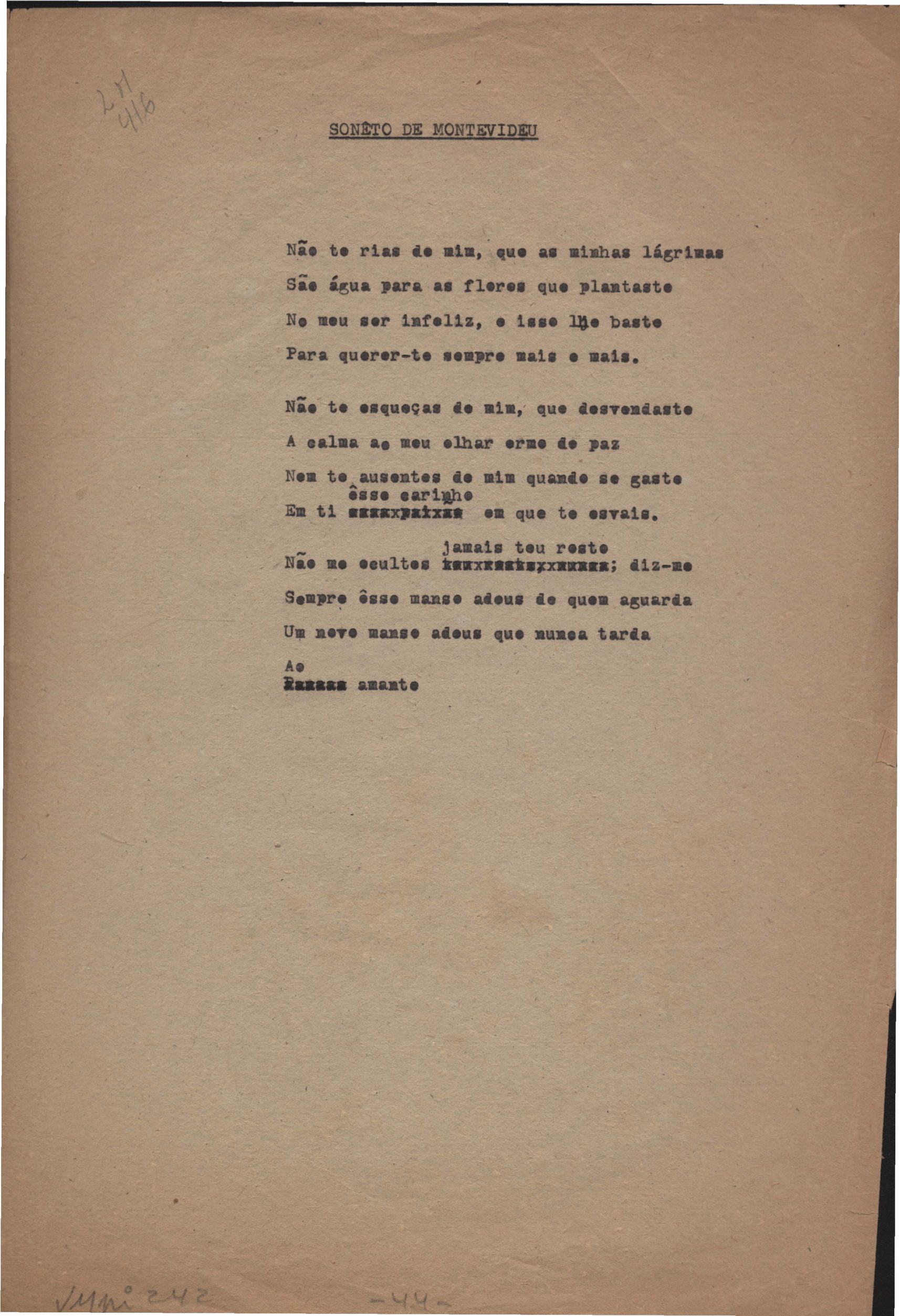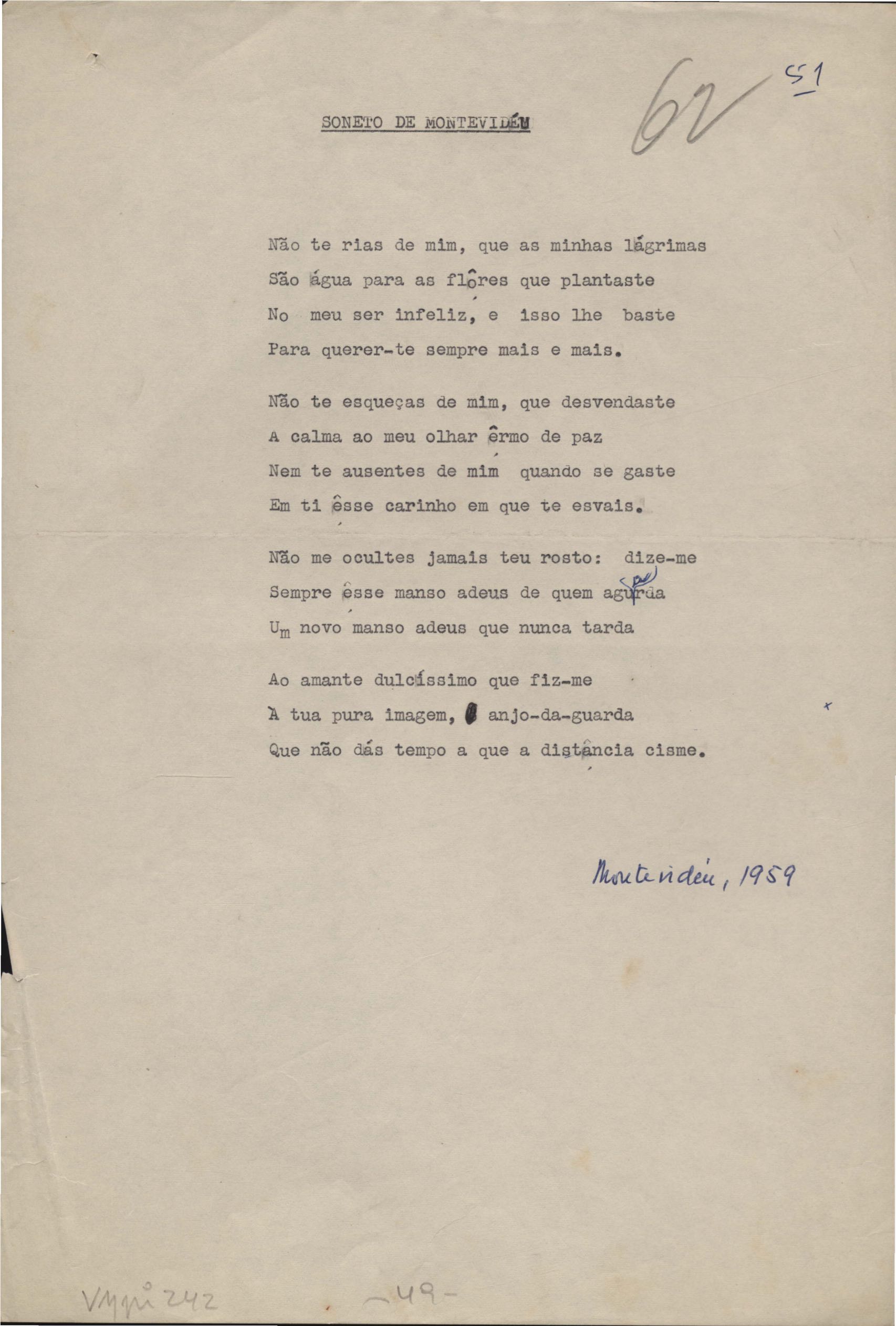 Este documento faz parte do dossiê VMPI242, que contempla poemas datados entre 1936 e 1965, publicados no Livro de sonetos. Inclui versões manuscritas e datilografadas, algumas com emendas.