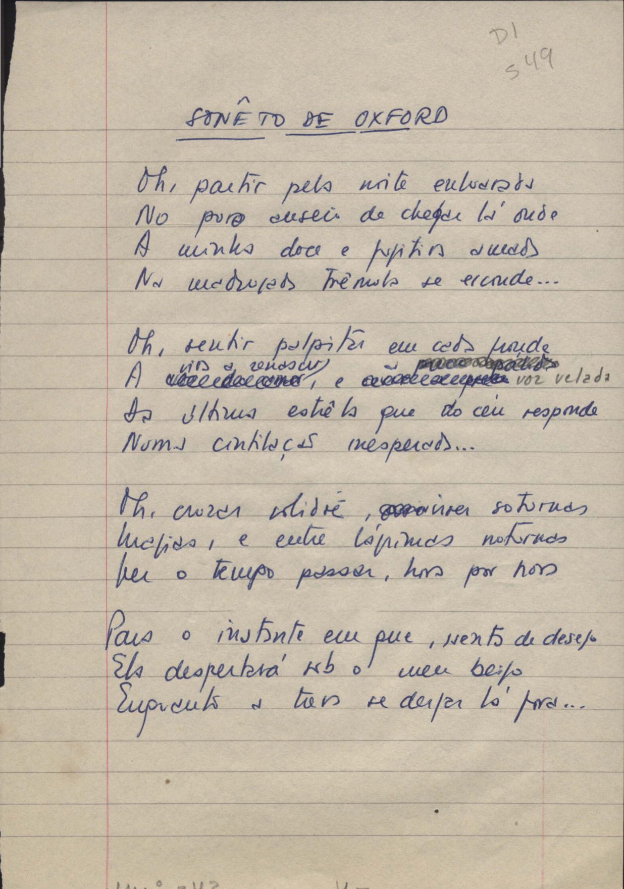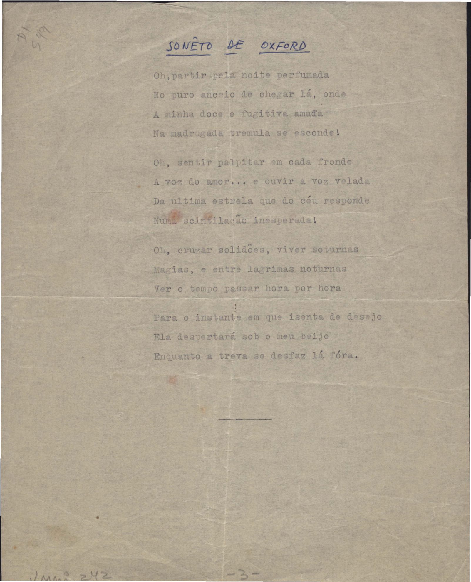 Este documento faz parte do dossiê VMPI242, que contempla poemas datados entre 1936 e 1965, publicados no Livro de sonetos. Inclui versões manuscritas e datilografadas, algumas com emendas.