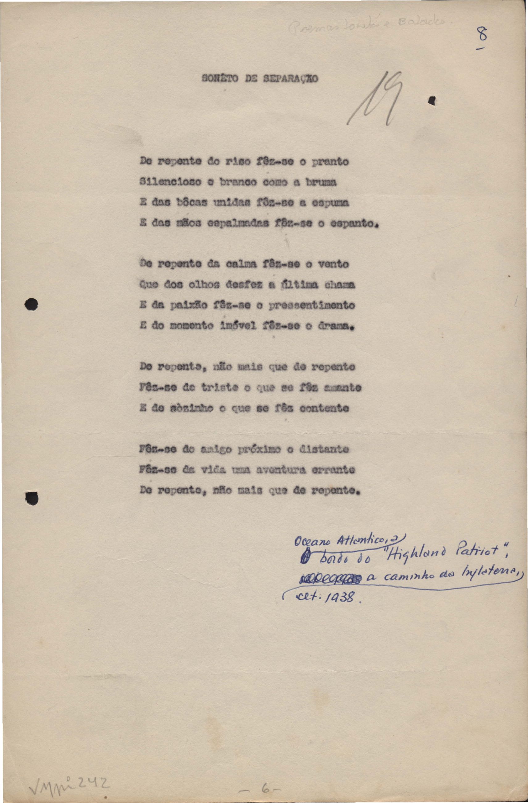 Este documento faz parte do dossiê VMPI242, que contempla poemas datados entre 1936 e 1965, publicados no Livro de sonetos. Inclui versões manuscritas e datilografadas, algumas com emendas.