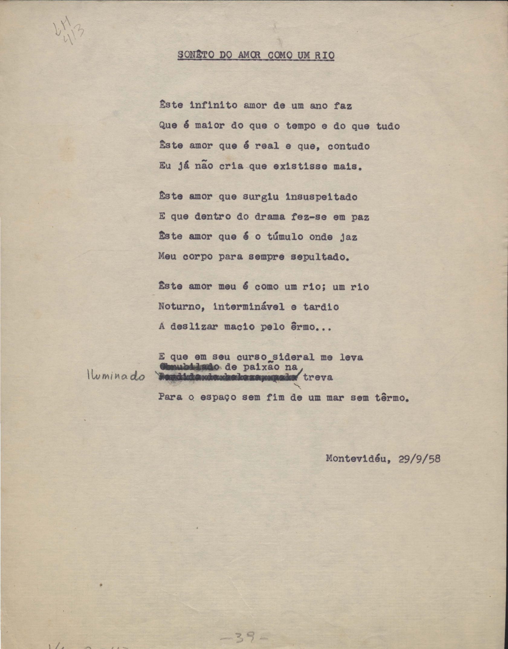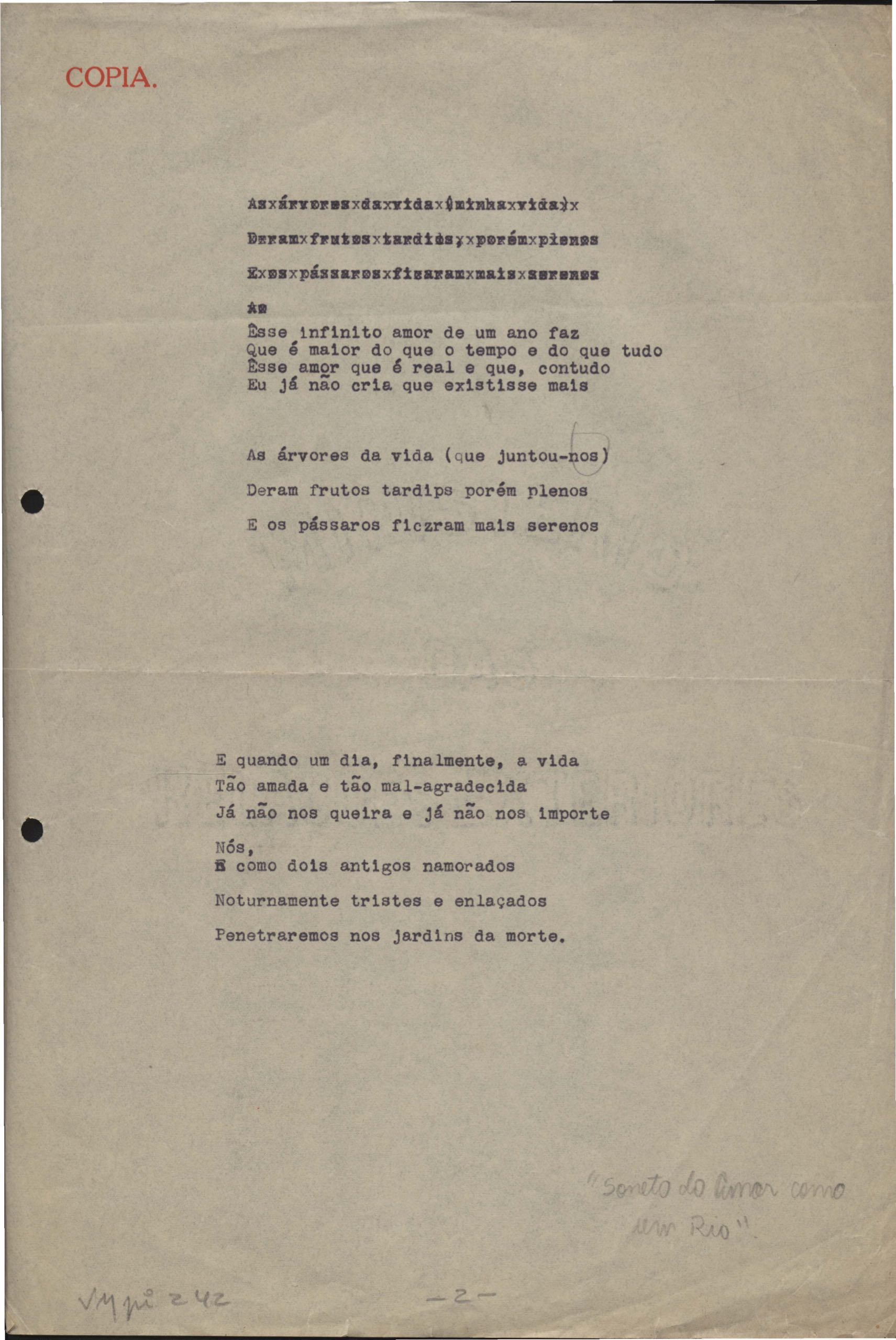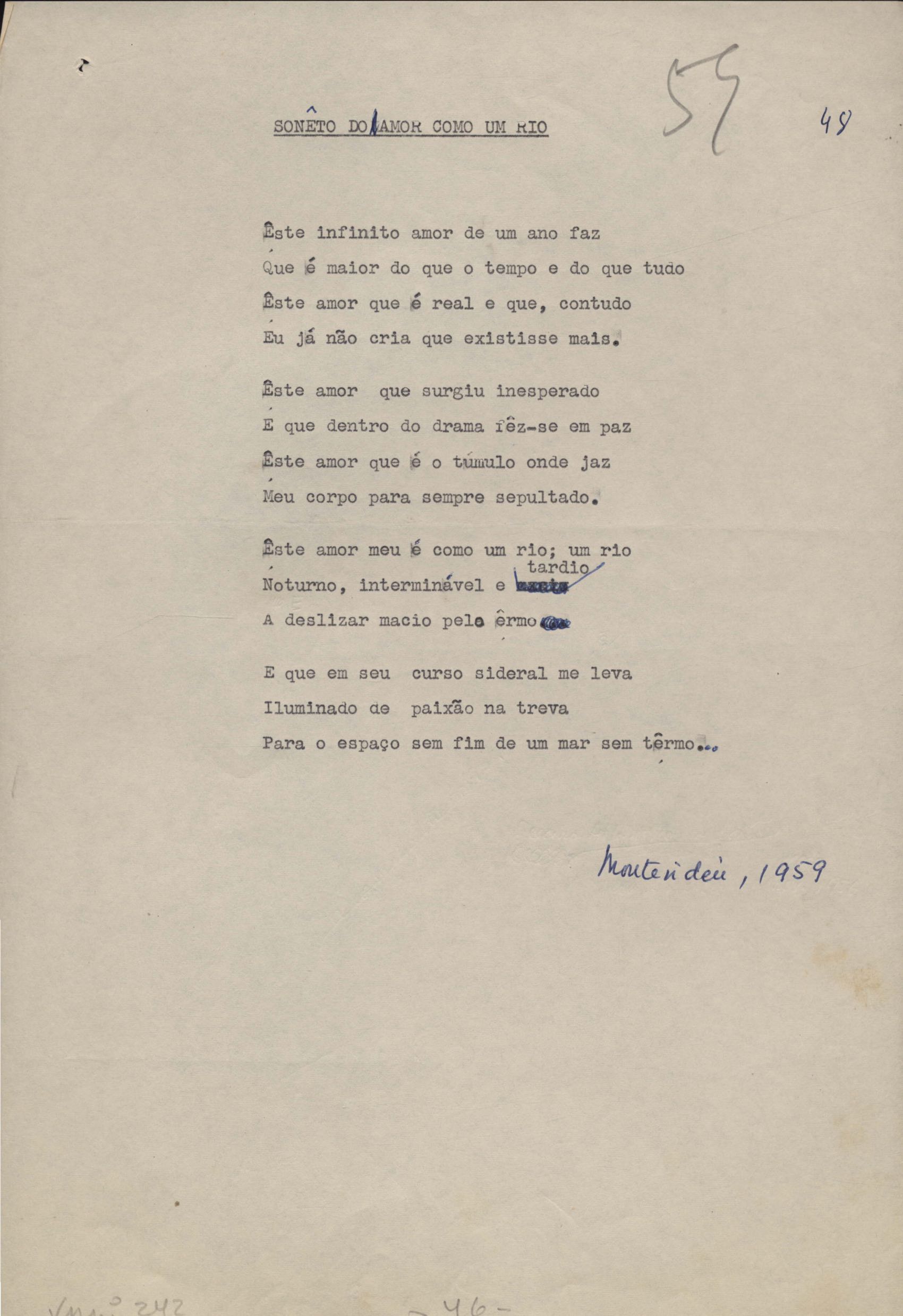 Este documento faz parte do dossiê VMPI242, que contempla poemas datados entre 1936 e 1965, publicados no Livro de sonetos. Inclui versões manuscritas e datilografadas, algumas com emendas.