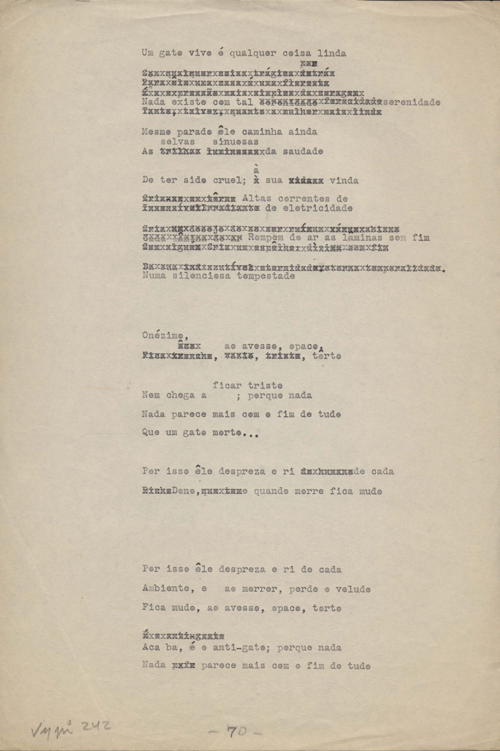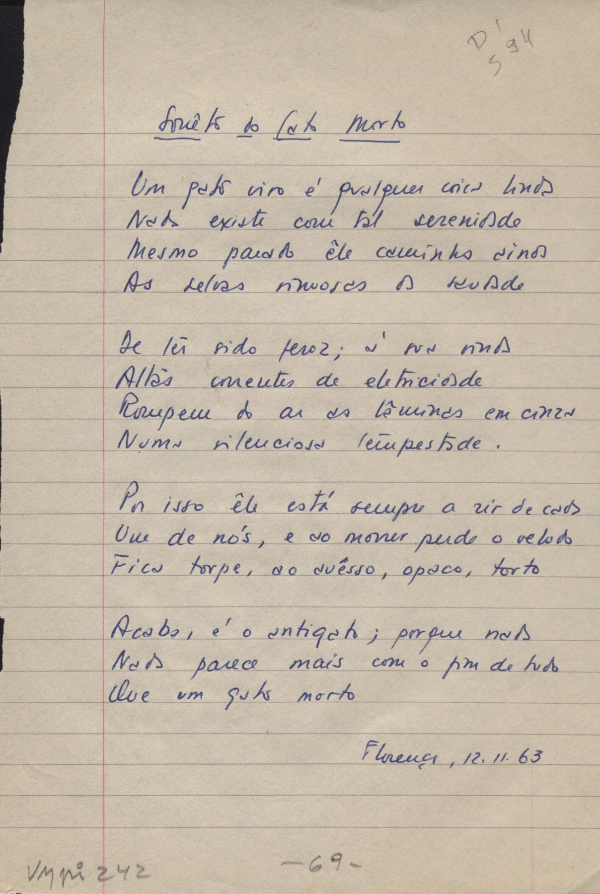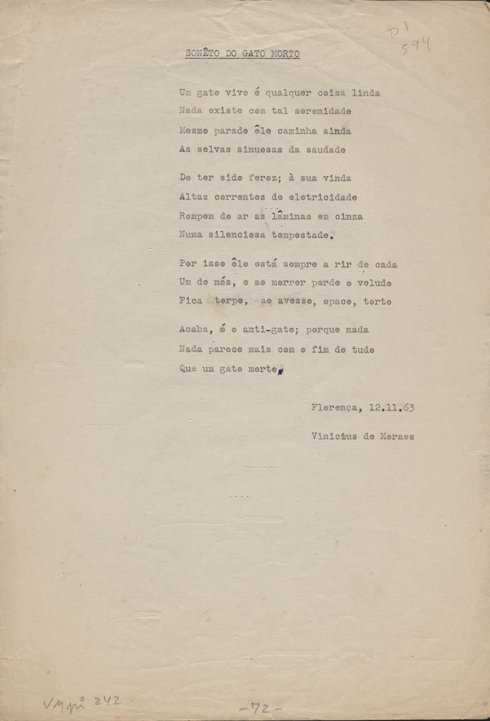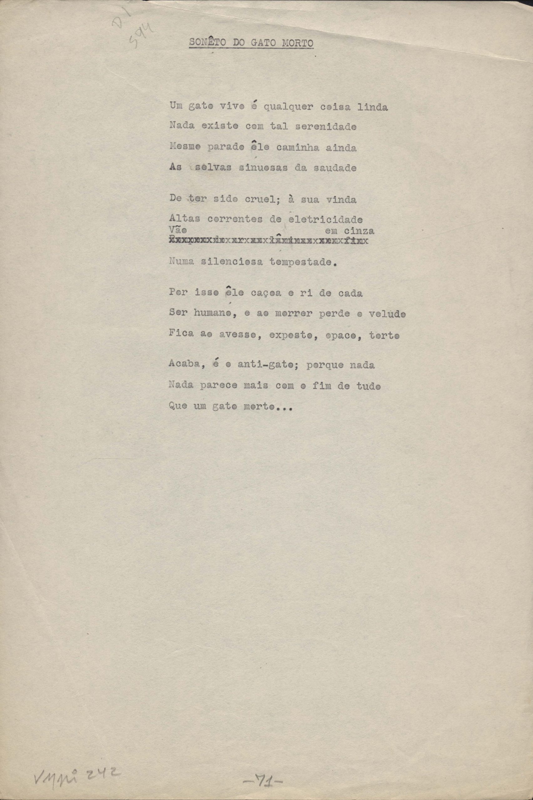 Este documento faz parte do dossiê VMPI242, que contempla poemas datados entre 1936 e 1965, publicados no Livro de sonetos. Inclui versões manuscritas e datilografadas, algumas com emendas.