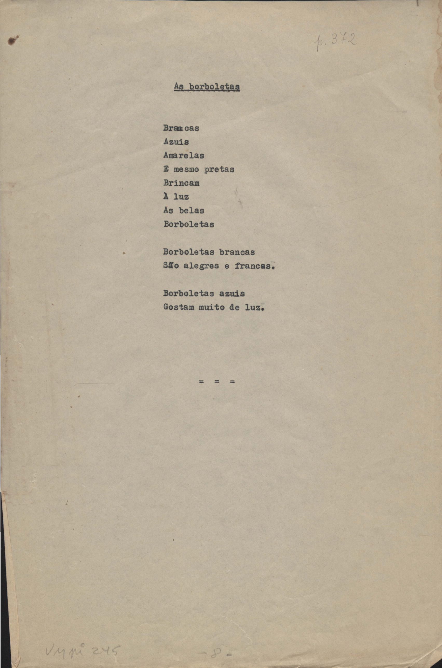 Este documento faz parte do dossiê VMPI245, que contempla poemas não datados, publicados no livro A arca de Noé. Inclui outras versões manuscritas e datilografadas.