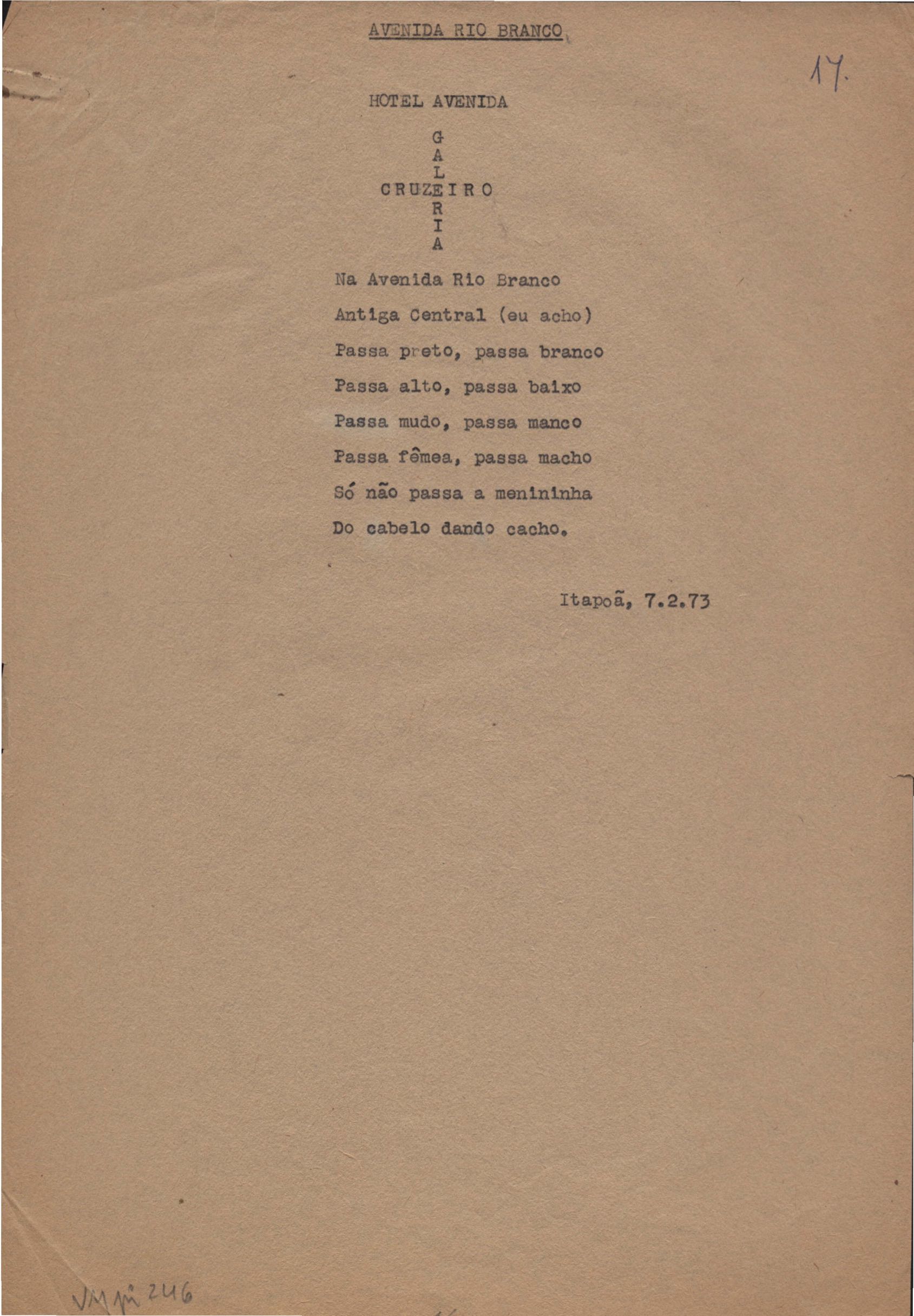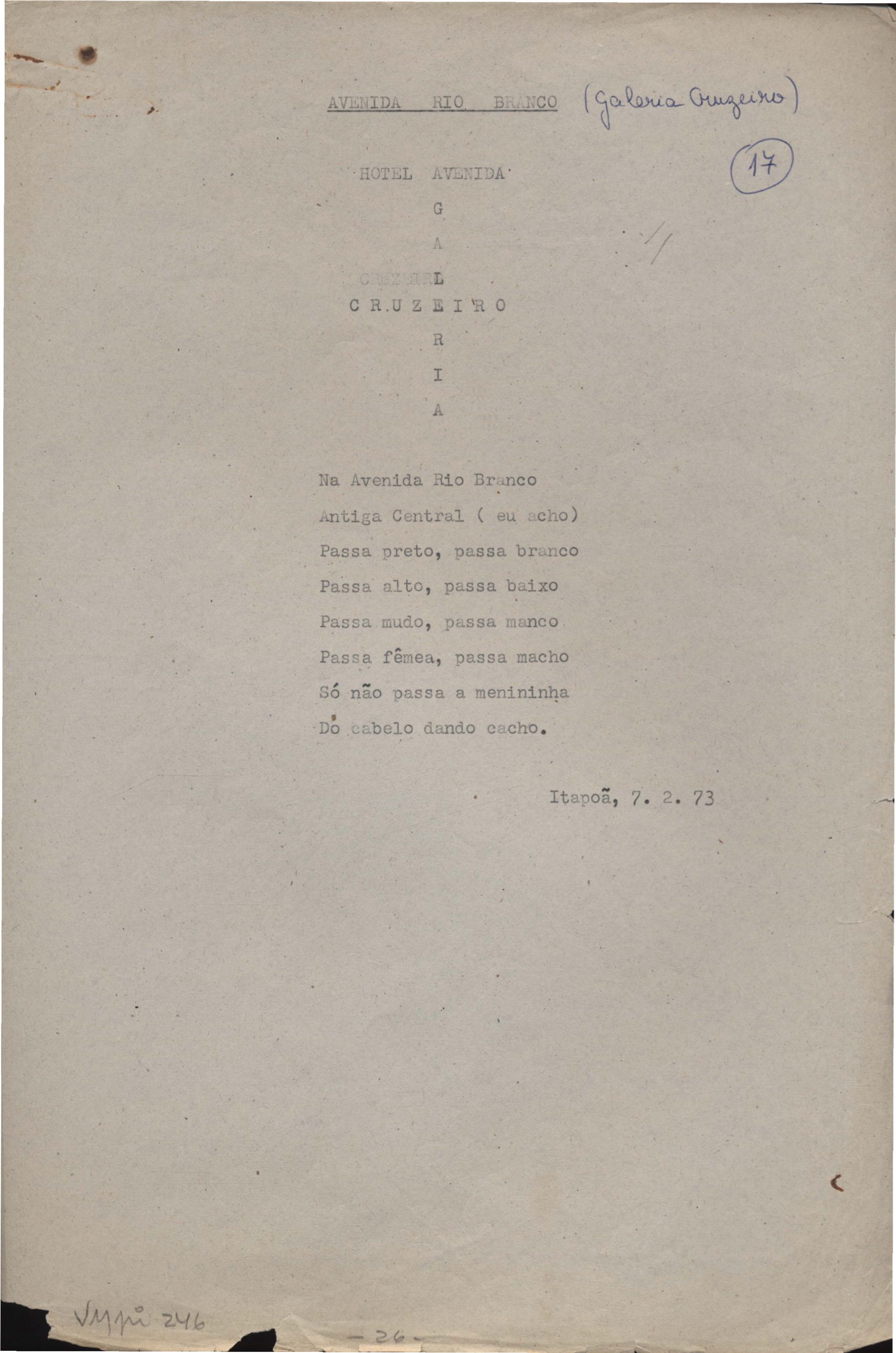Este documento faz parte do dossiê VMPI246, que contempla poemas datados entre 1949 e 10 fev. 1973, publicados no livro Roteiro lírico e sentimental da cidade de São Sebastião do Rio de Janeiro, onde nasceu, vive em trânsito e morre de amor o poeta Vinicius de Moraes. Inclui prova tipográfica e outras versões manuscritas e datilografadas.